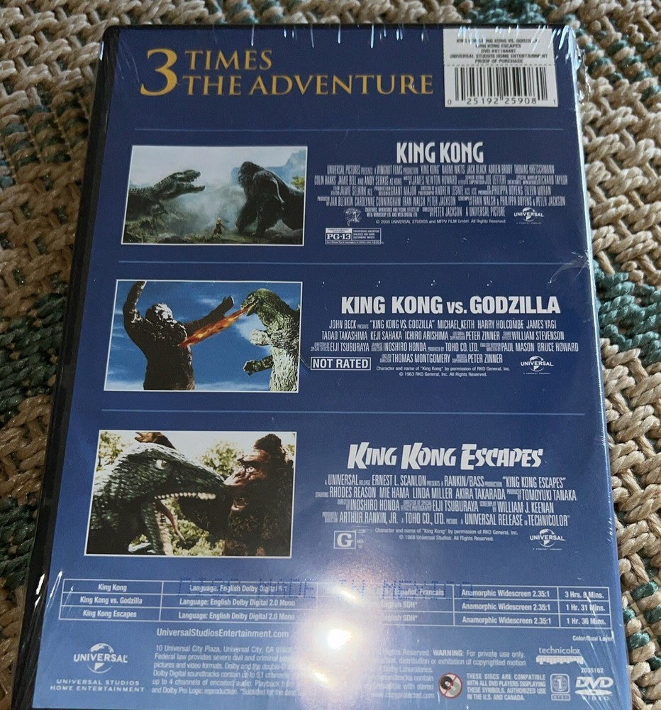 Immerse yourself in an epic battle between two giant movie monsters with this vintage Universal King Kong vs. Godzilla Escapes Movie DVD Movie Rare Set Lot. Directed by Peter Jackson and starring Andy Serkis, Jack Black, and Adrien Brody, this action-packed adventure will keep you at the edge of your seat. Rated PG-13 and released in 2014, this DVD comes in a tall/DVD case and includes English, French, and Spanish subtitle options. This cult classic movie features B-Movie and Supernatural elements, perfect for fans of Horror, Sci-Fi & Fantasy, Adventure, Drama, Thriller & Mystery, and Fantasy genres. The box set edition includes the original 1962 film and is compatible with DVD Region Code 1 (US, Canada...). Buy now and experience the jaw-dropping excitement of King Kong vs. Godzilla.