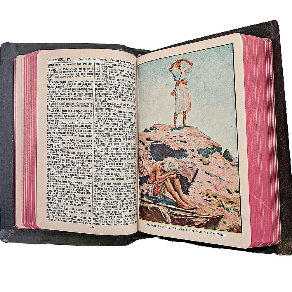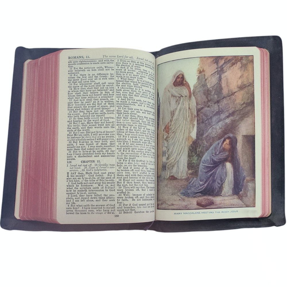 Universal Leather Holy Bible John C Winston International Self Pronouncing 1947 This black leather Kim James Version Holy Bible, published by John C. Winston and the Universal Book and Bible House in 1947, is a vintage and illustrated edition in English. This clean almost 80 year old Bible appears unread and is in remarkable like new condition considering its age. It features self-pronouncing text for ease of reading. Black genuine leather cover with a gold gilded lettering red colored ends of the pages. Original purple ribbon book mark. Many unique colored and sepia illustrations. This Bible, with its classic KJV translation and full color illustrations by W.H. Margetson add a visual element to the narrative making it a unique and meaningful addition to any collection of religious texts. This collectible Bible is a timeless and treasured piece for individuals seeking spiritual enlightenment and religious guidance. Measures 8.5 inches by 6 inches by 1.5 inches thick.