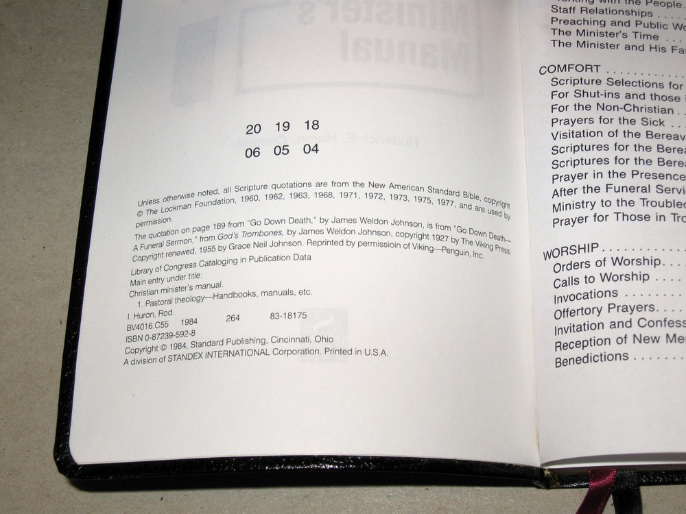 Up for sale is a used very good condition 1984 copy of Christian Minister's Manual by Rod Huron in softback black bonded leather bound format. I downgraded the condition due to a page having a few lines underlined in red ink that can be seen in the pictures posted. The rest of the pages are in like new condition. If you have any questions or would like a different picture not shown of the item feel free to ask. Thank you for looking. --------------------------------------- Item has a 30-day return window. Refund amount will be amount paid for item only, not including original shipping cost. Item must be returned with tracking number and in original condition. Buyer pays return shipping.