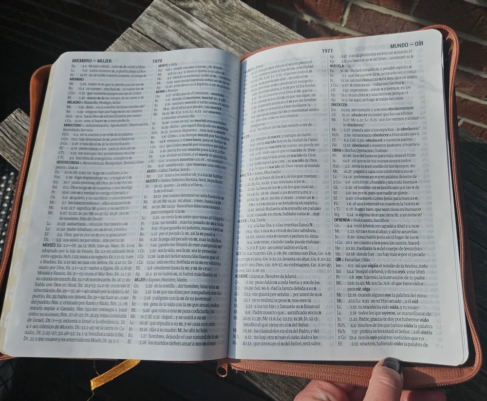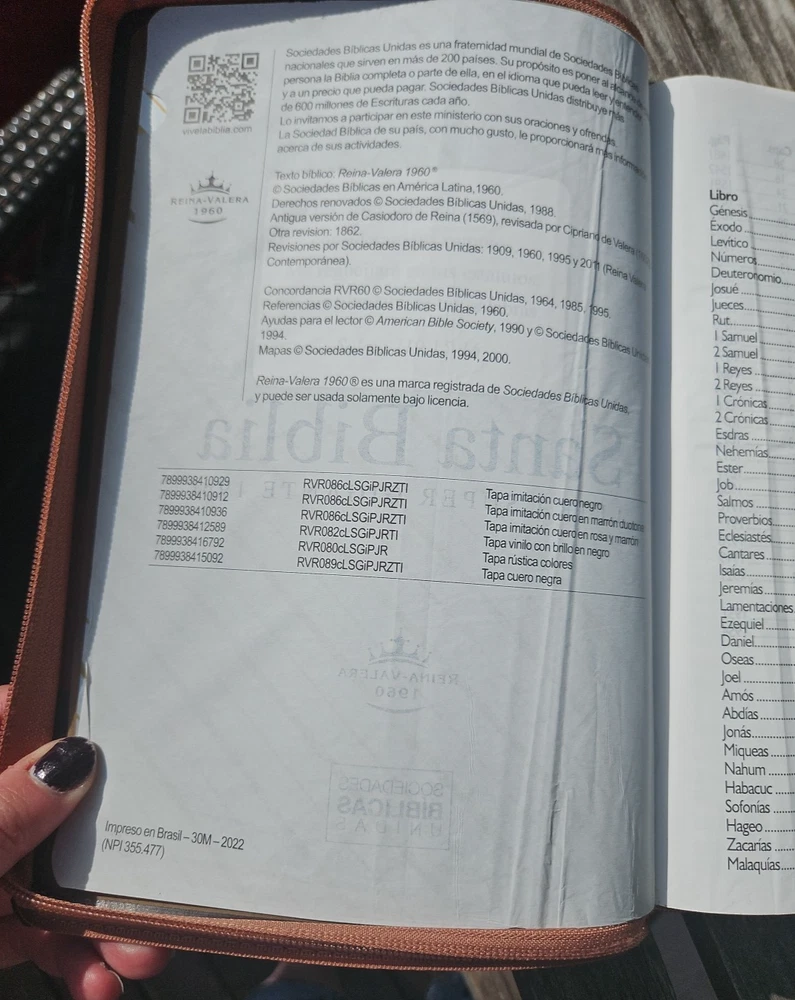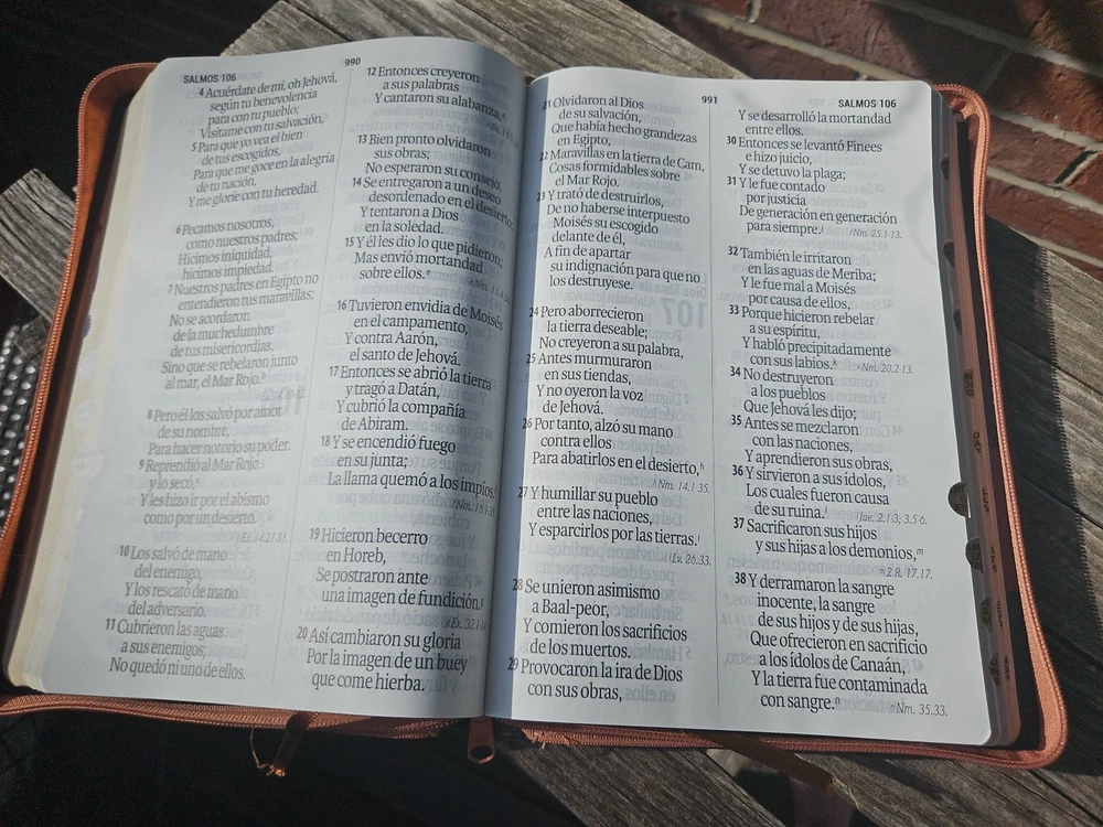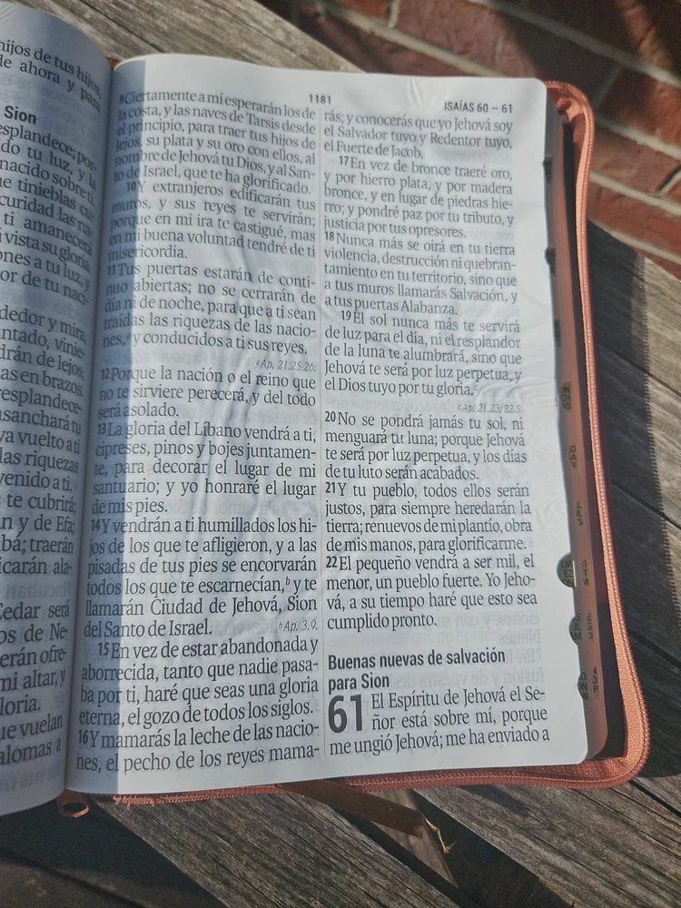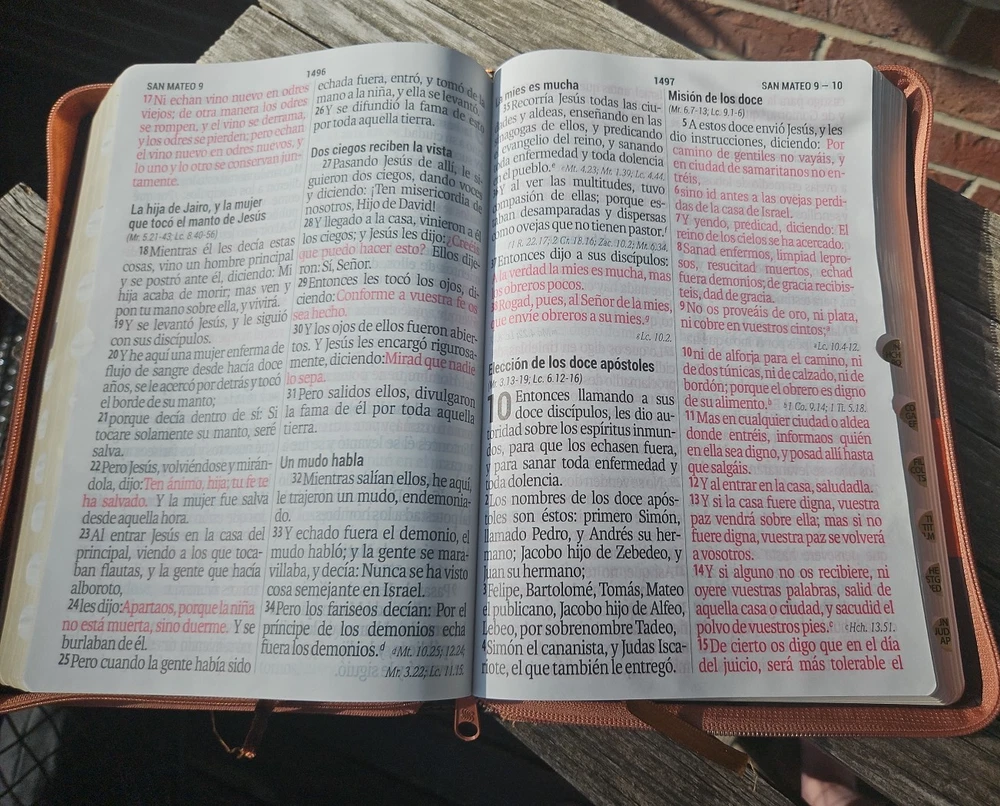 This Spanish Bible is amazing—huge 19-point text makes reading so easy, even for tired eyes! The thumb index helps navigate quickly, and the sturdy zippered cover keeps it protected. Perfect size, not too bulky but still spacious for notes. Super clear print and great quality—exactly as described with real photos. Fast shipping and great seller communication. Highly recommend for anyone needing a large-print Bible!