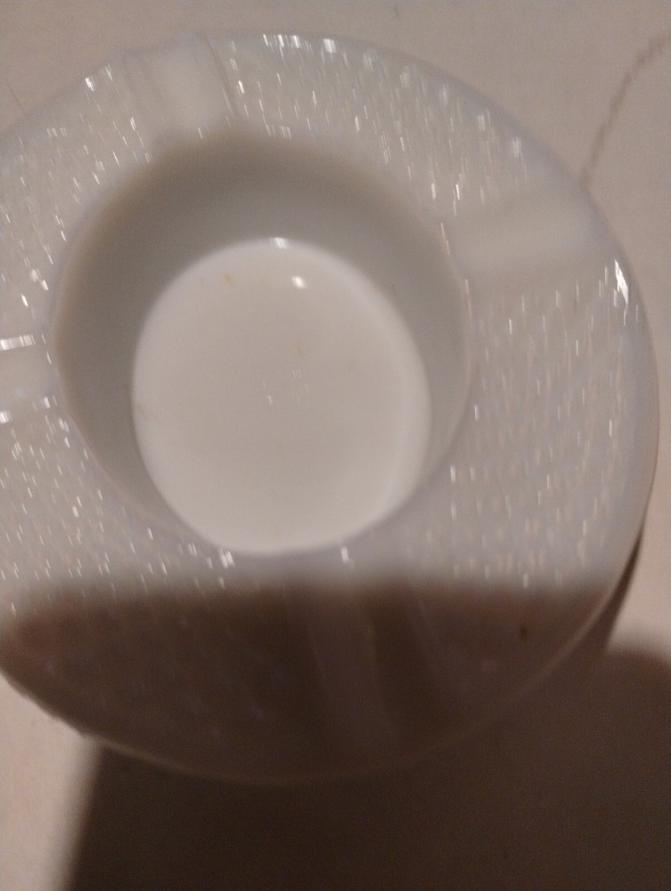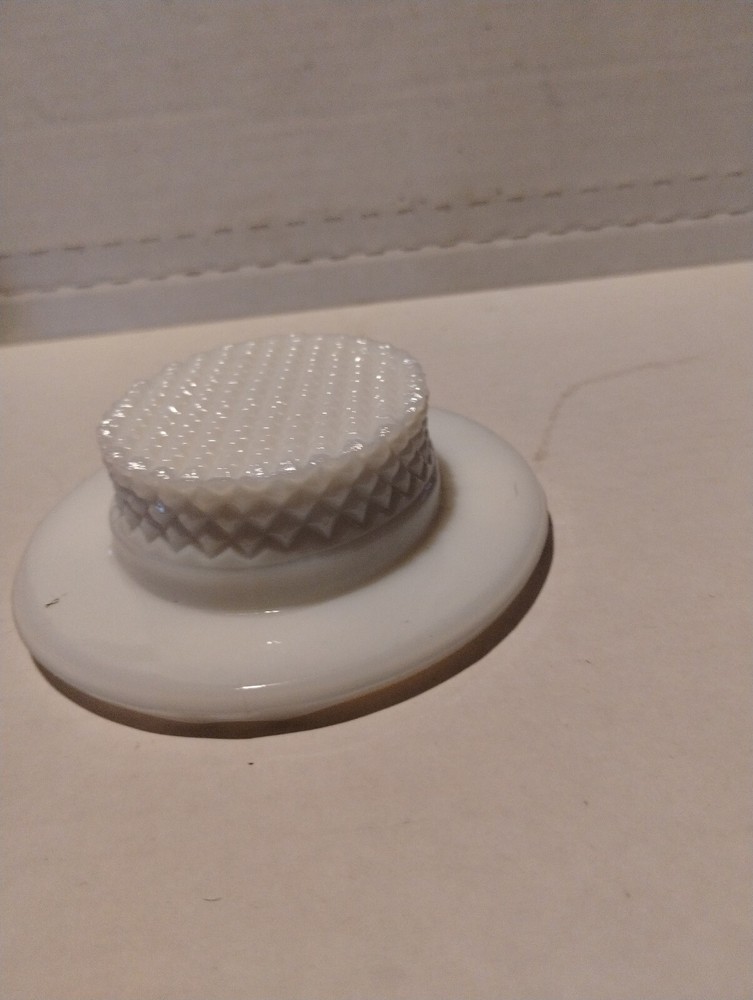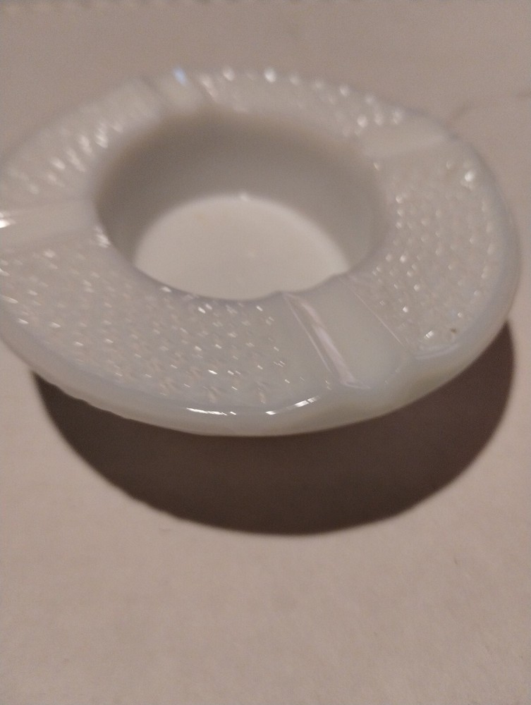 VINTAGE WESTMORELAND MILK GLASS STRAW HAT SKIMMER ASHTRAY. It stands 1 inches and 4 inches wide. The hole is 2 inches wide. It has hobnail on outside of the hat...