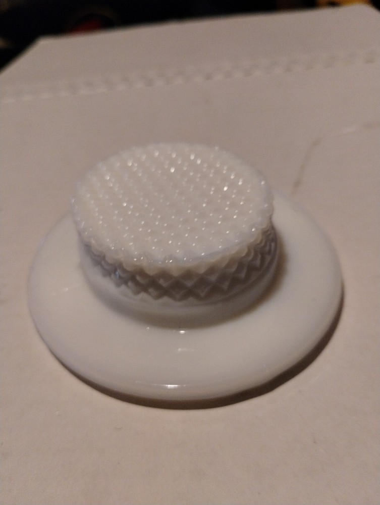 VINTAGE WESTMORELAND MILK GLASS STRAW HAT SKIMMER ASHTRAY. It stands 1 inches and 4 inches wide. The hole is 2 inches wide. It has hobnail on outside of the hat