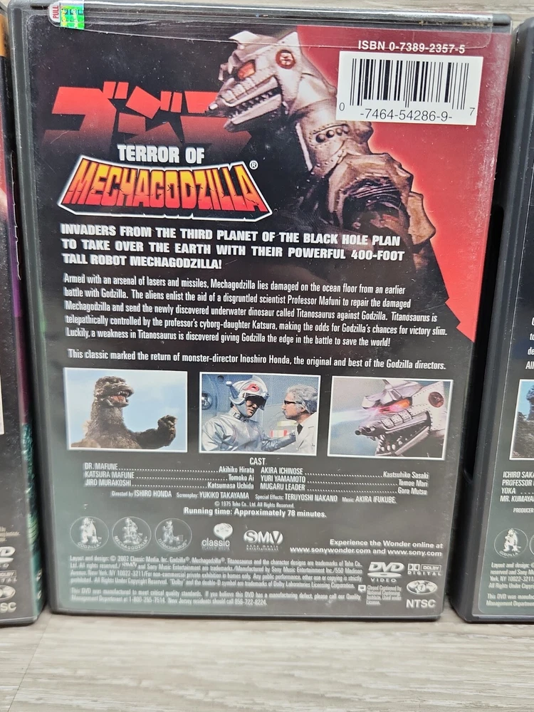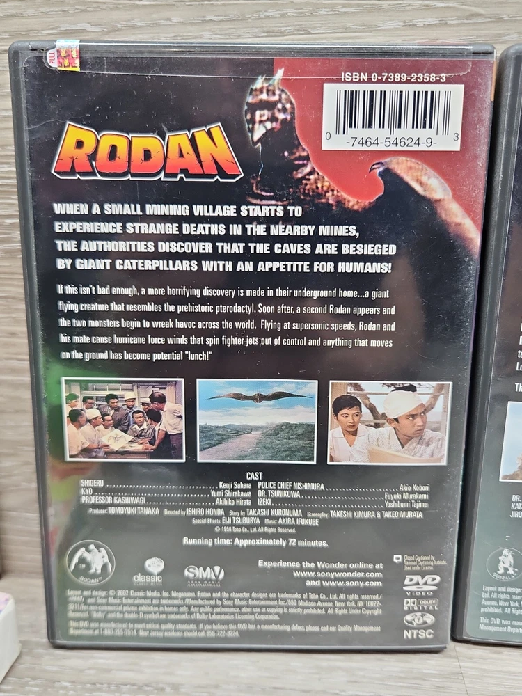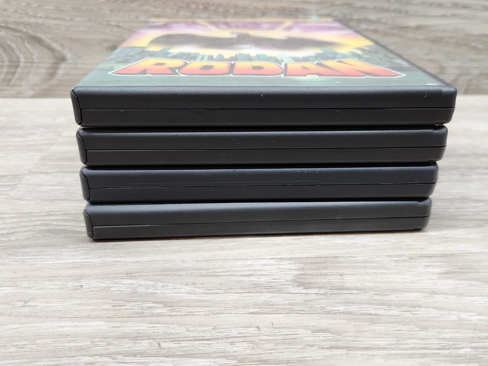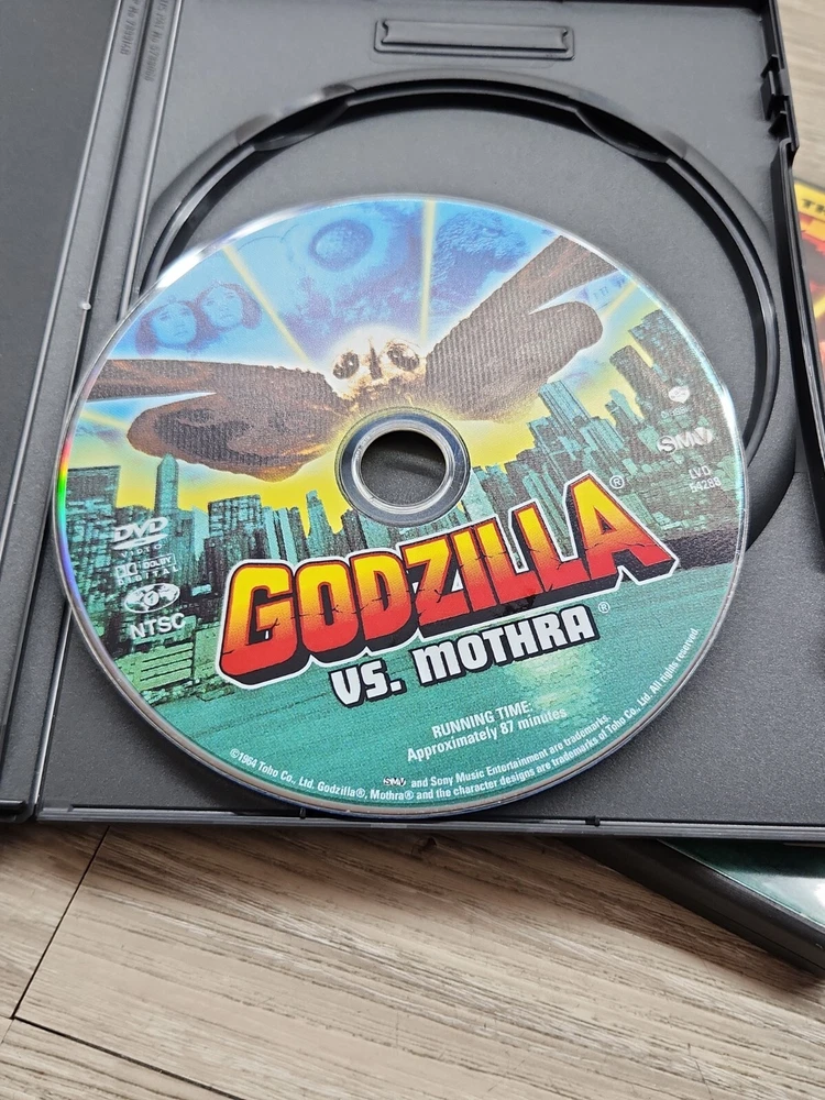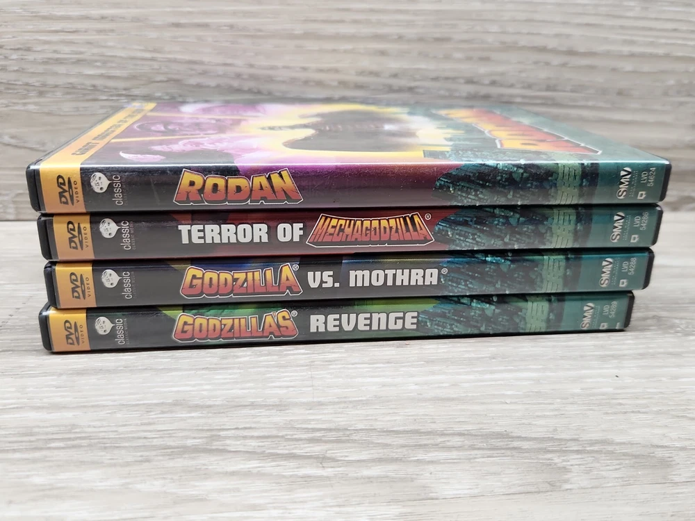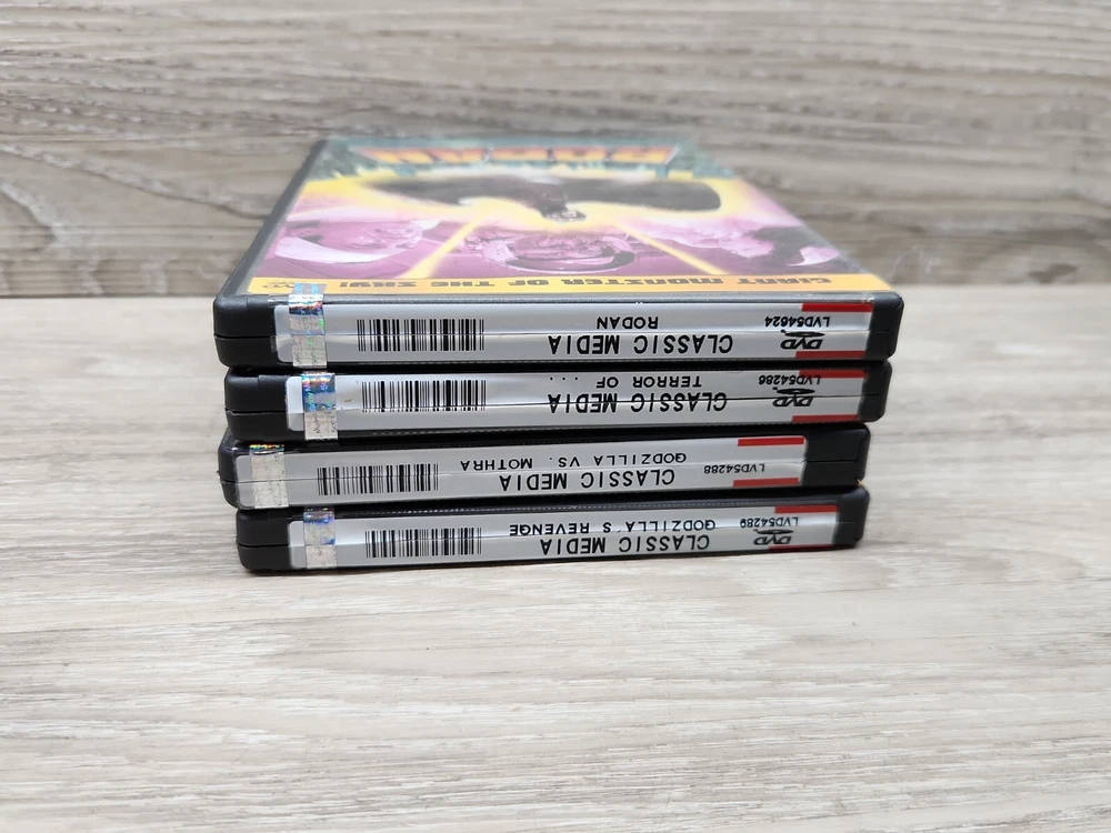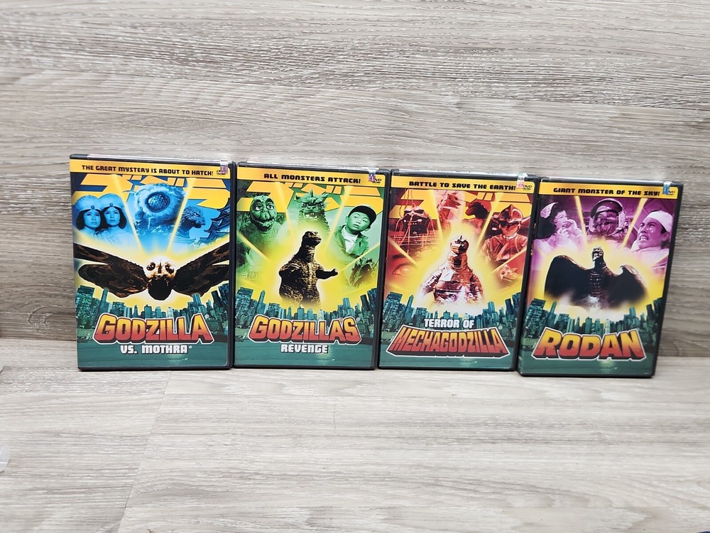 B-3 Pre-owned Free shipping ( media mail) So all four discs do play Three of the discs have a haze on them possibly from the manufacturing process of these disc being low quality maybe I'm not sure. The MOTHRA DISC HAS SCRATCHES AS SHOWN IN PHOTOS So the cases are in very good condition as shown in the photos I will guarantee these to your satisfaction that they will play Please look at the photos I see the quality of what you're getting you will receive these actual disk as shown I will secure for shipping I will secure for shipping