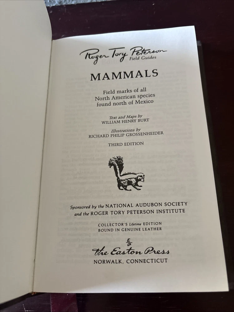 VTG 1996 Roger Tory Peterson Field Guides Mammals Collector’s Leather Edition. I don’t see any major damage to the book. Please see photos. Let me know if you have any questions. Thank you....