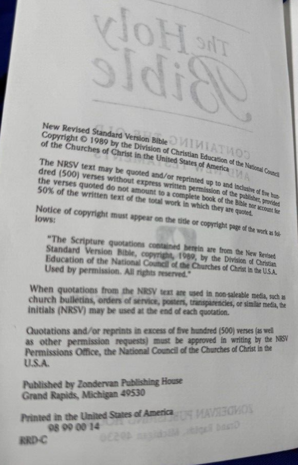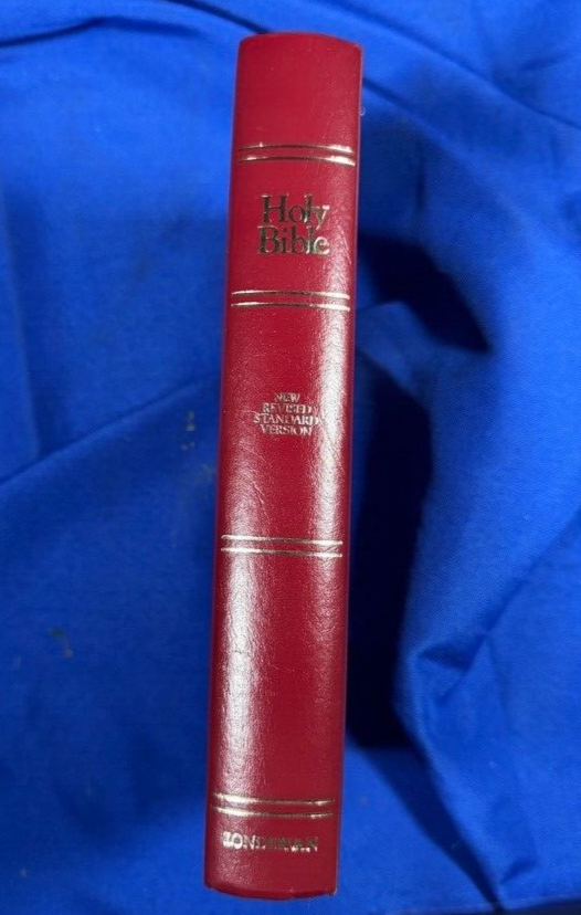 The product is a vintage 9" hardcover Bible published by Zondervan in 1989. It includes both the New and Old Testament in English, . The Bible features a leather-bound cover with gold leaf detailing, and has a total of 1010 pages. This edition is the New Revised Standard version and is intended for a wide audience, including young adults, and adults interested in religious and spiritual literature.