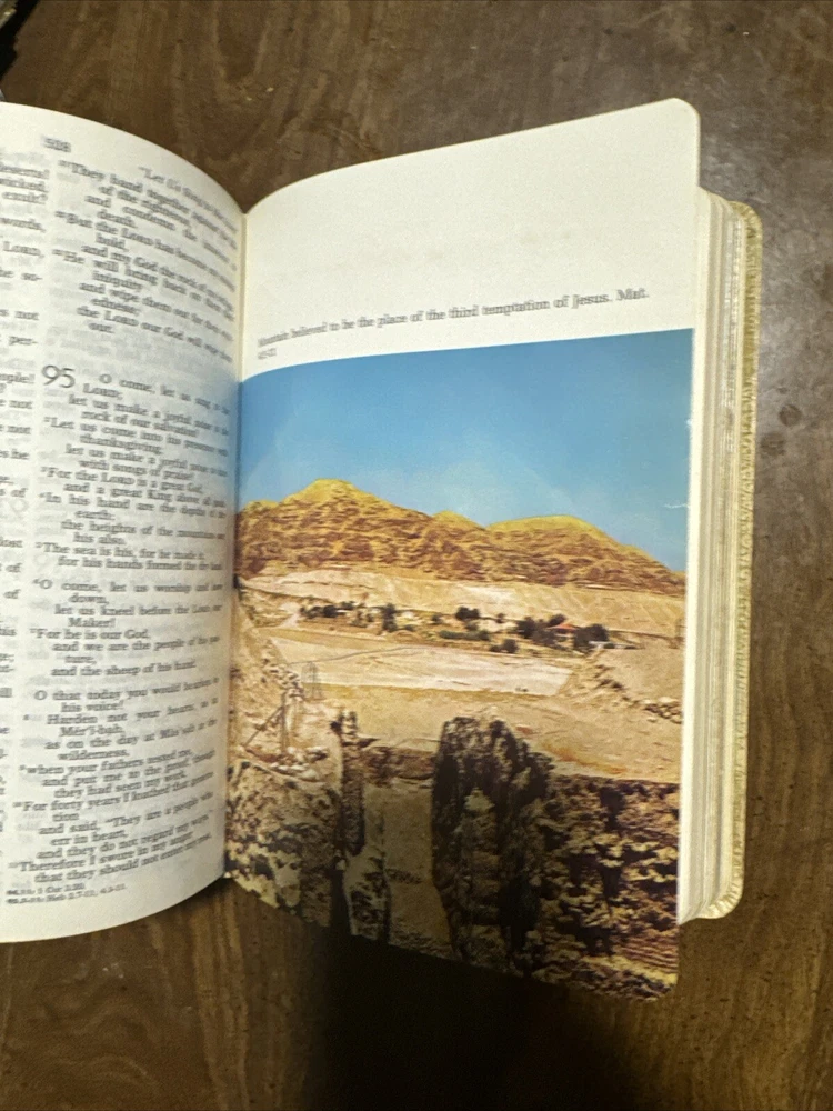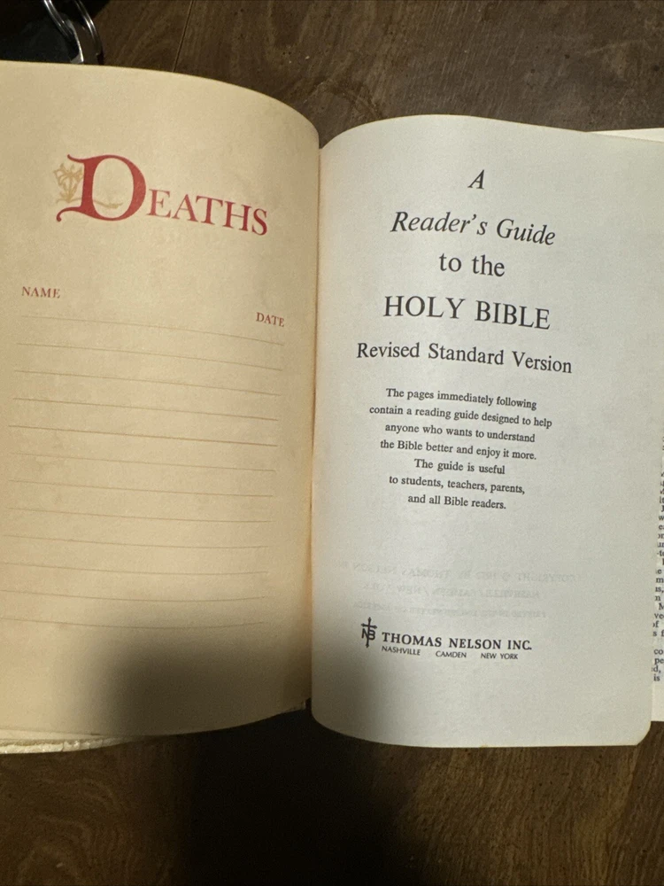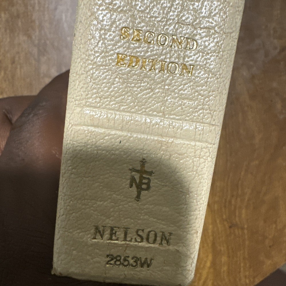 This vintage edition of The Holy Bible, published by Thomas Nelson in 1982, features a special leather cover in red with Christ In Red lettering. The book measures 6.25 inches in length and 4.25 inches in width, making it a perfect size for carrying around. The Bible is in English and is intended for young adults, ages 9-12, and adults. This nonfiction book is a great addition to any collection and is perfect for those interested in spirituality, religious and spiritual history, and enlightenment. The Bible is in excellent condition and is a great opportunity to own a piece of history.A7