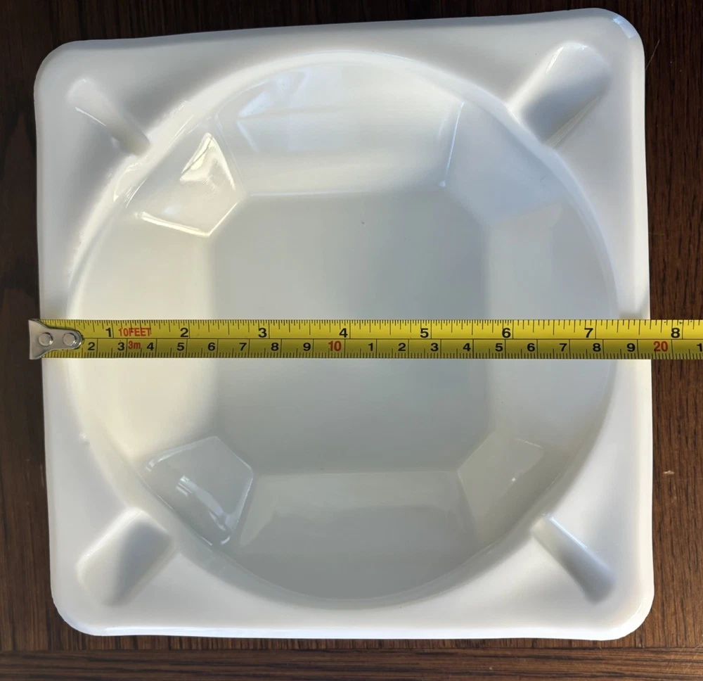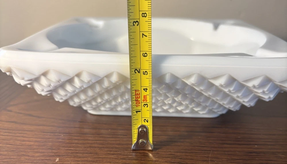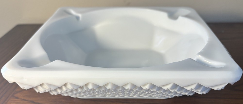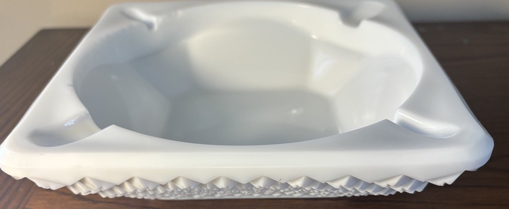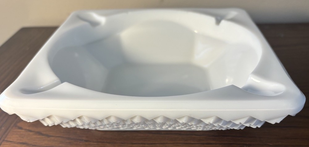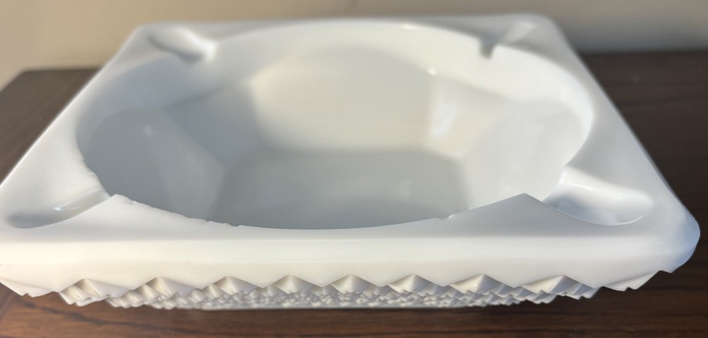 Description We are offering a very large milk glass ashtray. Although it is not marked it appears to be a Westmoreland product in the English Hobnail pattern. This ashtray would be appropriate for cigars or may be used as a catch all. Condition This ashtray is intact with no cracks. There are a couple of small chips by one of the cigar/cigarette grooves. Please review photos closely as these are an integral part of the description and ask any questions before purchase. Measurements (if applicable) H. " W. L. " Everything else We are very open to questions and feedback and would love to hear from you with questions or clarifications before you buy. If you aren't sure about something or need more information it is much easier to handle before you buy than after for all involved. Additional photos are available upon request. This piece will be individually wrapped and secured firmly in the shipping box for safe delivery to your home. We will combine shipping when feasible. We ship USPS Ground Advantage. We will ship same or next day but can't guarantee how quickly USPS gets it to you. If you need the item sooner please let us know before buying and we can offer a different shipping method. Final shipping cost is determined by buyer's location.