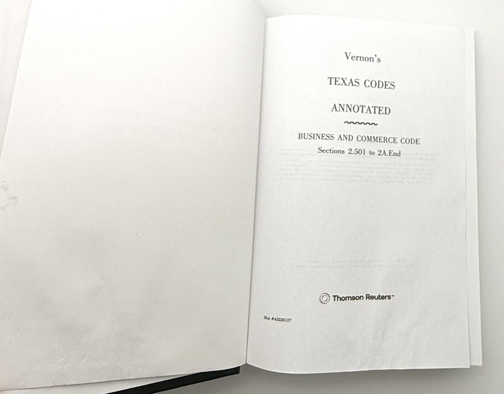 Books 1 & 1A are included in the purchase. Vernon's TEXAS CODES ANNOTATED BUSINESS AND COMMERCE CODE 1A Sec 2.501 to 2A.End. Book is brand new, not used with light travel wear to edges. Free Expedited Shipping from Salt Lake City. Book has a nice embossed picture of the Texas State with a Star. BUSINESS and COMMERCE CODE Sections 1 1.101 to 2.500 also included.