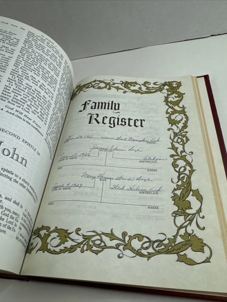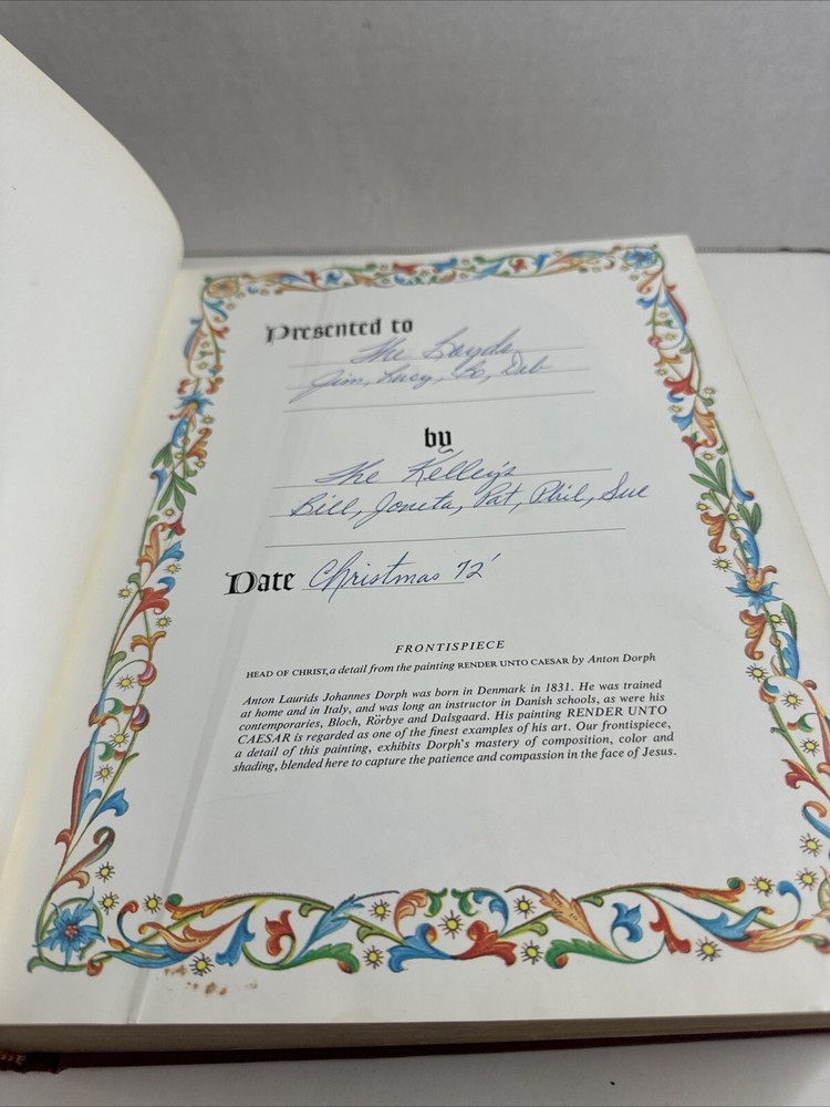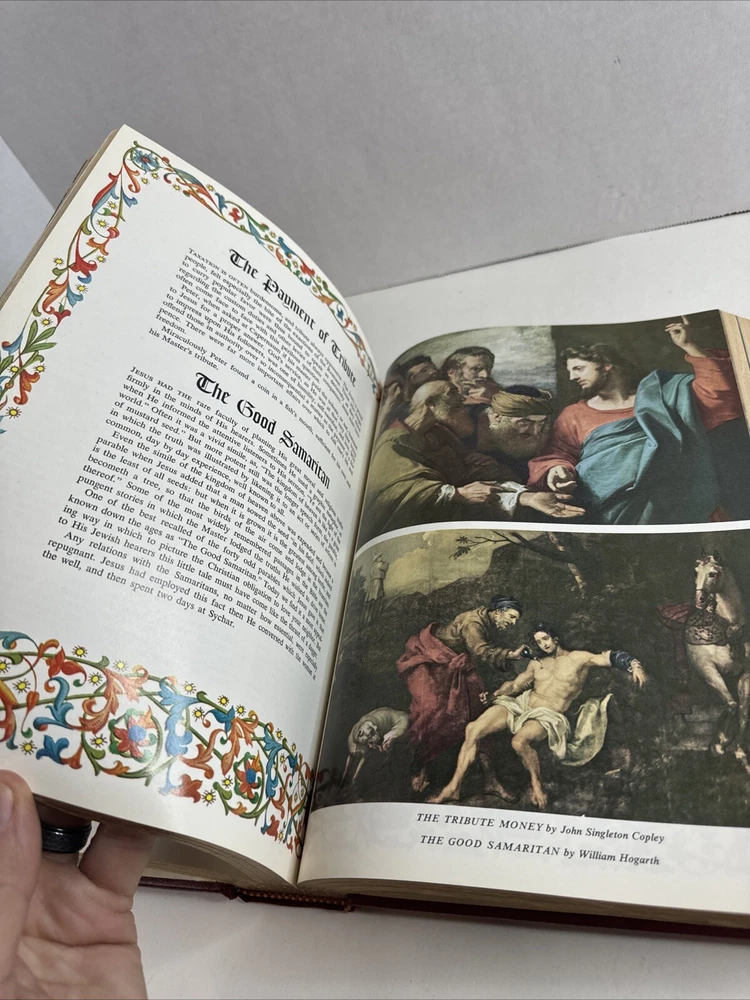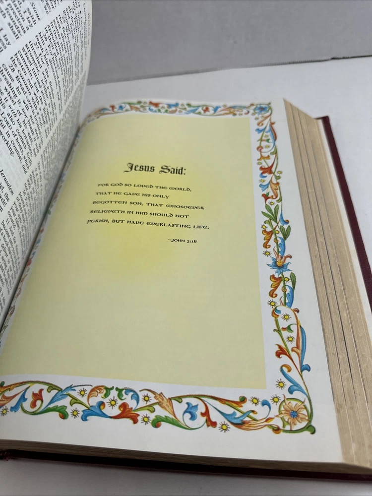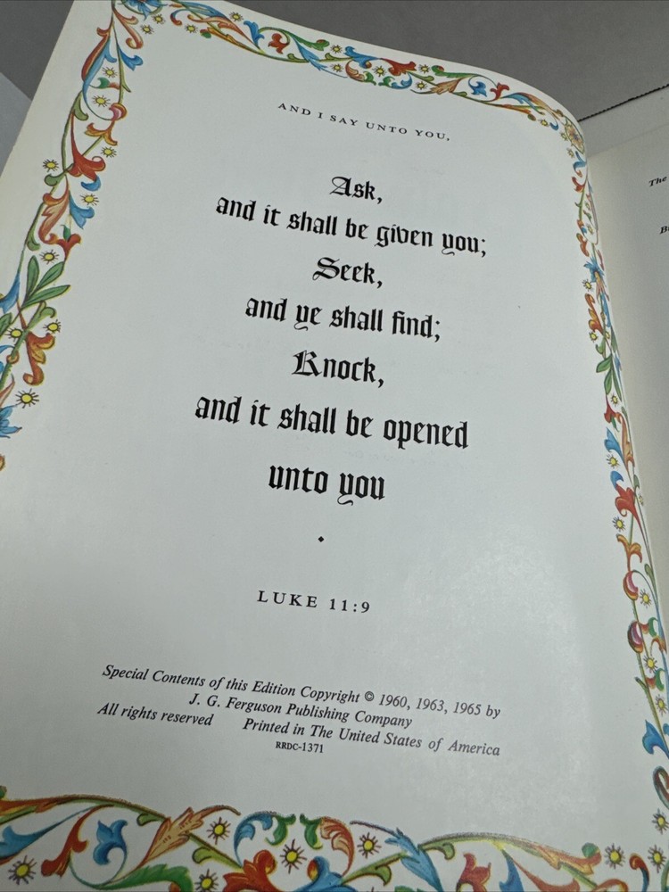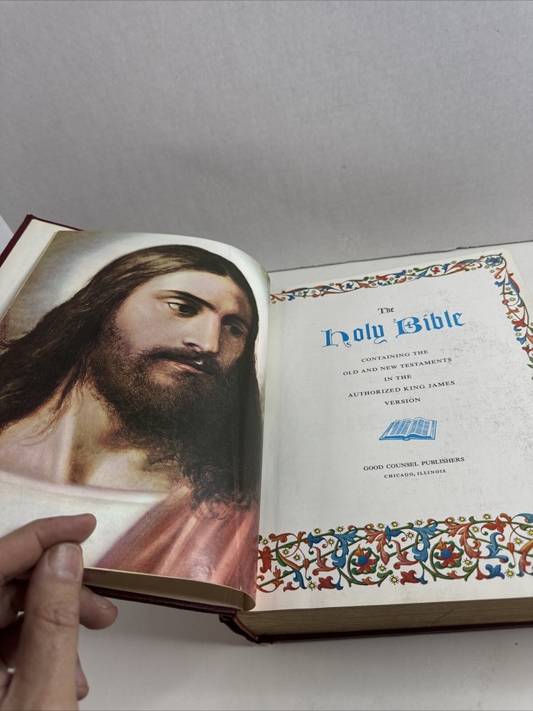 This vintage 1960 Holy Bible is a rare find for anyone seeking a piece of Christian history. The King James Version, published by Good Counsel Publishing Company, is a first edition hardcover with a leather-bound cover. Measuring 9 inches in length, 11 inches in height, and 2.5 inches in width, this book is a comprehensive guide for young adults and adults alike. The Holy Bible features a non-fiction narrative type and covers topics such as bibles, Christian history, and spirituality. With its original English language and unmodified item, this book is a valuable addition to any collection. The book is in excellent shape and weighs 96 oz.