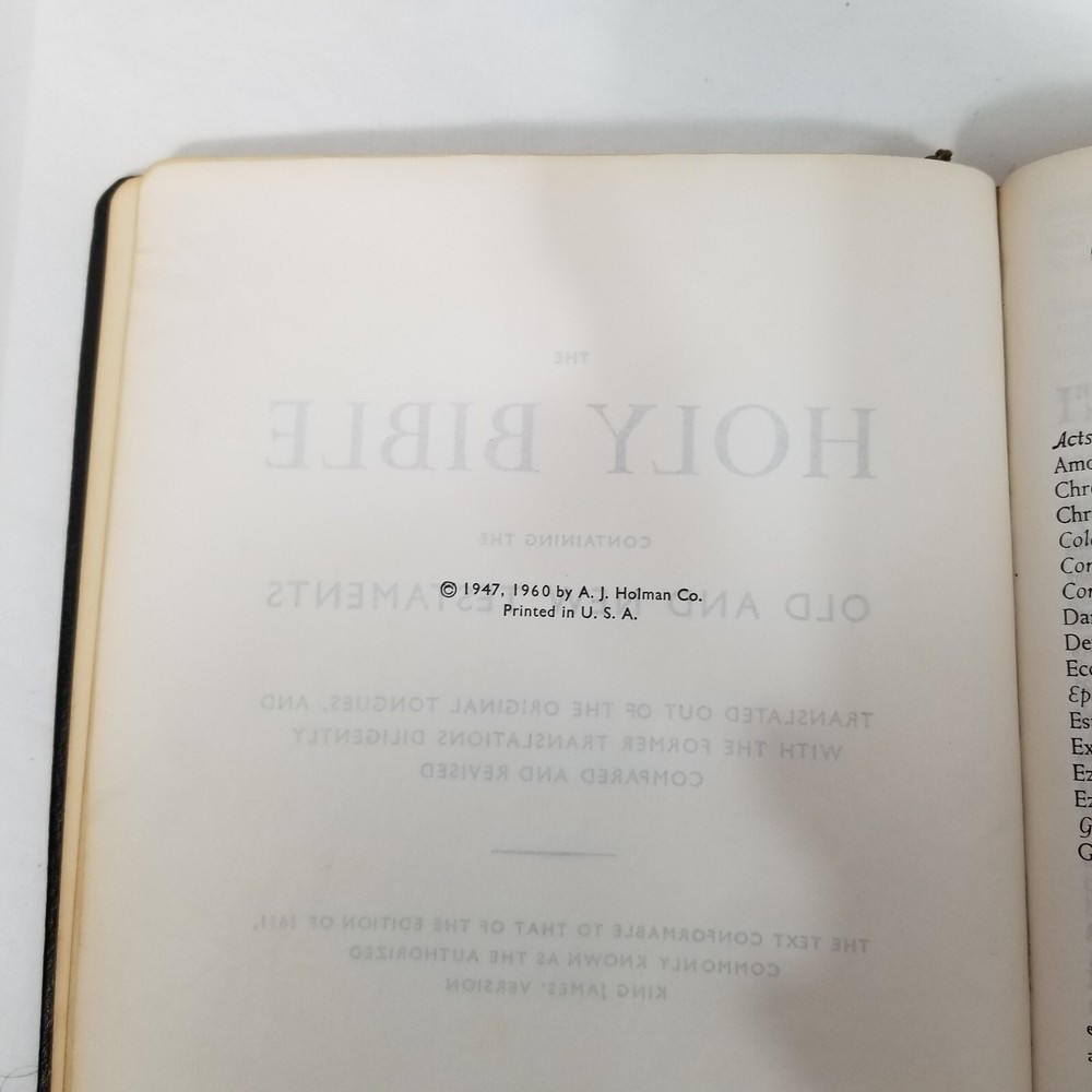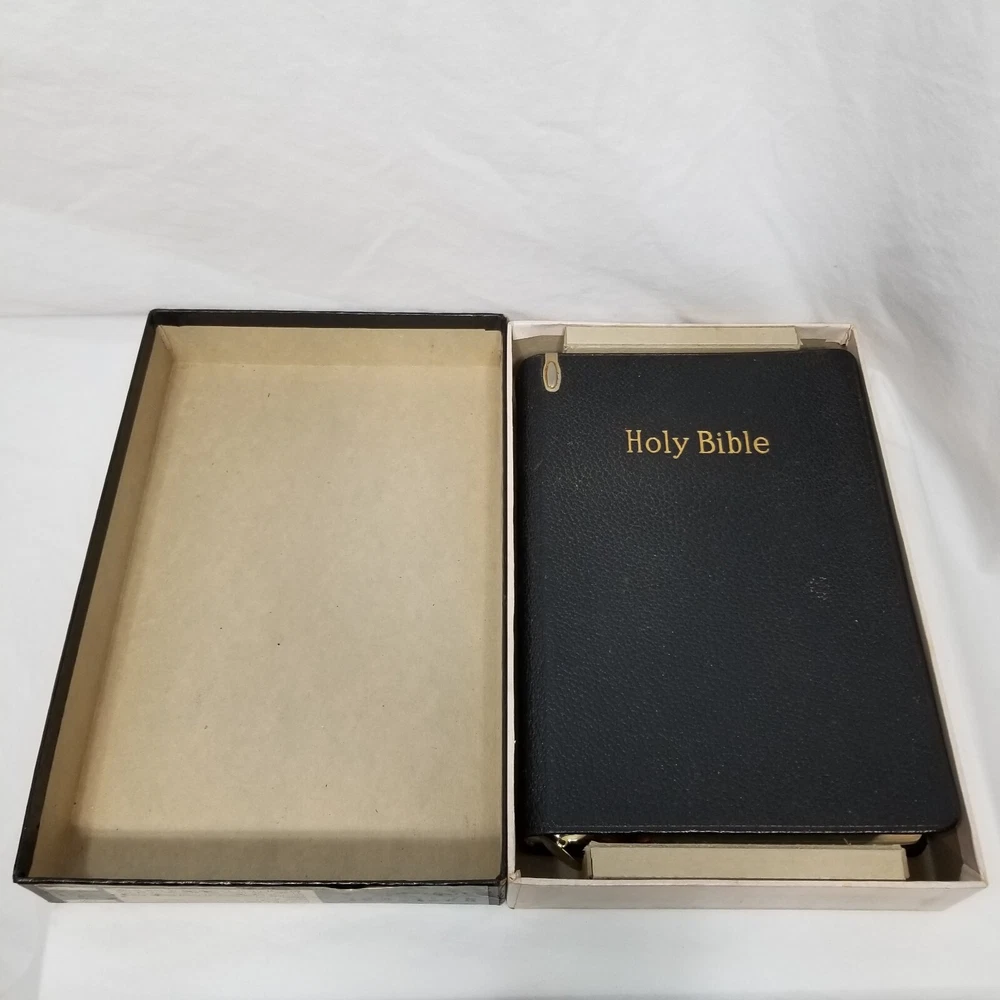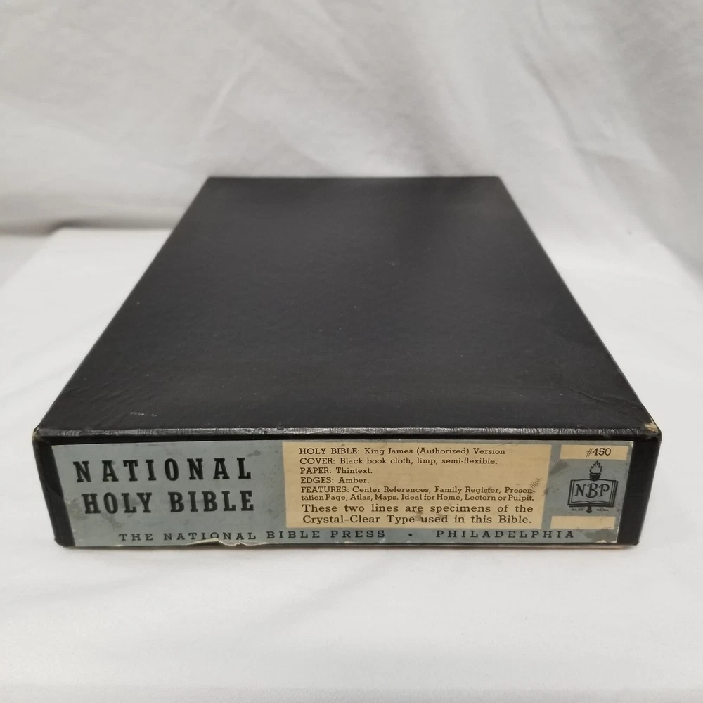 Vintage 1960 in Box Holy Bible by National #450 printed A.J. Holman Company Philadelphia USA. 12 point Cushing. Contains the Old and New Testaments. "Translated out of the original tongues, and with the former translations diligently compared and revised. The text conformable to that of the edition of 1611, commonly known as the authorized King James' Version." Black hard cover, Amber tinted edges, Paper Thintext. Features Center References, Family Register, Presentation Pages, Atlas, Maps. Red satin page holder in the Bible. In addition, a gold colored metal, slip on cover The Ten Commandment page holder chain. Each link has a commandment on it. Ideal for Home, Lectern of Pulpit. Preowned but in very good condition. It does have the stored book smell. Measurements Length 9.75" Width 7" Depth 1.75" In box Length 11.25" Width 7.5" Depth 1.75" This vintage item is a treasure from the past, and while still beautiful and useful, they could show expected signs of use or simply the passage of time - as it is not new. If you are questioning whether you'd like the item as shown, please contact me before your purchase, I would be happy to further describe or add additional photos.