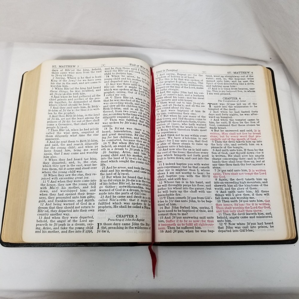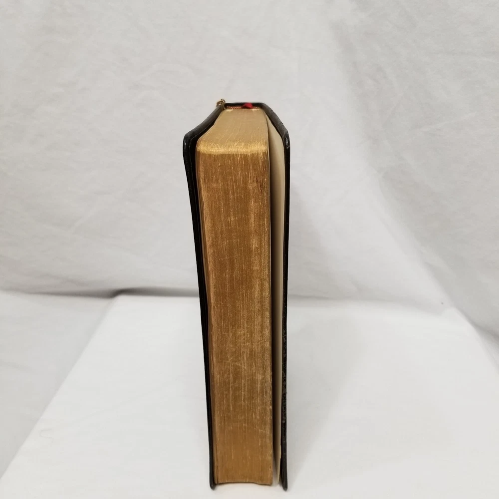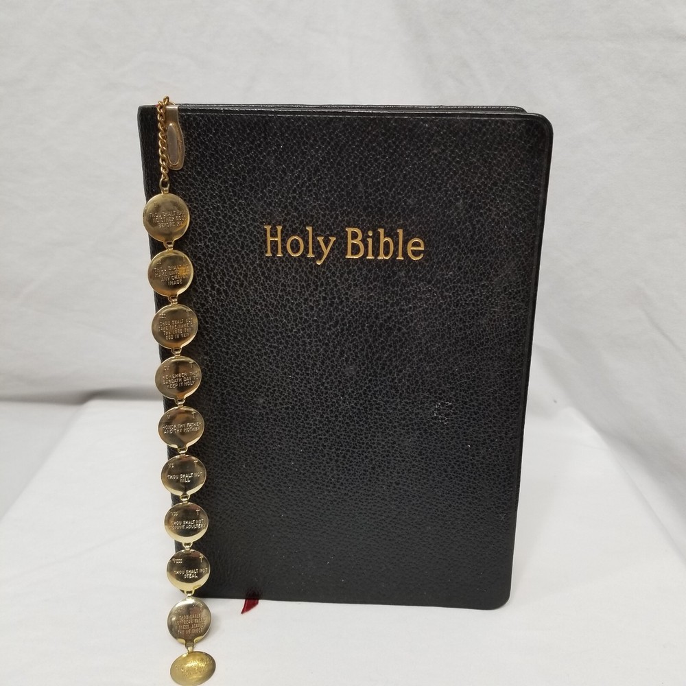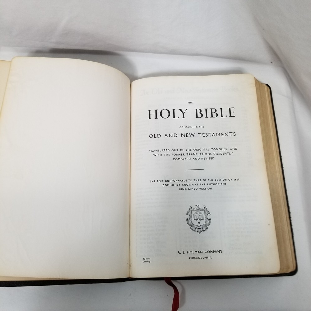 Vintage 1960 in Box Holy Bible by National #450 printed A.J. Holman Company Philadelphia USA. 12 point Cushing. Contains the Old and New Testaments. "Translated out of the original tongues, and with the former translations diligently compared and revised. The text conformable to that of the edition of 1611, commonly known as the authorized King James' Version." Black hard cover, Amber tinted edges, Paper Thintext. Features Center References, Family Register, Presentation Pages, Atlas, Maps. Red satin page holder in the Bible. In addition, a gold colored metal, slip on cover The Ten Commandment page holder chain. Each link has a commandment on it. Ideal for Home, Lectern of Pulpit. Preowned but in very good condition. It does have the stored book smell. Measurements Length 9.75" Width 7" Depth 1.75" In box Length 11.25" Width 7.5" Depth 1.75" This vintage item is a treasure from the past, and while still beautiful and useful, they could show expected signs of use or simply the passage of time - as it is not new. If you are questioning whether you'd like the item as shown, please contact me before your purchase, I would be happy to further describe or add additional photos.