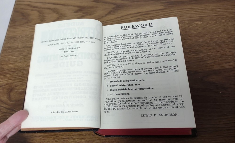 Pre-owned vintage item No dust cover Very light damage to cover Clean pages, just a couple of bent corners Audels Refrigeration and Air Conditioning Guide 1961 edition
