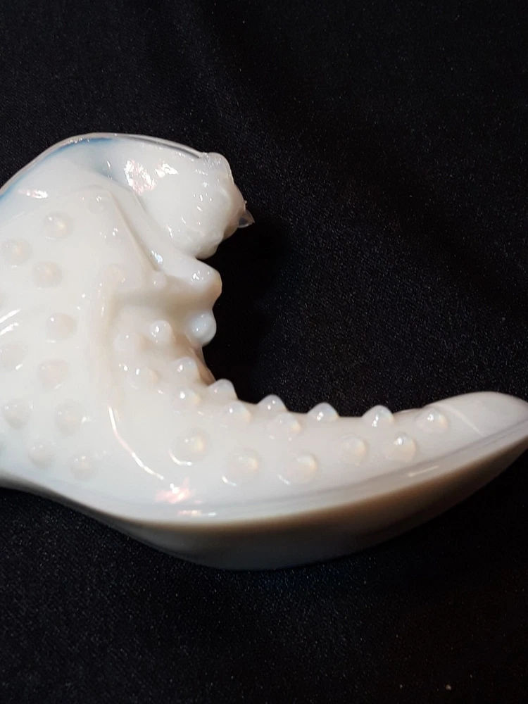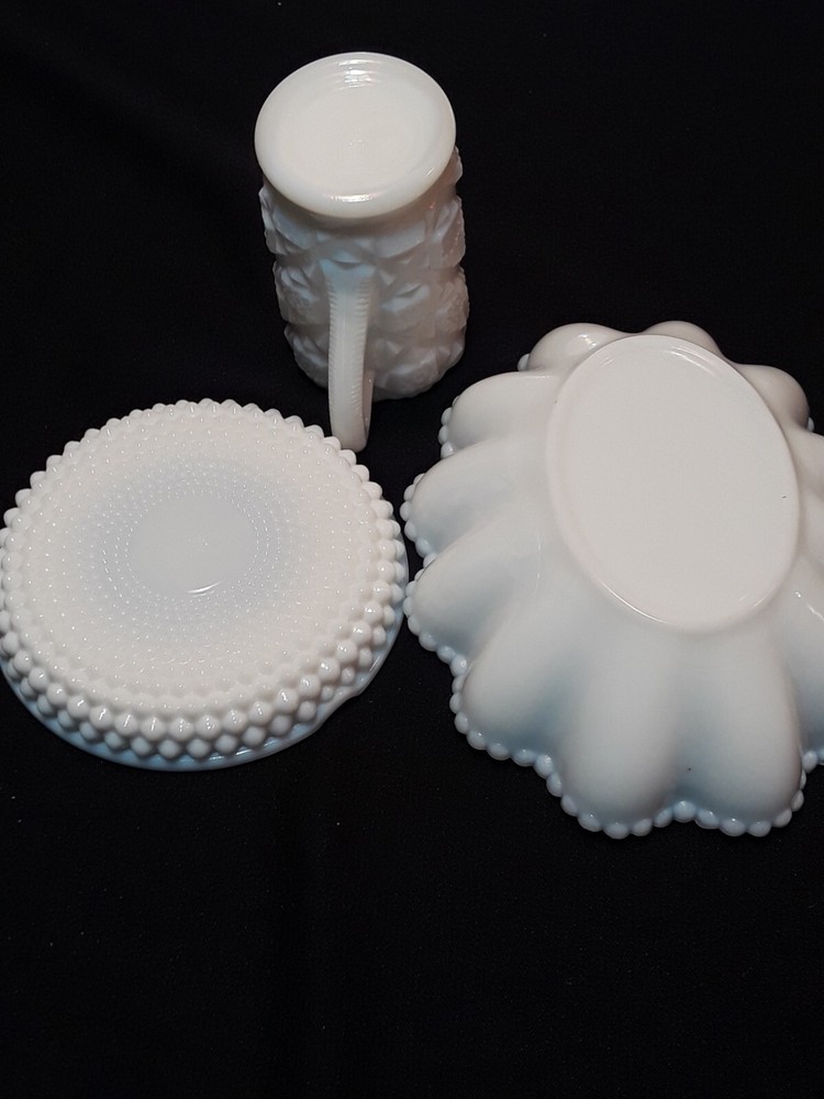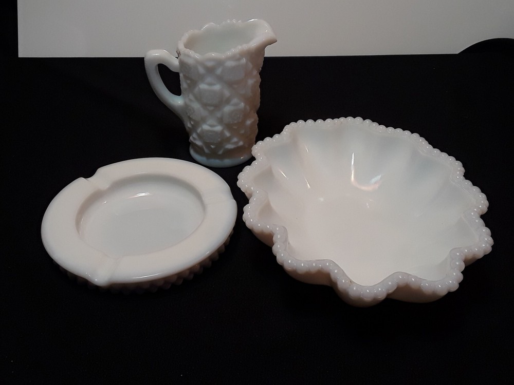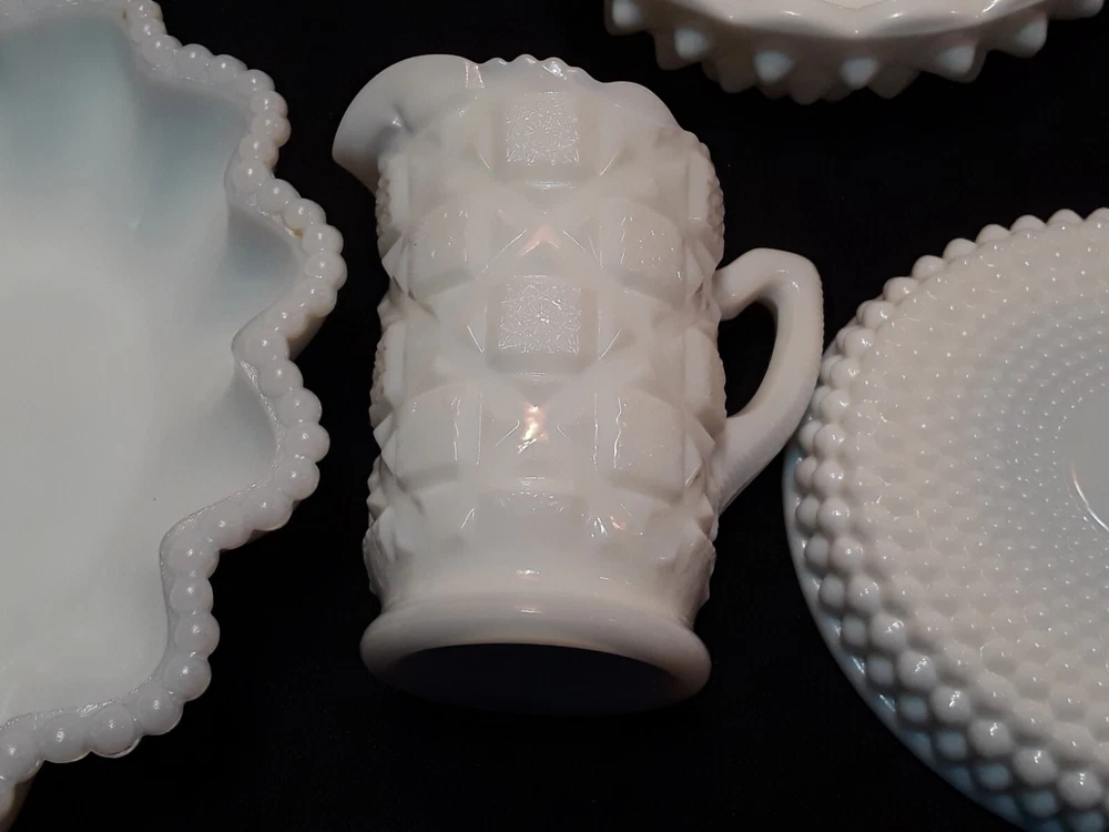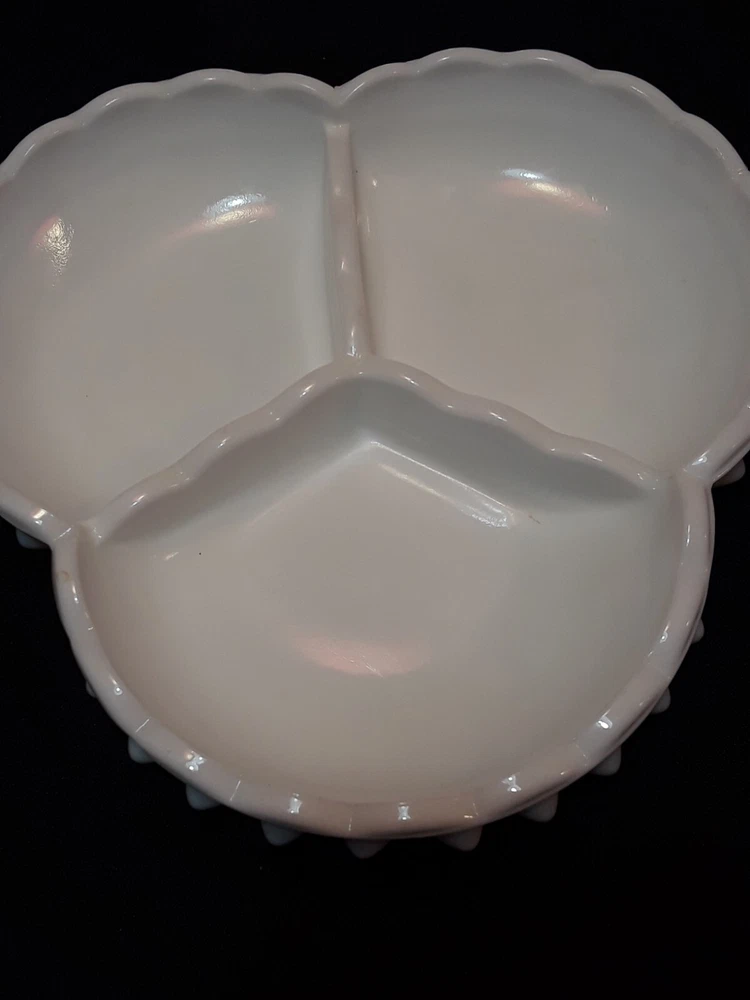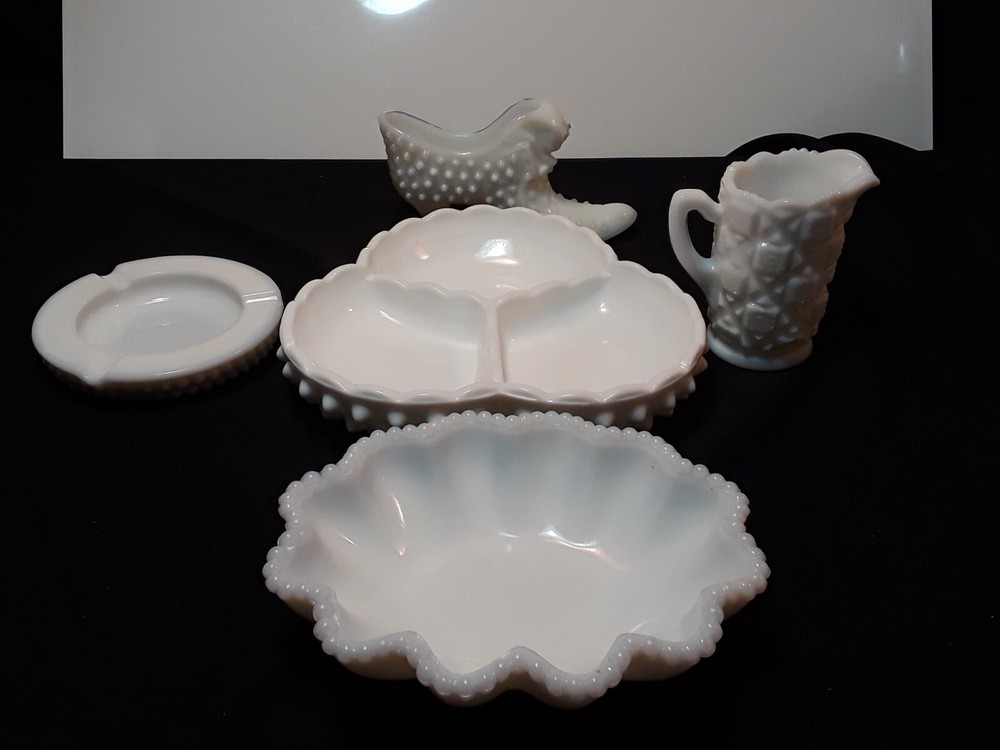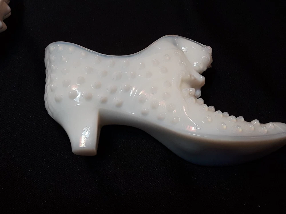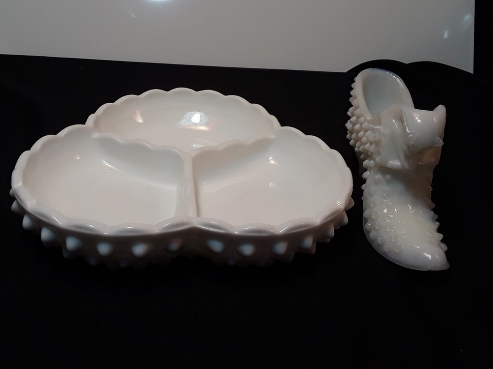 Vintage 2 Pc. Fenton 3pc. Westmoreland Lot Of 5 Pcs Milk Glass Hobnail. The three pieces of Westmoreland are stamped they include the ashtray the picture in the small bowl dish. The two pieces of Fenton are the three compartment serving dish and the shoe the serving dish has the stamp Fenton. The shoe is older and is missing the sticker. All five pieces are the way they should be there are no chips cracks flaws of any kind. See pictures for condition. I do not ship out of USA 48 states.