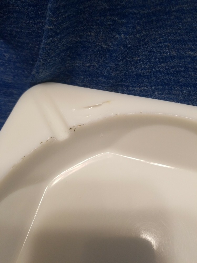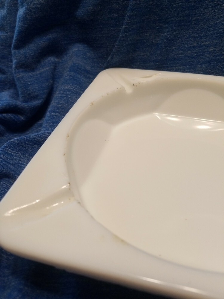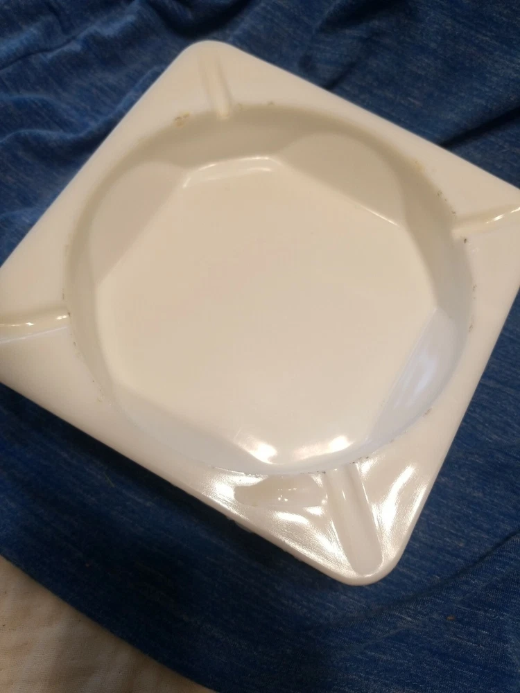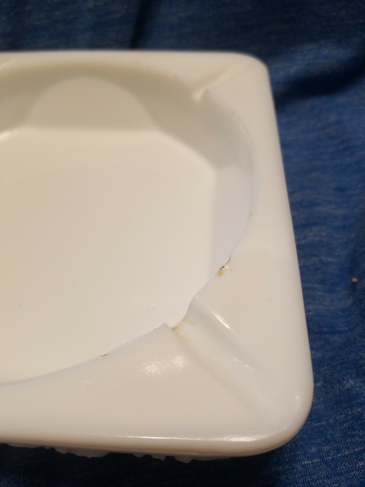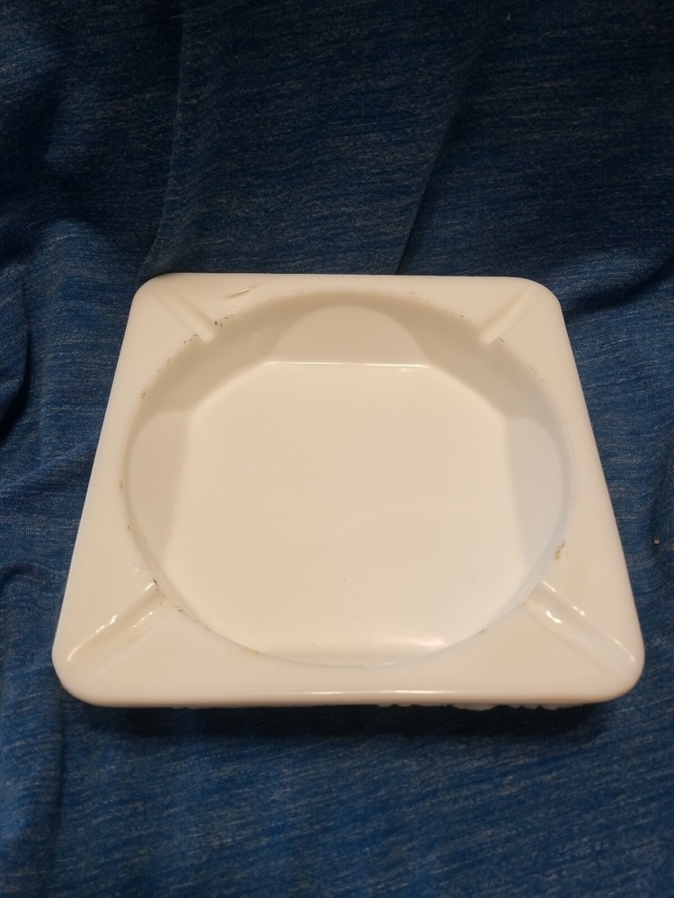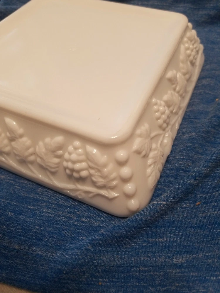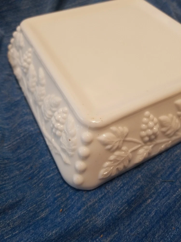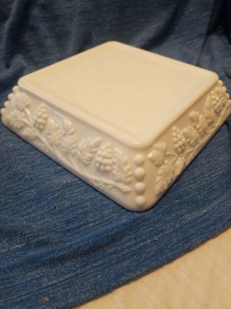 Vintage 6 1/2" White Milk Glass Westmoreland Paneled Grape Pattern Ashtray (b). Condition is Used. Shipped with USPS Parcel Select Ground. Please see photos for condition. Overall in great shape with the exception of a small chunk out of one corner in the top as pictured