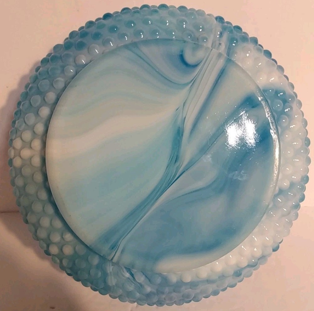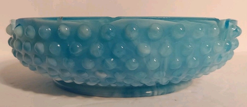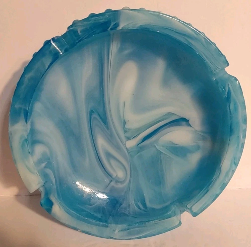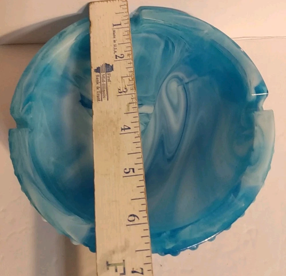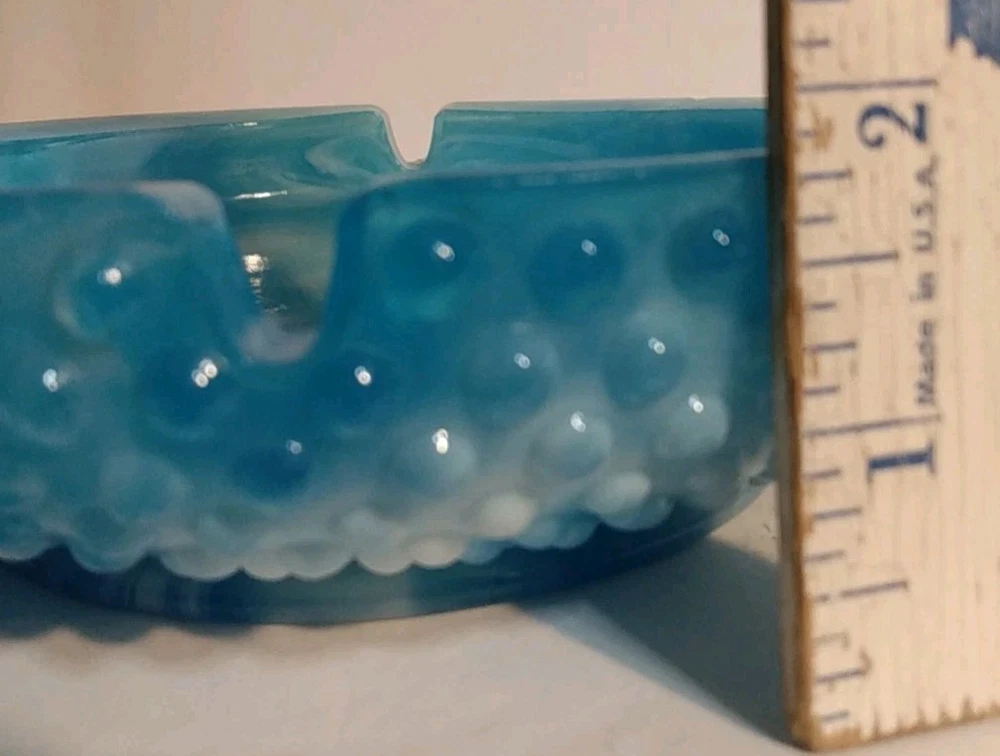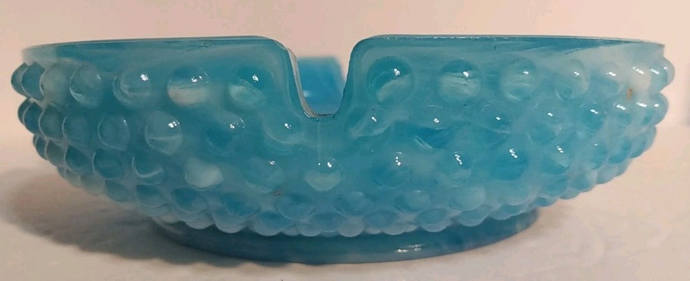 Add a touch of vintage charm to your decor with this beautiful blue and white hobnail glossy ashtray. The round shape and swirl pattern make it suitable for any mid-century modern or art pottery themed rooms. The ashtray is made of slag glass and has a capacity of 4 cigarettes. Despite a chip and some fleabites, this original piece is still in great shape and will make a perfect addition to your collection. The ashtray is approximately 6.75 inches in diameter and 1.75 inches in height, with a weight of 3 pounds when packed. It is a studio crafted production from the 1960s, with an unusual and decorative feature that will surely catch the eye of any guest. Fleabites and chip are pictured in the last few pictures. Pictures are considered a MAJOR part of the description. Please look closely at ALL of them. Any defects not mentioned but visible in the pictures will be considered as "described". PLEASE: USE THE ZOOM FEATURE AND READ the DESCRIPTION. SIZE: The size of the item is shown in the pictures with a RULER OR YARDSTICK next to the item. IF there is any damage- it is shown in the last two pictures (possibly more) and will be listed as damage in the auction description. AGAIN, PLEASE EXAMINE ALL OF THE PICTURES CAREFULLY TO MAKE SURE THAT THE ITEM(S) CONDITION IS ACCEPTABLE TO YOU PRIOR TO PLACING A BID OR BUYING! Shipping is sent through USPS using ground advantage which is estimated by eBay combining the size of the box, the weight of the box and the distance traveled. You are charged the EXACT amount that USPS charges to send from my address to yours. So, shipping charges are non-negotiable. An extremely high percentage of my items are VINTAGE AND RARELY NEW. Vintage= 20 years - 99 years. Antique= 100 years or older. Vintage items are objects made prior to 1990 and MOST have smaller flaws indicative of normal use and age. If you are a vintage glass collector, we will be listing a lot of new (vintage) art glass, including Fenton, Westmoreland and more, sporadically - as we acquire it. If you are an art glass collector, make sure you check back weekly, as we have too much to list all at once. I work on the weekend evenings til 3 am, so, I list mainly on Wednesdays and Thursdays and sometimes I may not be able to get to respond to messages until after midnight as I am a night owl. YES, I DO COMBINE SHIPPING! EBAY SELLERS CANNOT SEE WHAT IS IN YOUR CART. ANY QUESTIONS MUST BE ASKED FROM THE SPECIFIC ITEM'S *CONTACT SELLER* OPTION. YOU CAN PAY FOR EVERYTHING SEPARATELY OR YOU CAN REQUEST AN INVOICE. IF YOU REQUEST AN INVOICE IT WILL HAVE THE RETAIL POSTAGE STATED FOR ALL ITEMS IN ONE BOX AS LONG (AS THEY FIT INTO ONE BOX). IF YOU BUY THINGS INDIVIDUALLY, I WILL REFUND ANY EXTRA MONEY THAT YOU HAVE PAID IMMEDIATELY AFTER I PURCHASE THE SHIPPING LABEL. I do offer refunds if the item is damaged during shipping or item is not as described (sometimes I miss things) -but if you do not like the item and return it -you are responsible for the return shipping. In cases of returns, the item must be received back to me in the same state it was sent to you, before a refund is initiated. *********************************** My eBay store is called: Divine Vintage Rescues. My seller id is: divina4man Last edited: 05082025!! Happy Spring!!!!