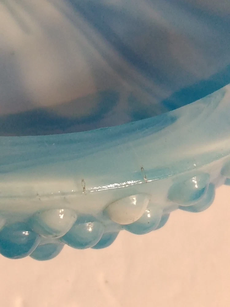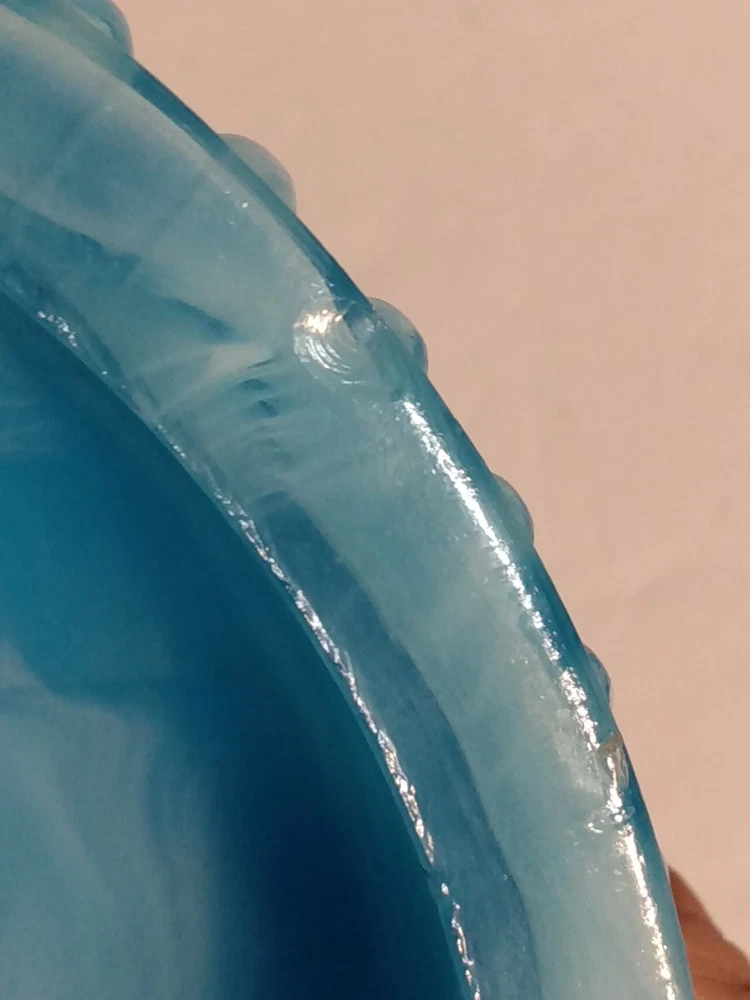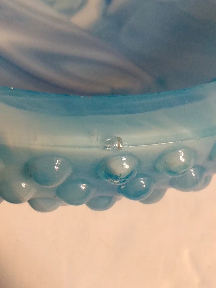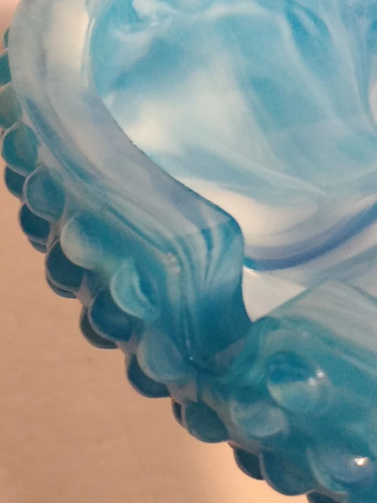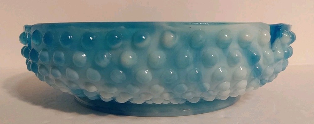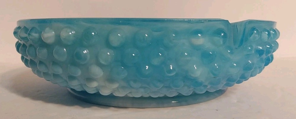 Add a touch of vintage charm to your decor with this beautiful blue and white hobnail glossy ashtray. The round shape and swirl pattern make it suitable for any mid-century modern or art pottery themed rooms. The ashtray is made of slag glass and has a capacity of 4 cigarettes. Despite a chip and some fleabites, this original piece is still in great shape and will make a perfect addition to your collection. The ashtray is approximately 6.75 inches in diameter and 1.75 inches in height, with a weight of 3 pounds when packed. It is a studio crafted production from the 1960s, with an unusual and decorative feature that will surely catch the eye of any guest. Fleabites and chip are pictured in the last few pictures. Pictures are considered a MAJOR part of the description. Please look closely at ALL of them. Any defects not mentioned but visible in the pictures will be considered as "described". PLEASE: USE THE ZOOM FEATURE AND READ the DESCRIPTION. SIZE: The size of the item is shown in the pictures with a RULER OR YARDSTICK next to the item. IF there is any damage- it is shown in the last two pictures (possibly more) and will be listed as damage in the auction description. AGAIN, PLEASE EXAMINE ALL OF THE PICTURES CAREFULLY TO MAKE SURE THAT THE ITEM(S) CONDITION IS ACCEPTABLE TO YOU PRIOR TO PLACING A BID OR BUYING! Shipping is sent through USPS using ground advantage which is estimated by eBay combining the size of the box, the weight of the box and the distance traveled. You are charged the EXACT amount that USPS charges to send from my address to yours. So, shipping charges are non-negotiable. An extremely high percentage of my items are VINTAGE AND RARELY NEW. Vintage= 20 years - 99 years. Antique= 100 years or older. Vintage items are objects made prior to 1990 and MOST have smaller flaws indicative of normal use and age. If you are a vintage glass collector, we will be listing a lot of new (vintage) art glass, including Fenton, Westmoreland and more, sporadically - as we acquire it. If you are an art glass collector, make sure you check back weekly, as we have too much to list all at once. I work on the weekend evenings til 3 am, so, I list mainly on Wednesdays and Thursdays and sometimes I may not be able to get to respond to messages until after midnight as I am a night owl. YES, I DO COMBINE SHIPPING! EBAY SELLERS CANNOT SEE WHAT IS IN YOUR CART. ANY QUESTIONS MUST BE ASKED FROM THE SPECIFIC ITEM'S *CONTACT SELLER* OPTION. YOU CAN PAY FOR EVERYTHING SEPARATELY OR YOU CAN REQUEST AN INVOICE. IF YOU REQUEST AN INVOICE IT WILL HAVE THE RETAIL POSTAGE STATED FOR ALL ITEMS IN ONE BOX AS LONG (AS THEY FIT INTO ONE BOX). IF YOU BUY THINGS INDIVIDUALLY, I WILL REFUND ANY EXTRA MONEY THAT YOU HAVE PAID IMMEDIATELY AFTER I PURCHASE THE SHIPPING LABEL. I do offer refunds if the item is damaged during shipping or item is not as described (sometimes I miss things) -but if you do not like the item and return it -you are responsible for the return shipping. In cases of returns, the item must be received back to me in the same state it was sent to you, before a refund is initiated. *********************************** My eBay store is called: Divine Vintage Rescues. My seller id is: divina4man Last edited: 05082025!! Happy Spring!!!!