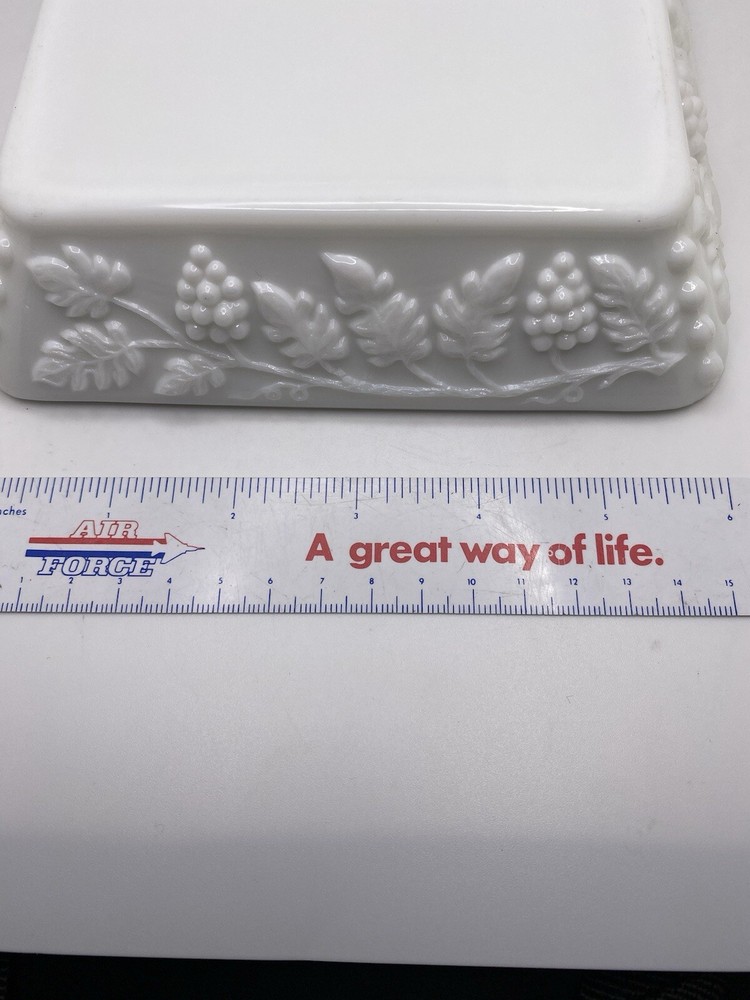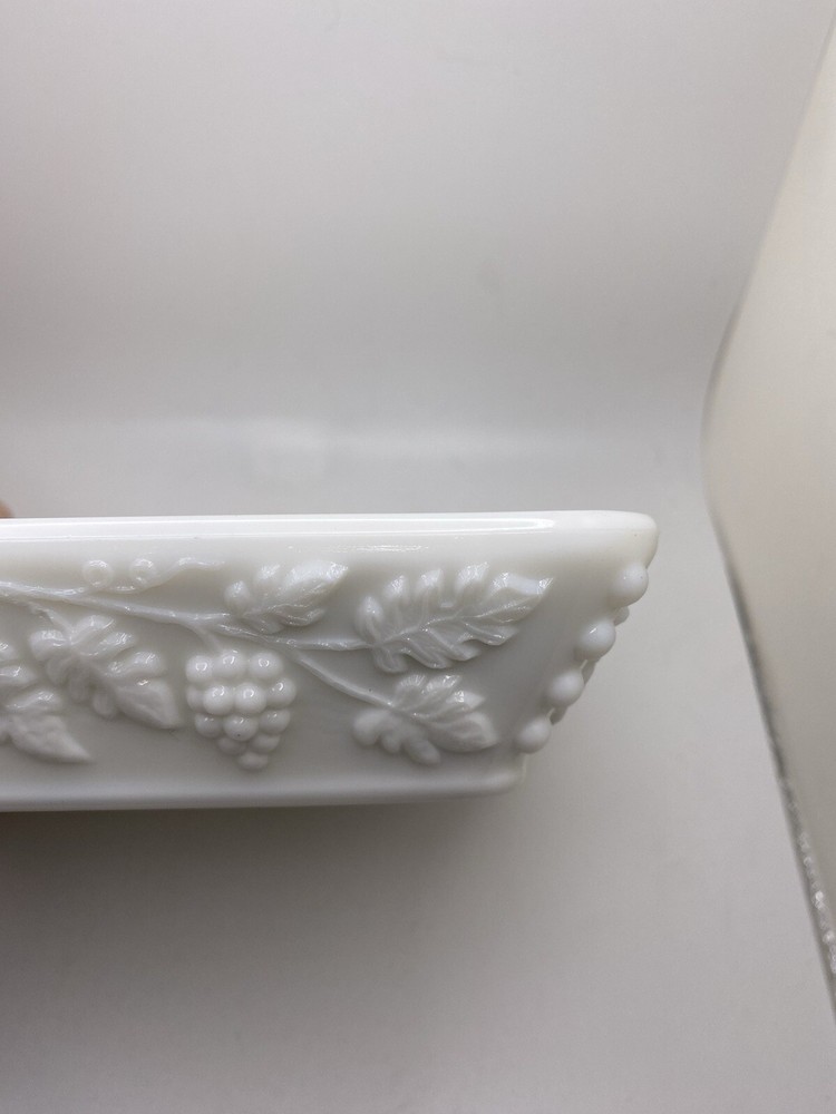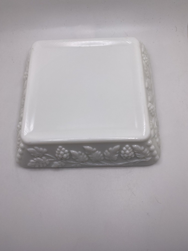 Vintage WESTMORELAND Milk Glass Heavy Square Ashtray Raised Grapes & Vines 6"x6" A collectible and functionable heavy white milk glass ash tray Features a raised grape and vine pattern around the sides Four slots for cigarettes Westmoreland stamp on bottom "W" Measures approximately 6" x 6" No chips, cracks, repairs or stains Please look closely at photos for details Questions are always welcome and promptly answered Thank you for looking