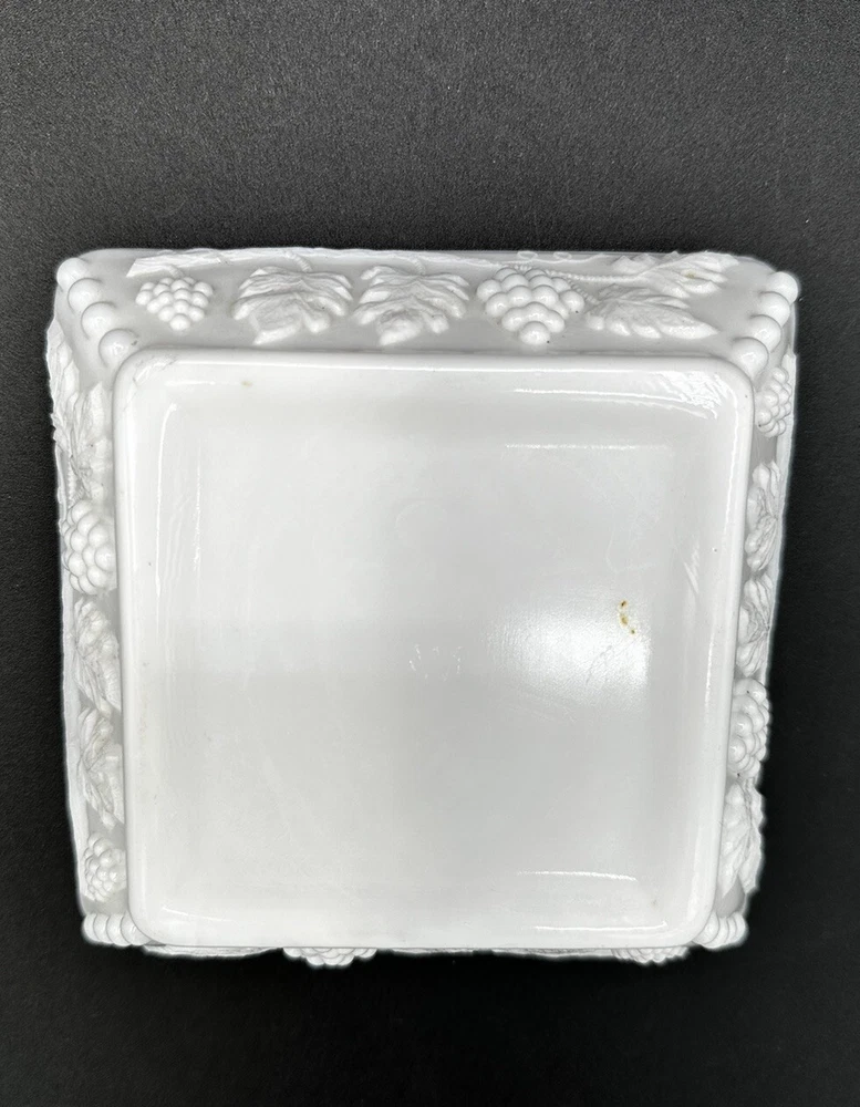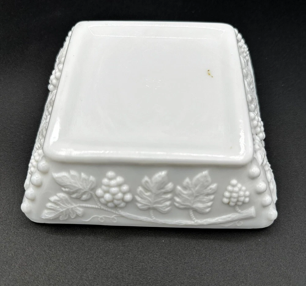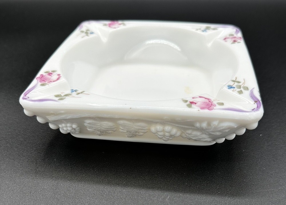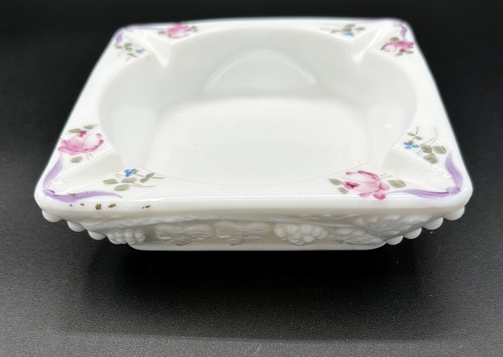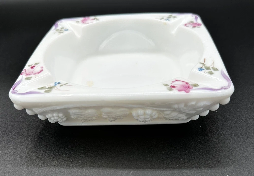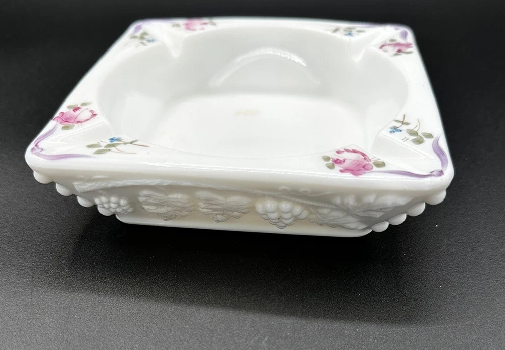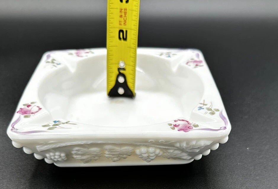 This elegant milk glass ashtray features a beautiful paneled grape pattern, handpainted on a square shape with a glossy finish. Manufactured by Westmoreland in 1960, this original piece is suitable for cigarettes and has a unique design with a bottom width of 3.75 inches and a top width of 5 inches. The backstamp is impressed and the production technique is fused glass. The Westmoreland Milk Glass Ashtrays are a perfect addition to any Mid-Century Modern collection with its floral and garden theme. The item weighs 1.8 inches, measures 4.25 inches in length and 1.5 inches in height. This ashtray is an original, licensed reproduction from the United States and is not handmade. Please look at all pictures and ask all questions, before purchase. No chips, cracks or nicks. Paint is in great shape. There is some staining inside the ashtray and on the bottom. Please read my policy. Thank you My Policy Thank you for coming to my store. I’m a picker and a flipper and I love looking for treasures and finding them new homes. Please check out my page, amazinggracepicker for more treasures. Smoke free Home ·I do not claim to be an expert on the items listed and describe them to the best of my knowledge. Please look at all the items pictures for the best detail. . Colors may vary, whether it lighter or darker, depending on the lighting situation. There will be a 50% restocking fee for any returns due to color, shape, size or buyers remorse. All sales final · Check the cost of shipping, it is not cheap! Items can include a S&H fee to cover my costs. · Due to the item's age, do not expect items to be in perfect condition and I may not describe every little scratch or spot. You get what is pictured, all items are sold "AS IS". · I ship to your registered eBay address only, because I use them to produce the shipping label and calculate the shipping costs. I will not ship to any other address. Remember to keep your address up to date, it is the buyer’s responsibility to keep their address current. Items returned as undeliverable, will be charged for my costs and labor to resend plus any fees that the Post Office charges for returning items. · No returns accepted If you are happy with the item, please leave positive feedback. Thanks for looking.