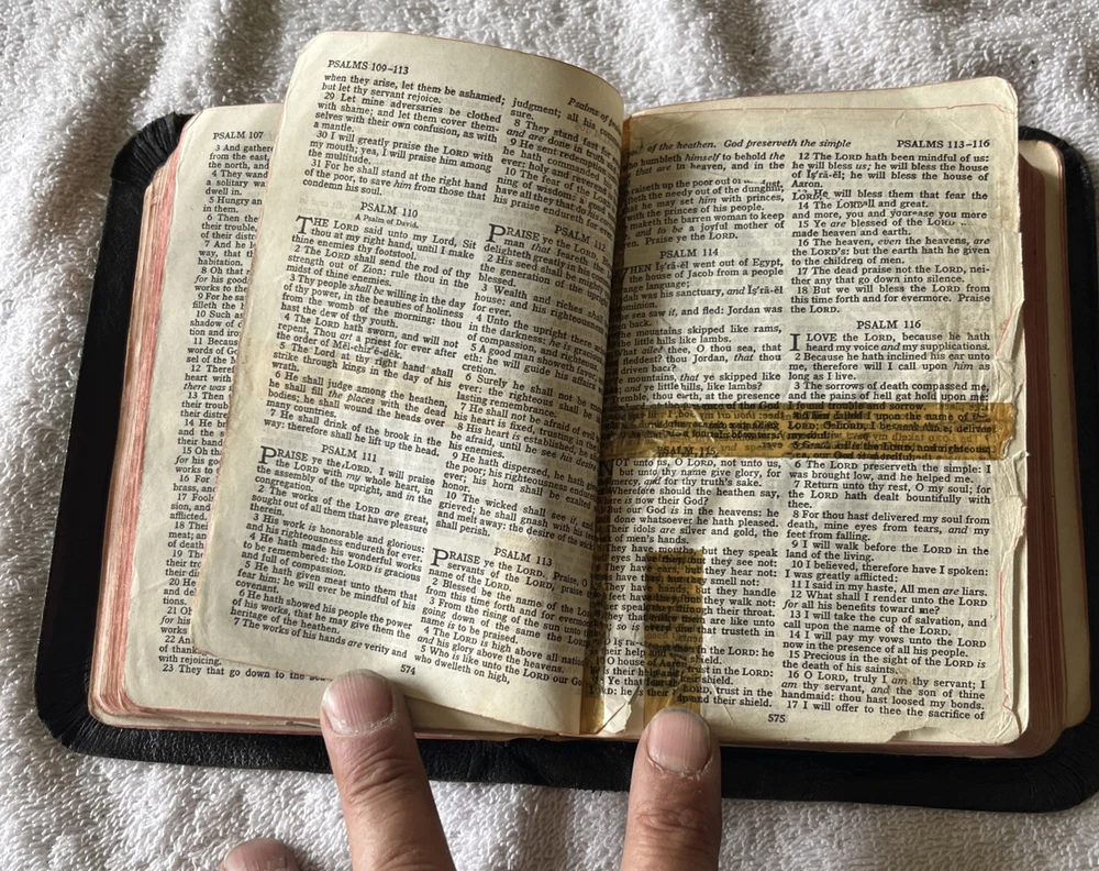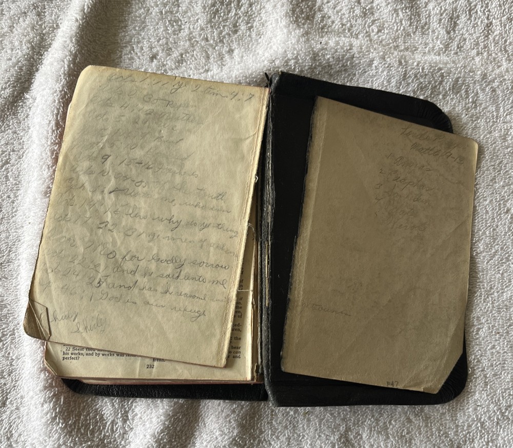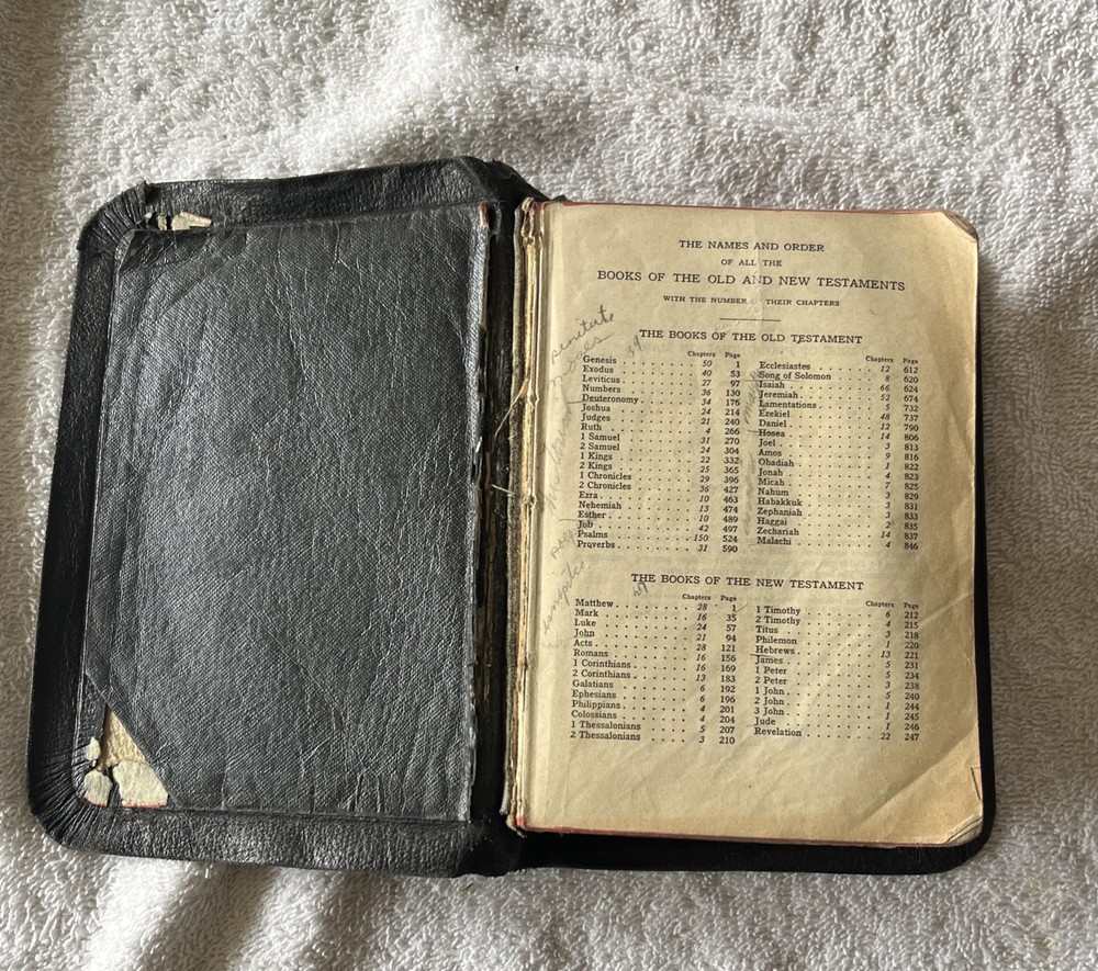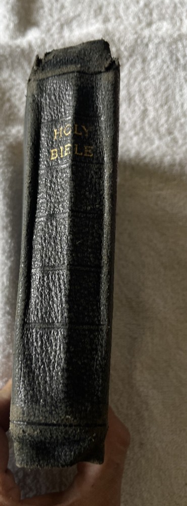 Vintage KJV Holy Bible Leather , In Subpar Condition, Old. Maybe 30’s or 40’s. Some of the pages on the front and back are starting to separate or is separated. There is writing in the book and fixes to pages. See pictures.