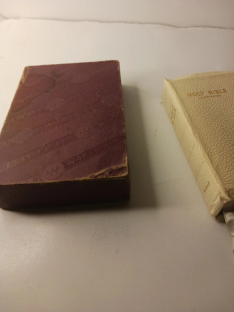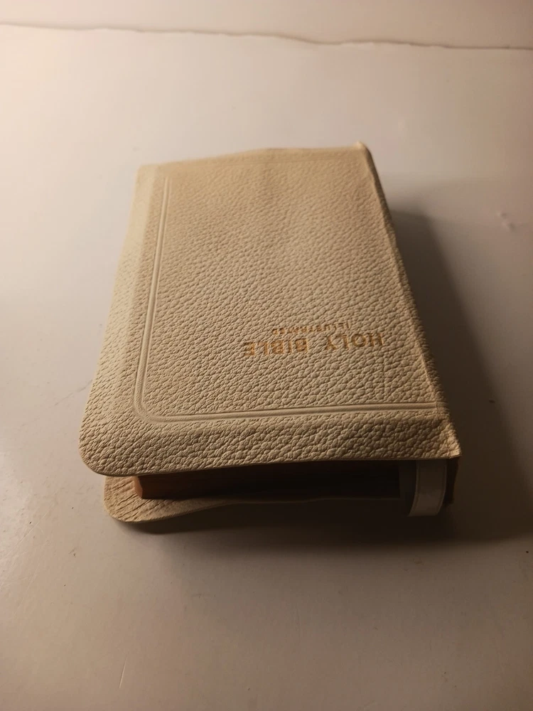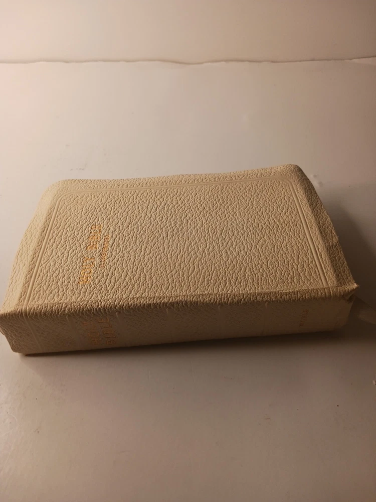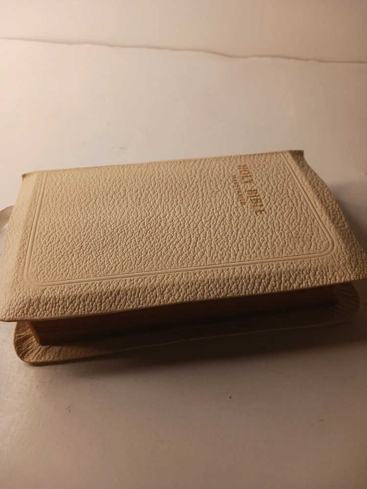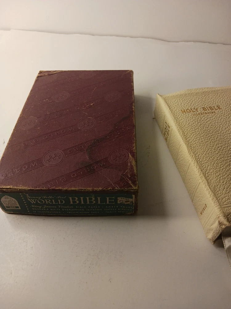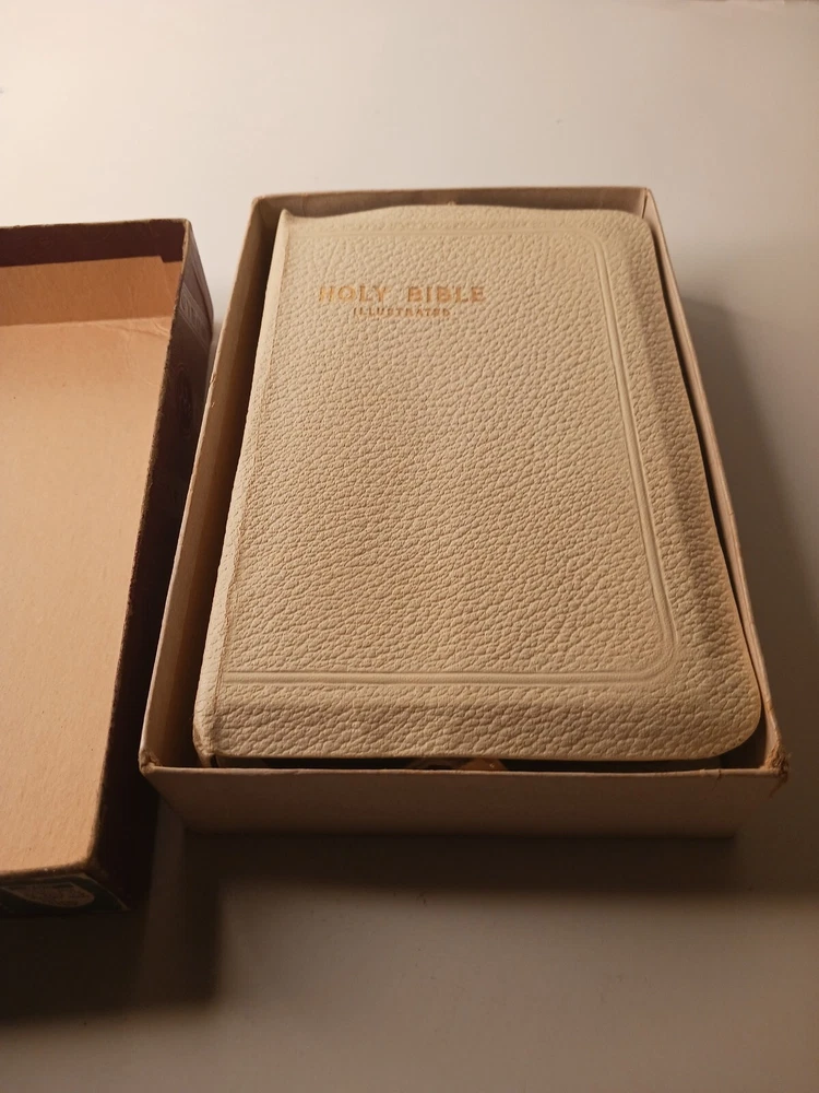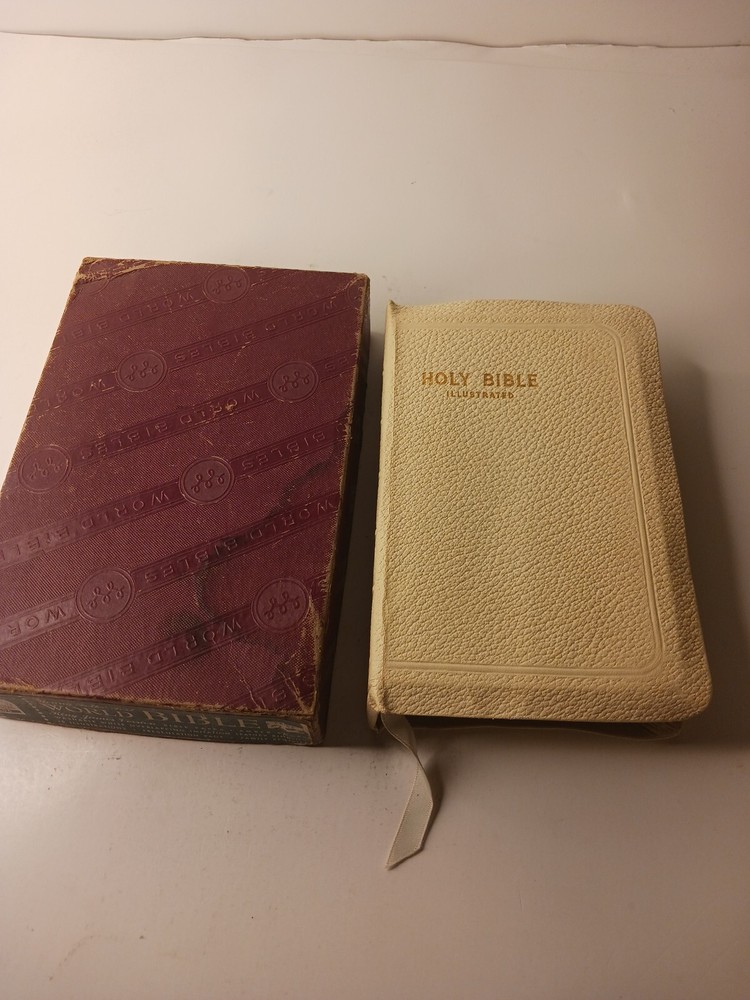Vintage KJV Holy Bible Young Folks Text Imitation White Leather w/ Box. Book has wear. Presentation, birth, marriages and deaths pages have writing. See photos.