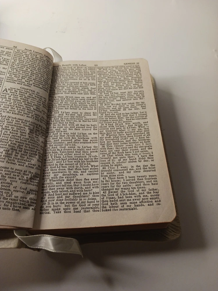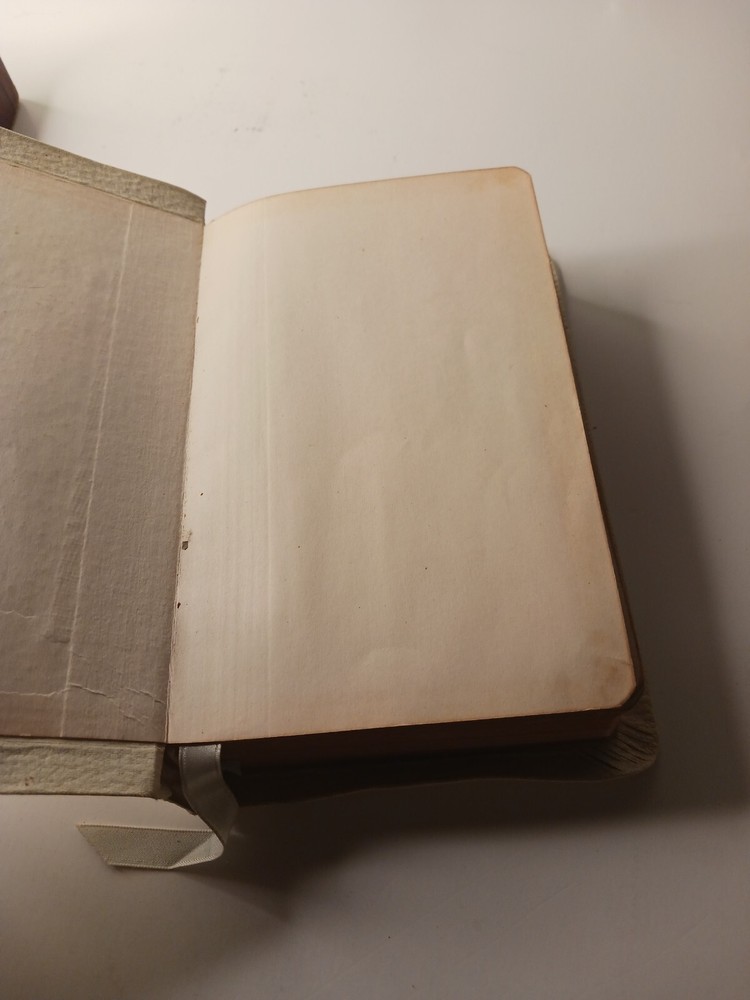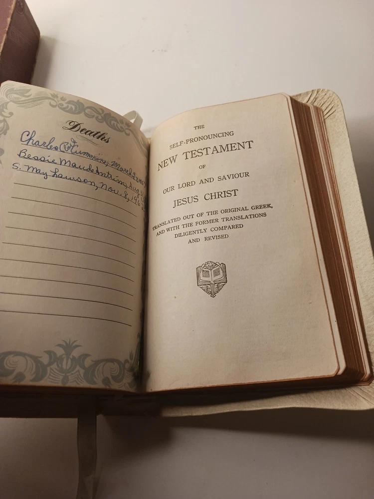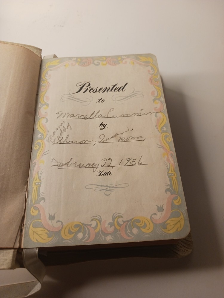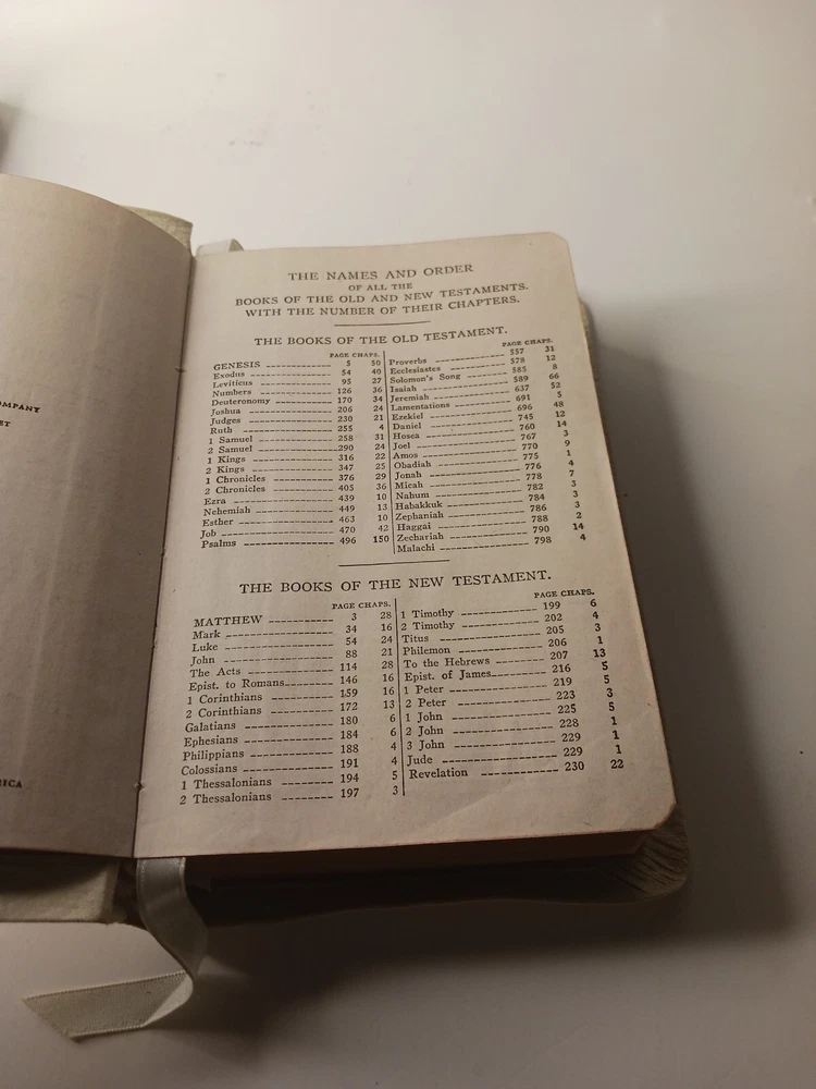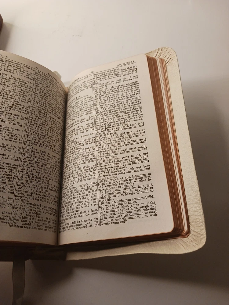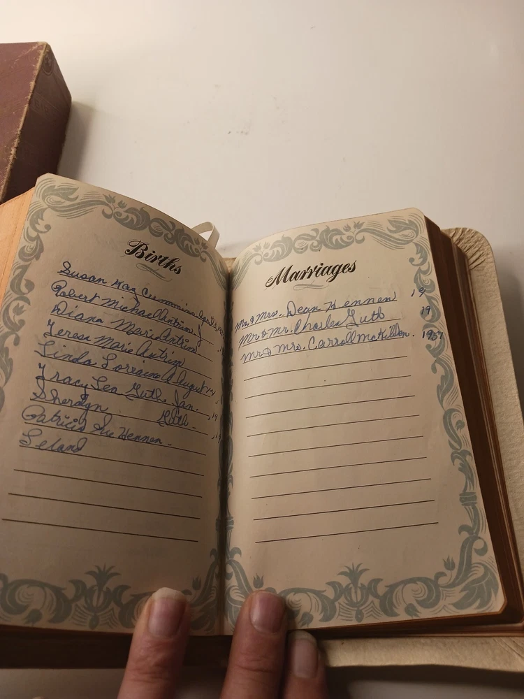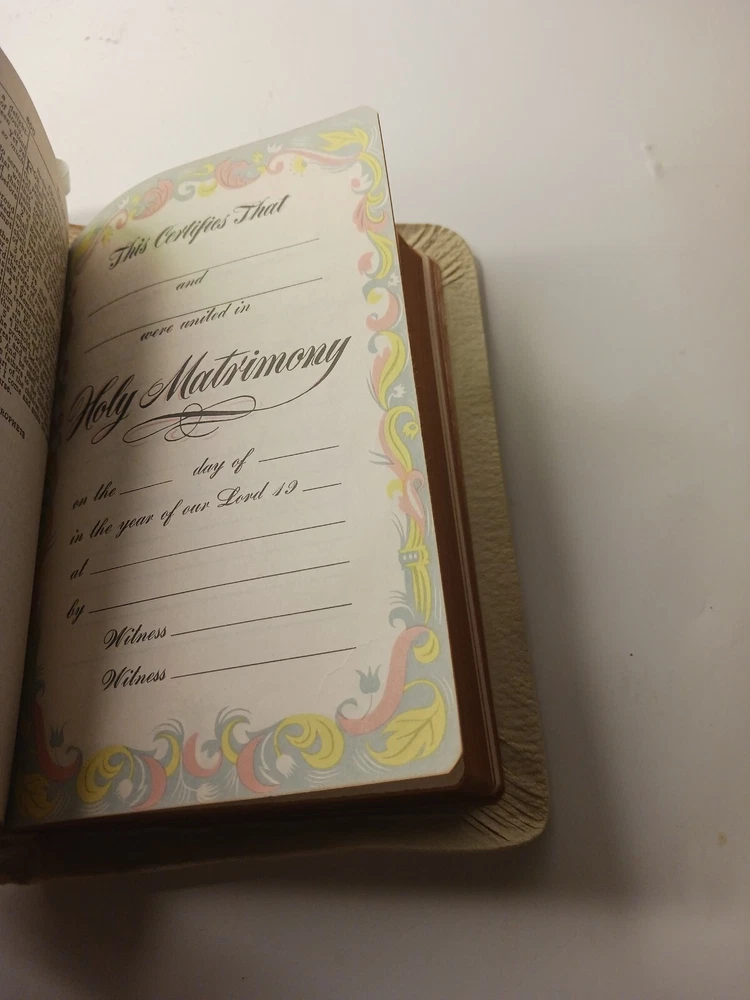 Vintage KJV Holy Bible Young Folks Text Imitation White Leather w/ Box. Book has wear. Presentation, birth, marriages and deaths pages have writing. See photos.