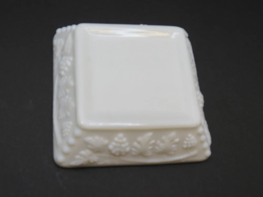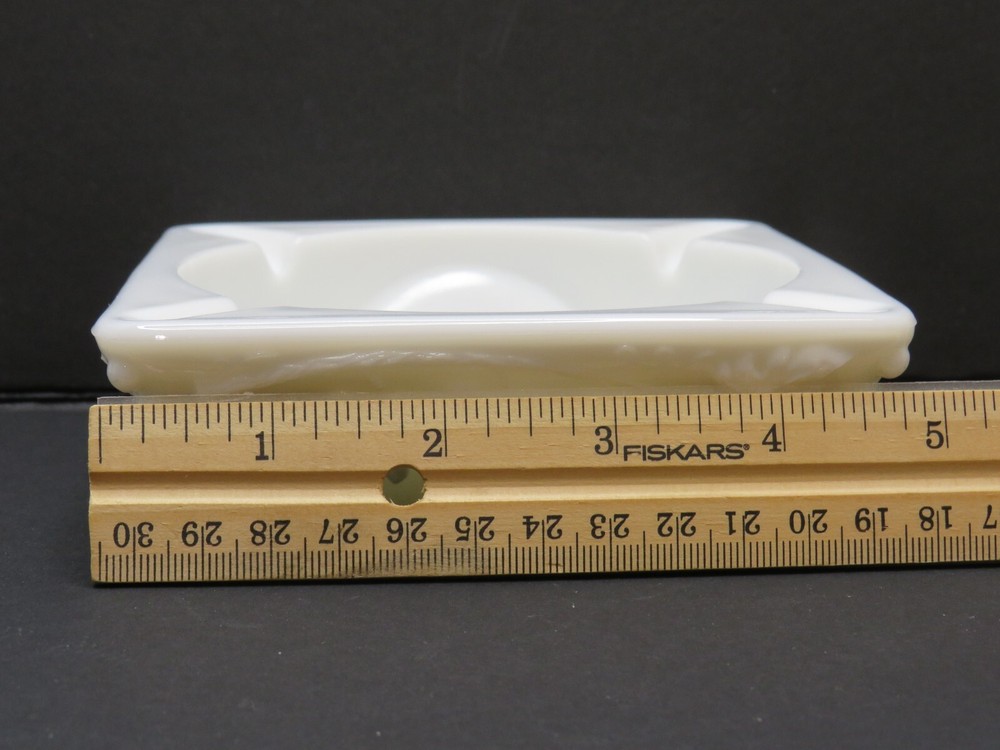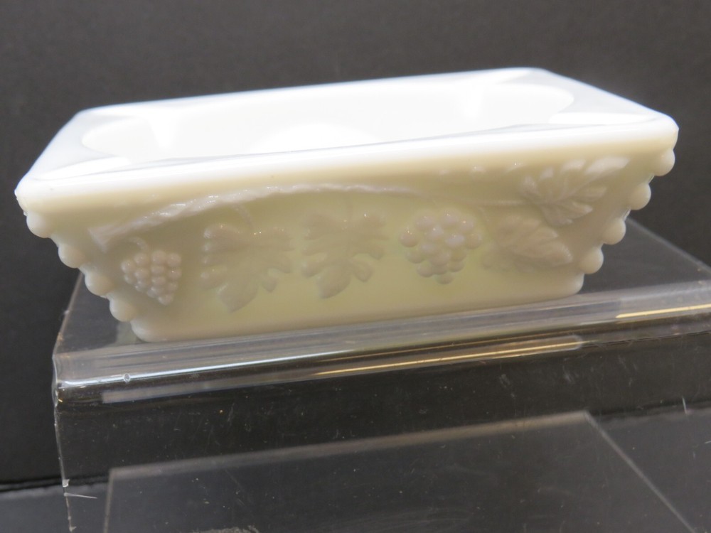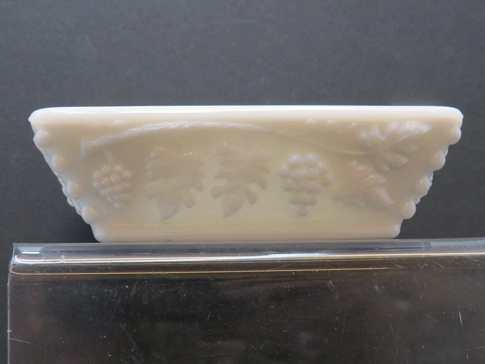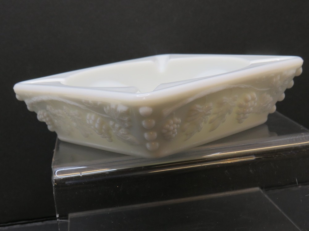 Vintage Milk Glass Ashtray Grapes & Leaves Westmoreland Measures approximately 5" x 5" x 1.5". One small chip (Pictured with pencil). Please inspect pictures and zoom in. Please, if you have any questions, ask before purchasing. If there is a concern or question about your order, please contact us. Thank you for looking!