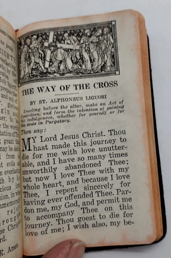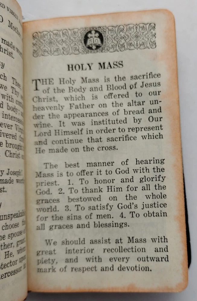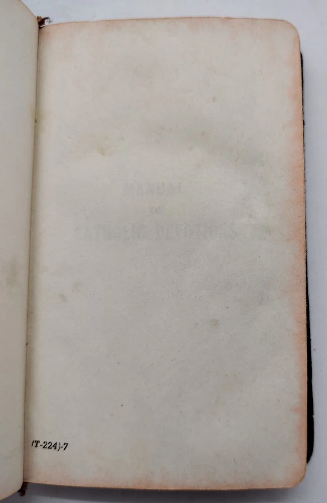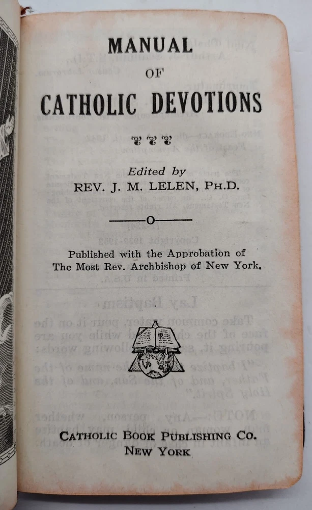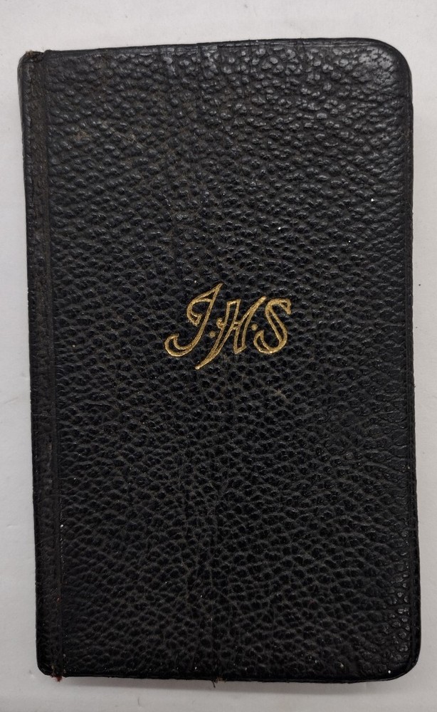Vintage Pocket Manual Of Catholic Devotions, Monogrammed JHS, published in 1952 by Catholic Book Publishing Co. Black genuine leather binding with the monogram of JHS on the front cover. Small, dimensions are about 2.75 by 4.5 inches. Select illustrations throughout the volume. Pages are unmarked. Good used condition for its age, but there are signs of wear including discoloration to pages, worn off gold edging, back page separating from cover, and visible wear/residue inside both front and back cover pages. Please see pictures for more detail.