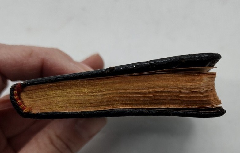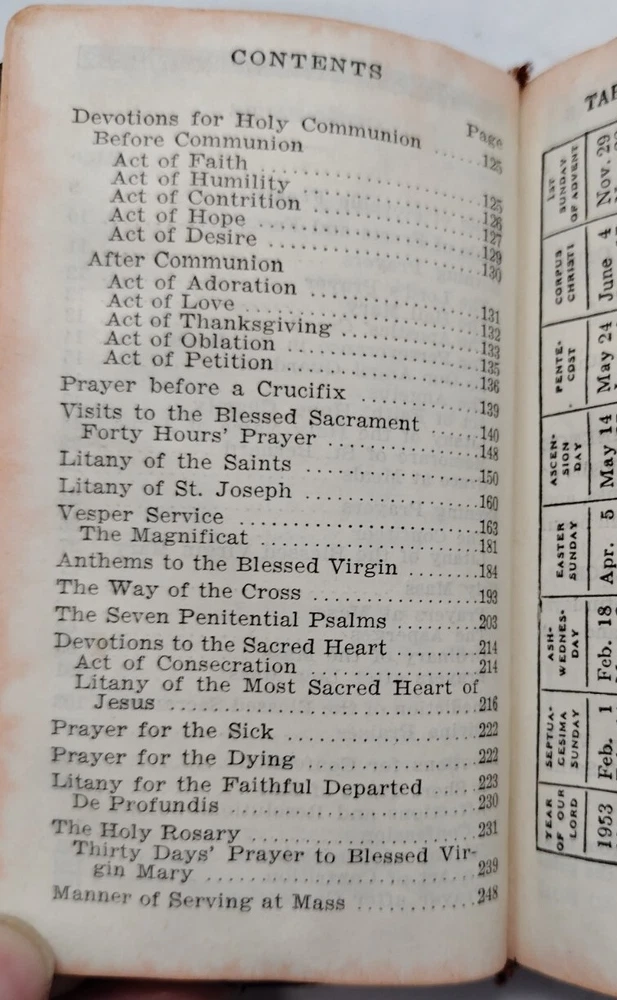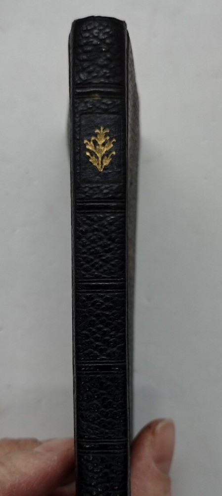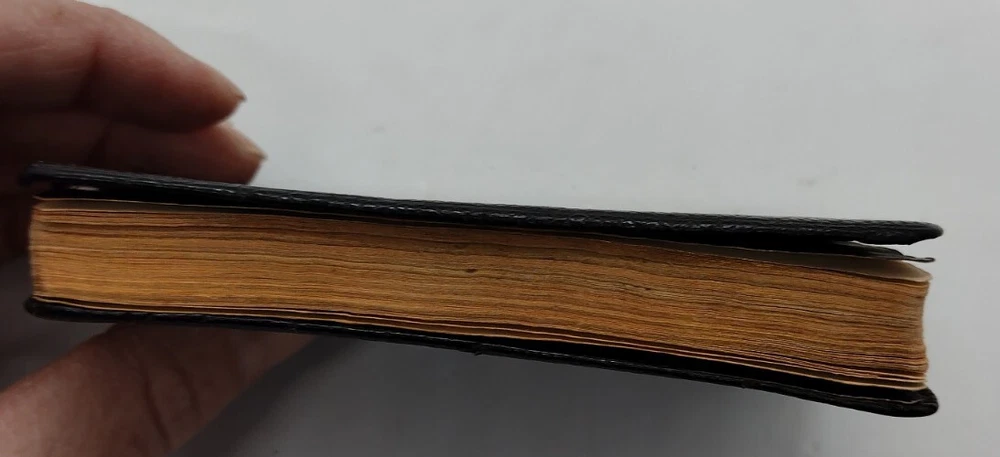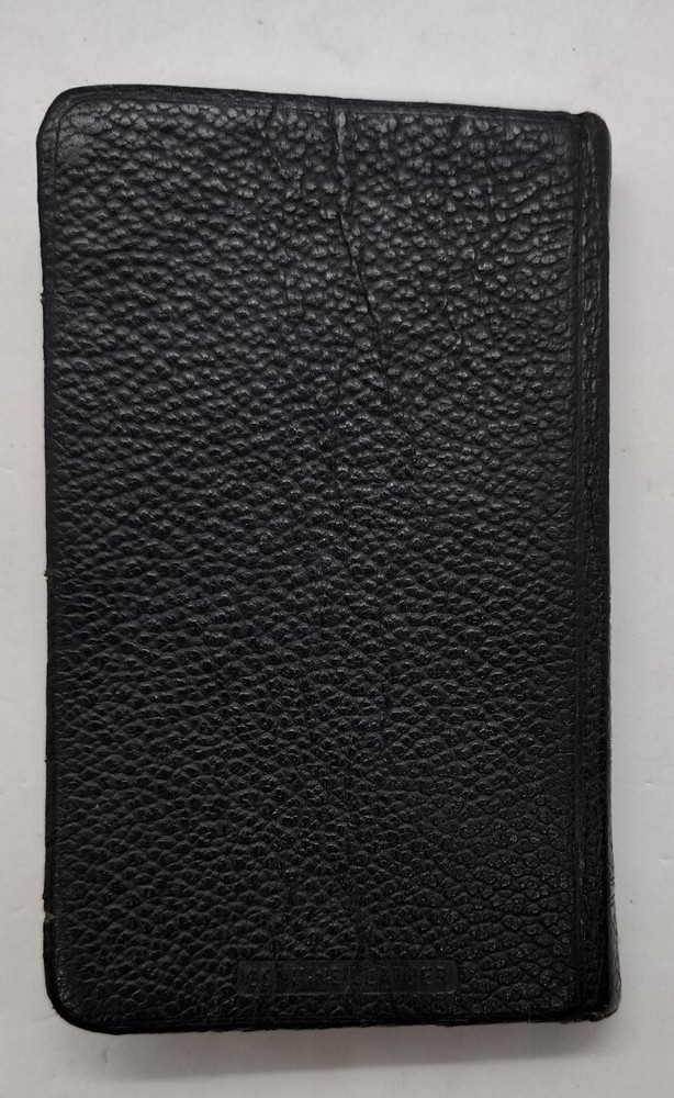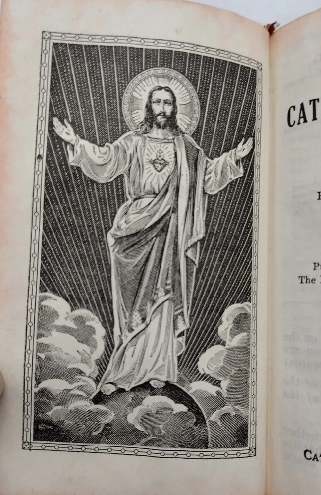 Vintage Pocket Manual Of Catholic Devotions, Monogrammed JHS, published in 1952 by Catholic Book Publishing Co. Black genuine leather binding with the monogram of JHS on the front cover. Small, dimensions are about 2.75 by 4.5 inches. Select illustrations throughout the volume. Pages are unmarked. Good used condition for its age, but there are signs of wear including discoloration to pages, worn off gold edging, back page separating from cover, and visible wear/residue inside both front and back cover pages. Please see pictures for more detail.