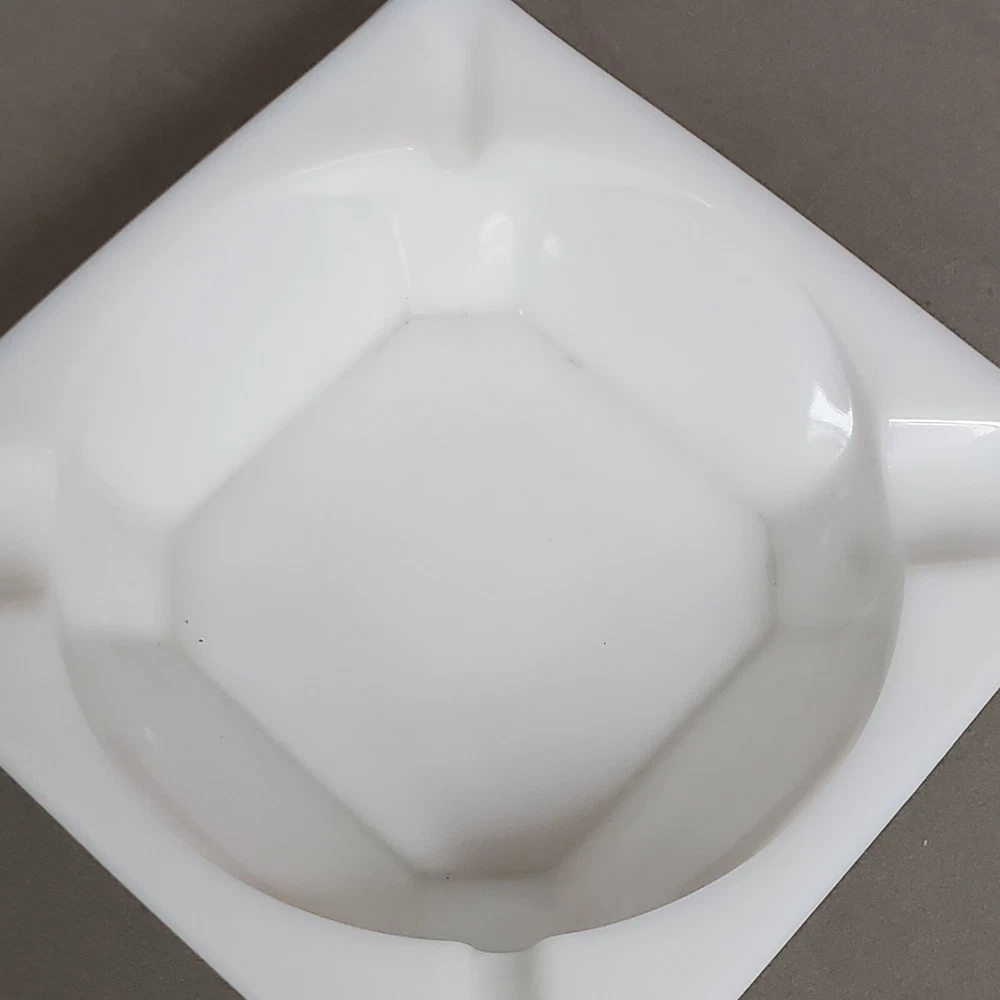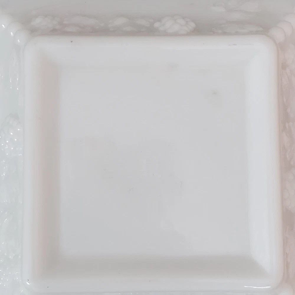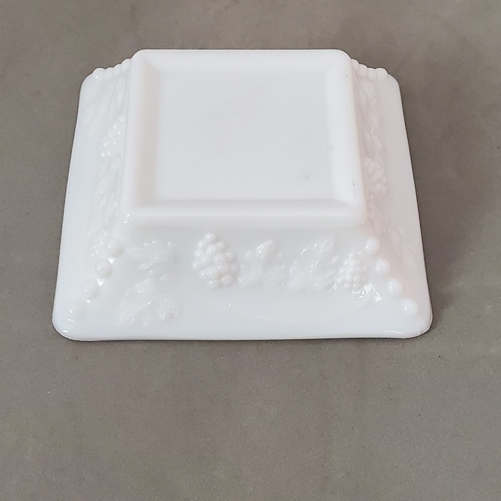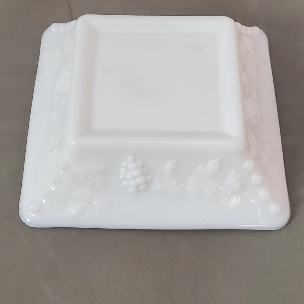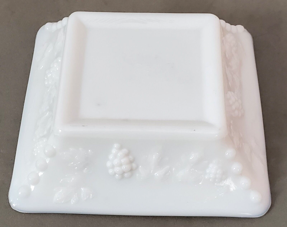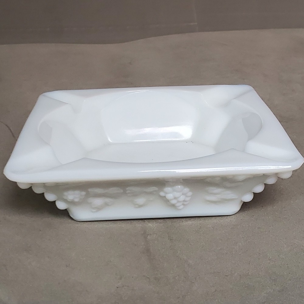This vintage ashtray from WG Westmoreland is a beautiful addition to any collection. Made of white milk glass, it measures 6.5 inches square and features a grape pattern. The weighty feel adds to its appeal, making it a great piece for display or use. The ashtray is a unique find for collectors of tobacciana or just those who appreciate vintage glassware. It was made in the United States and is not handmade or modified. A great piece to add to any ashtray or collectibles collection. Vintage item with no cracks, chips or damage. Please review all photos for condition and message with any questions.