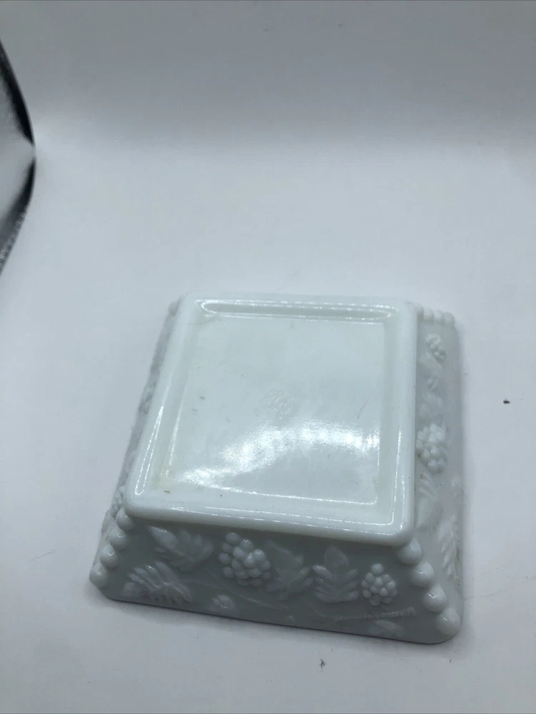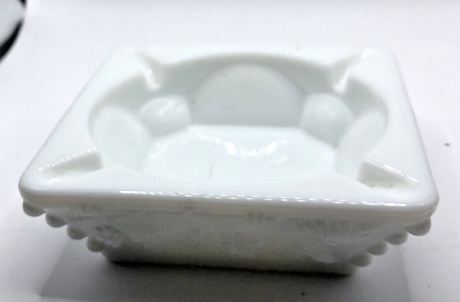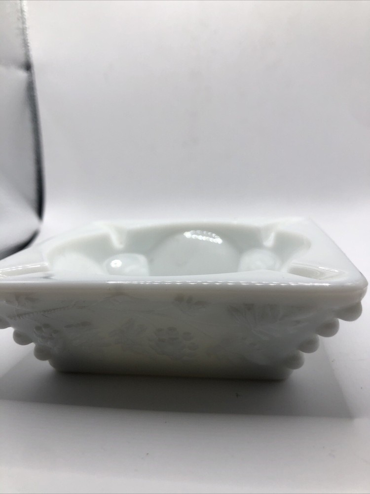 The Vintage Westmoreland Authentic White Milk Glass Ashtray with Raised Grapes is a collectible piece from the United States. This ashtray is a unique unit featuring a design of raised grapes, adding a decorative touch to any room. Perfect for collectors of tobacciana or vintage items, this ashtray is a charming addition to any collection.