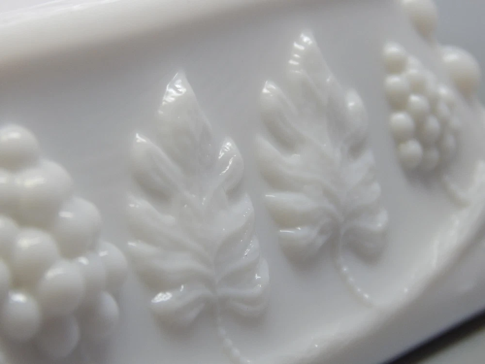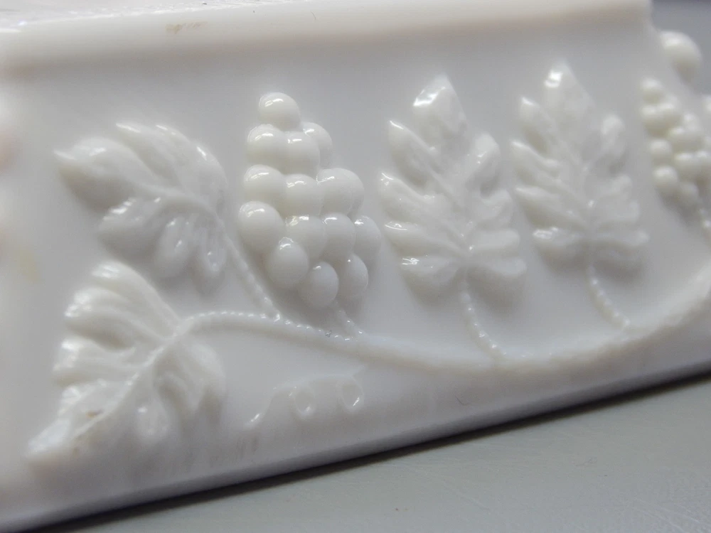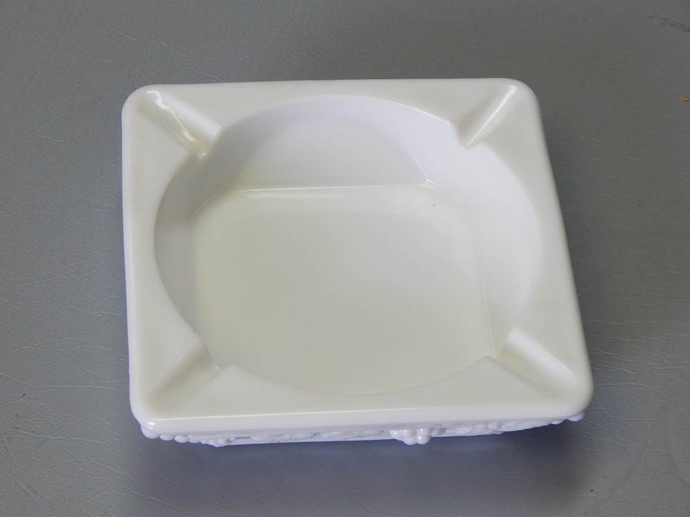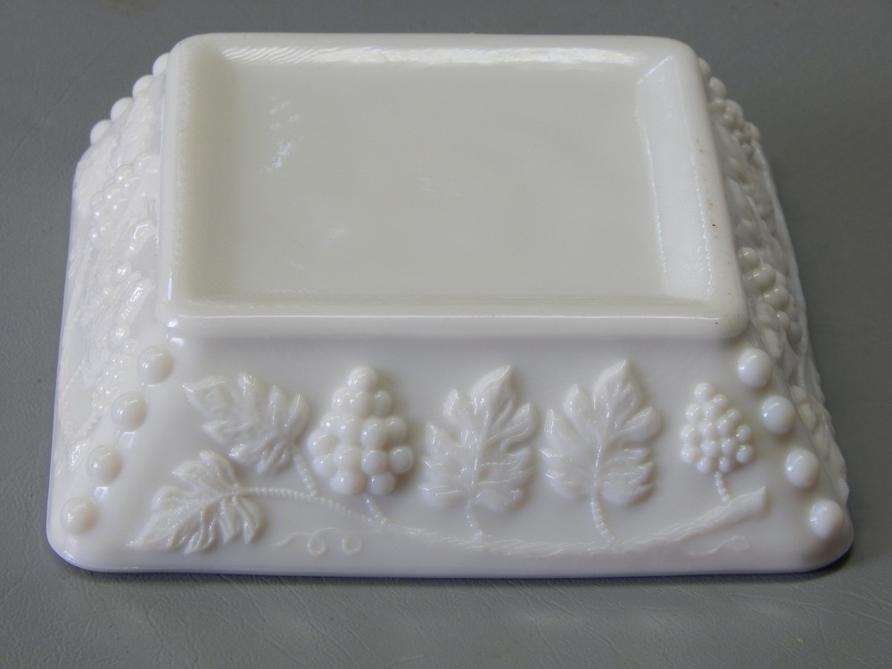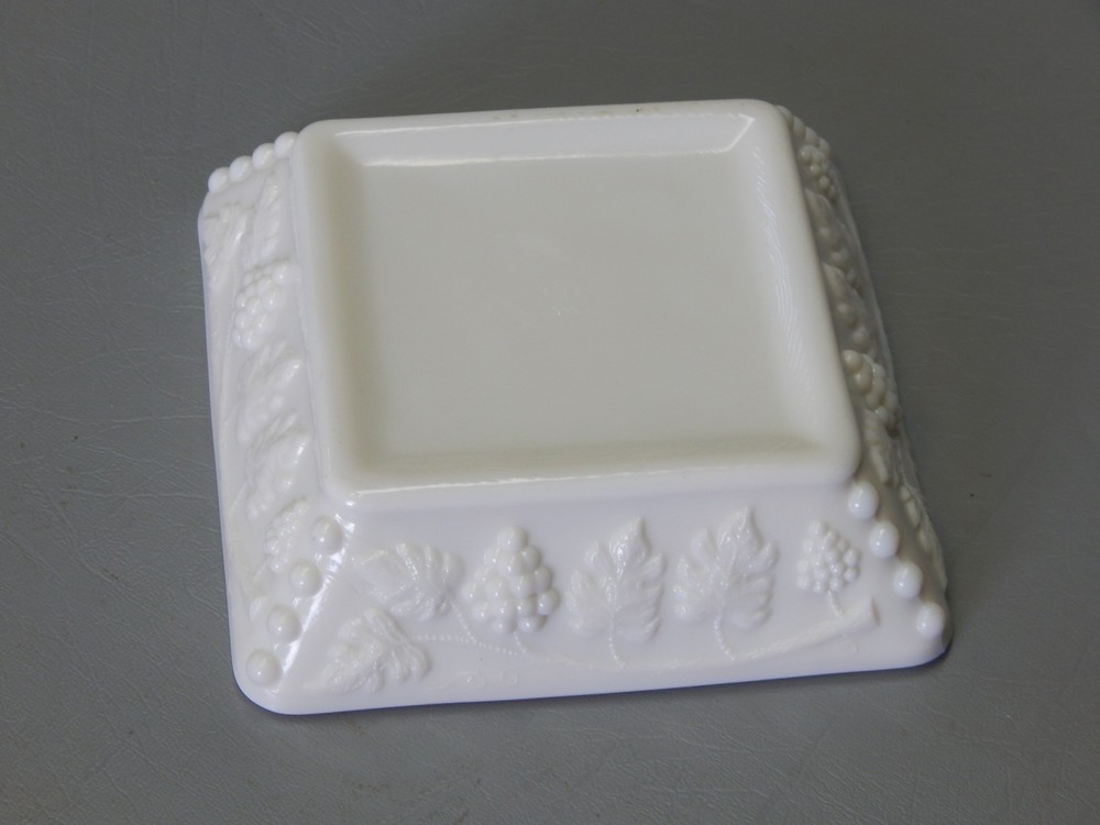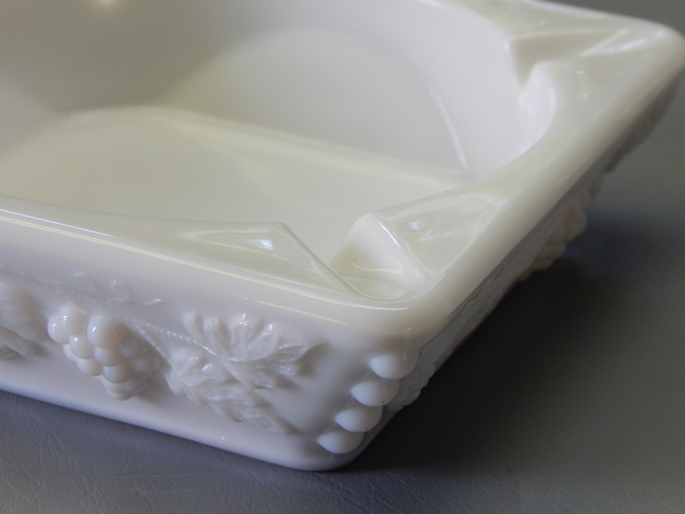 This vintage milk glass ashtray is in the "Beaded Paneled Grape" pattern by the Westmoreland Glass Co. Base of ashtray has the embossed "WG" mark. Ashtray measures 4" square x 1 1/4". Wonderful condition. No chips or cracks. Mint . 30 day returns accepted with full refund of purchase price no shipping costs refunded must notify seller within 24 hrs to report reason for return