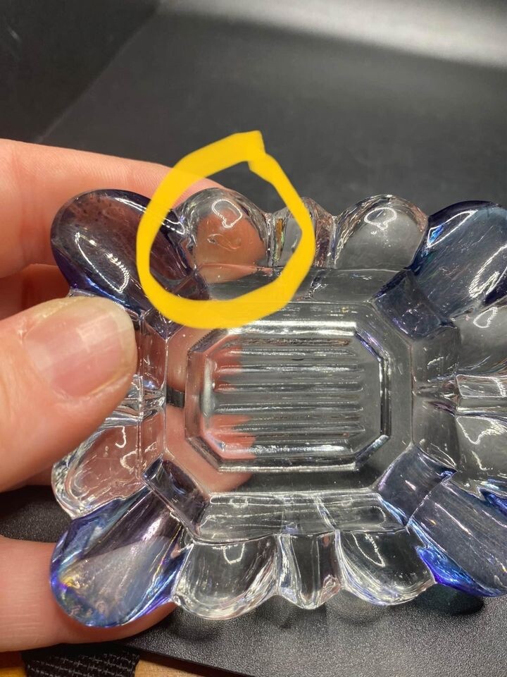 This is a small ashtray from the 1950's, about 2.5 x 3". The glass is beautiful and glowing with royal blue at the corners. Good Vintage Condition. Rare find!