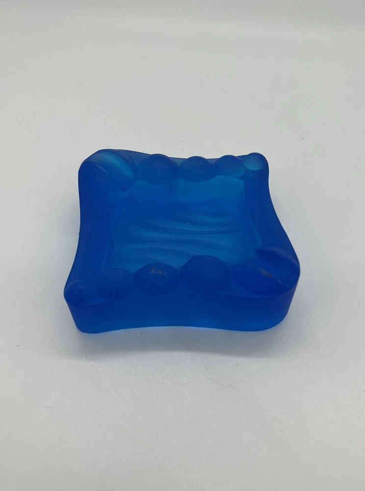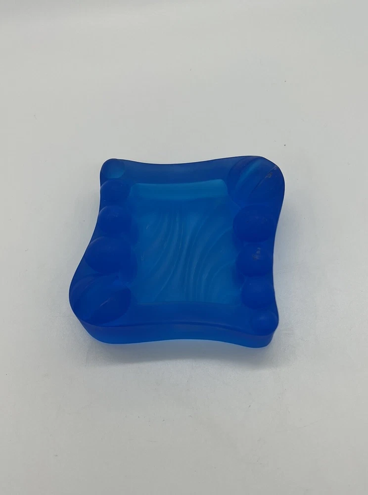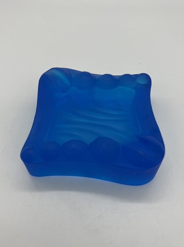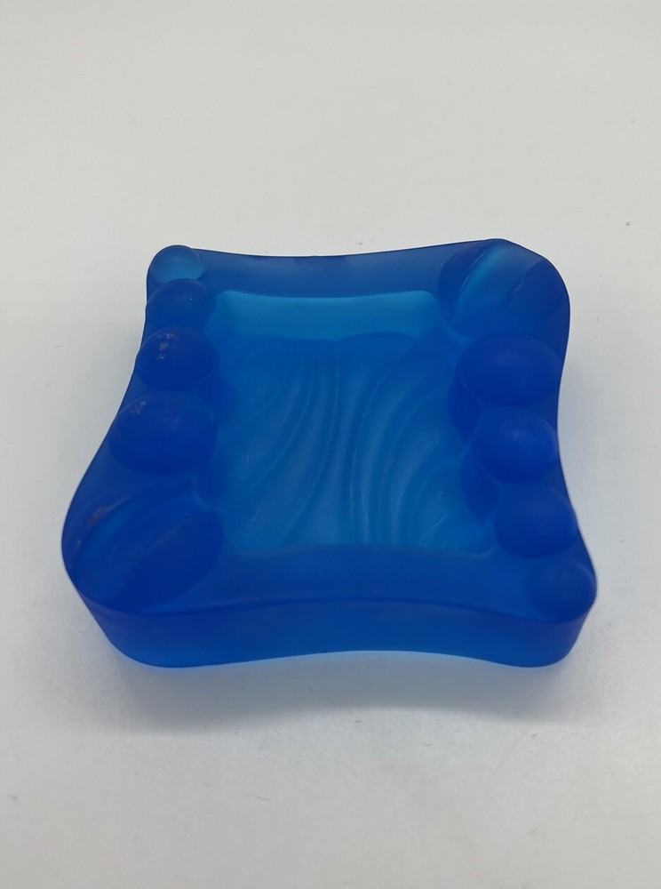 Add a touch of vintage to your space with this stunning Westmoreland glass ashtray. The square-shaped ashtray features a beautiful blue color with an art deco design that is sure to catch your eye. Measuring 3 1/2 inches in length and width, and 1 inch in height, this ashtray is suitable for cigarette use, as a trinket dish, or display. The piece is an original, with an impressed backstamp, and was produced in the United States in the 1920's-30's. Crafted with high-quality glass material, this ashtray is not only functional but also adds a touch of elegance to your living space. The matte finish and bubble/wave design make it a unique piece of art glass that will impress anyone who lays their eyes on it. This vintage ashtray is a must-have for antique collectors and art deco enthusiasts alike. Excellent condition. No chips or cracks.