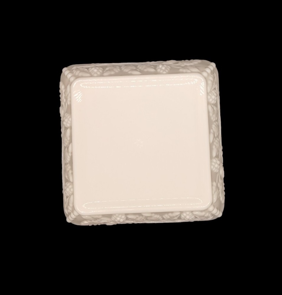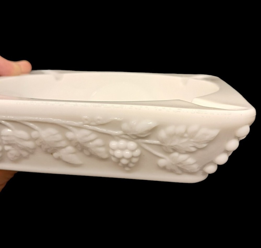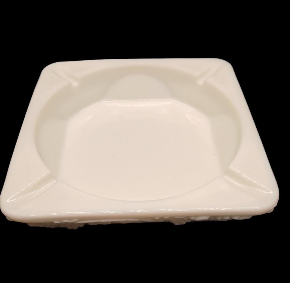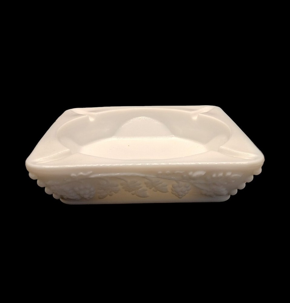 This is a vintage Westmoreland milk glass ashtray. It features a square shape with a paneled grape vine design and measures 6.5 inches in length and width. It's in very good condition with no chips or cracks.
