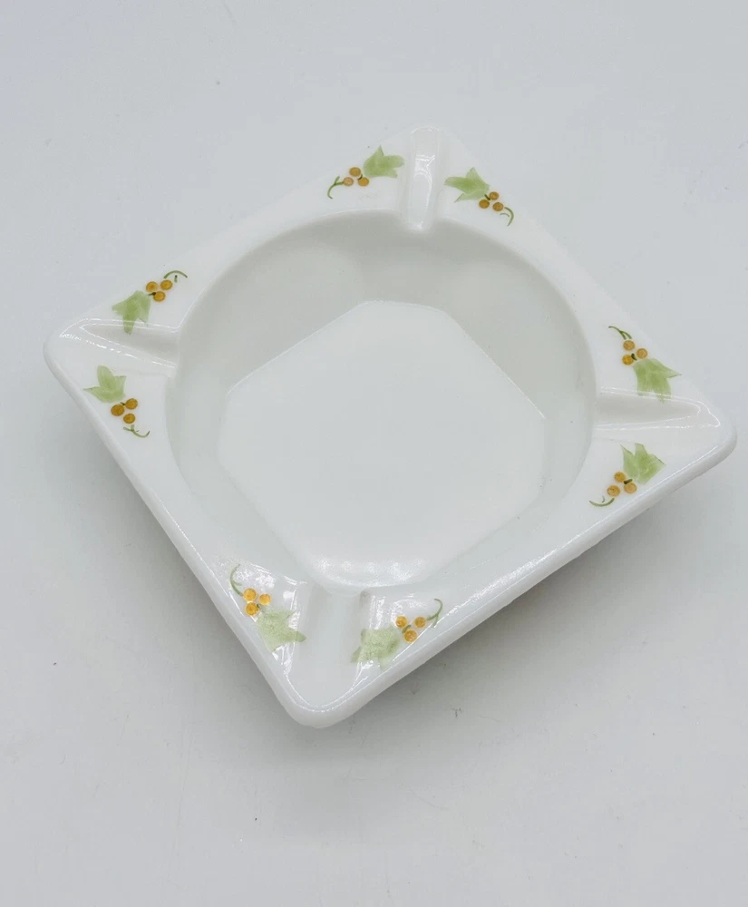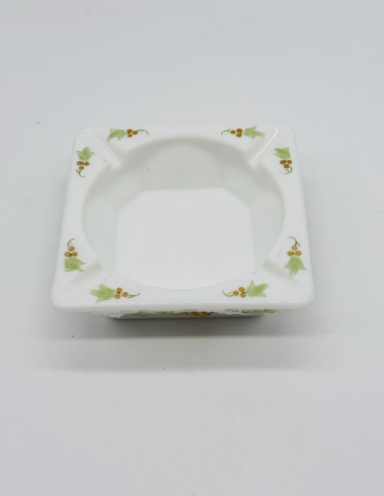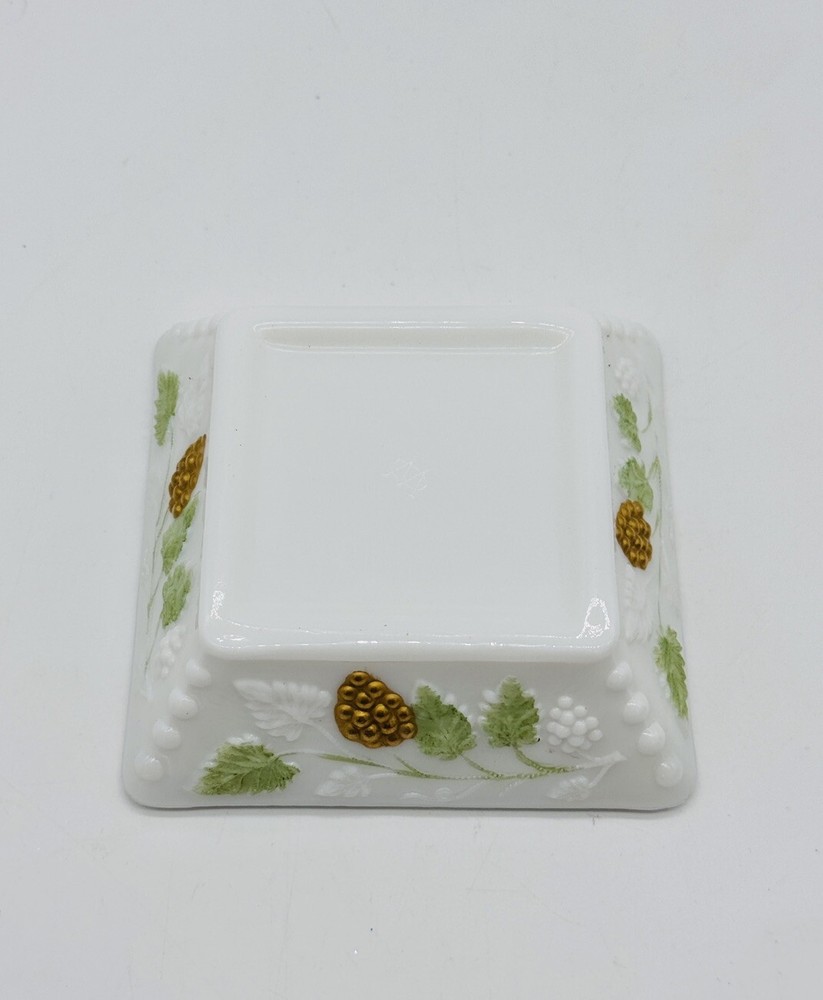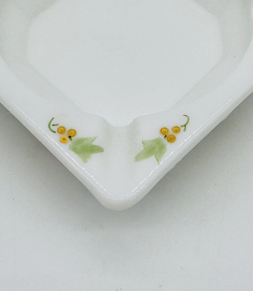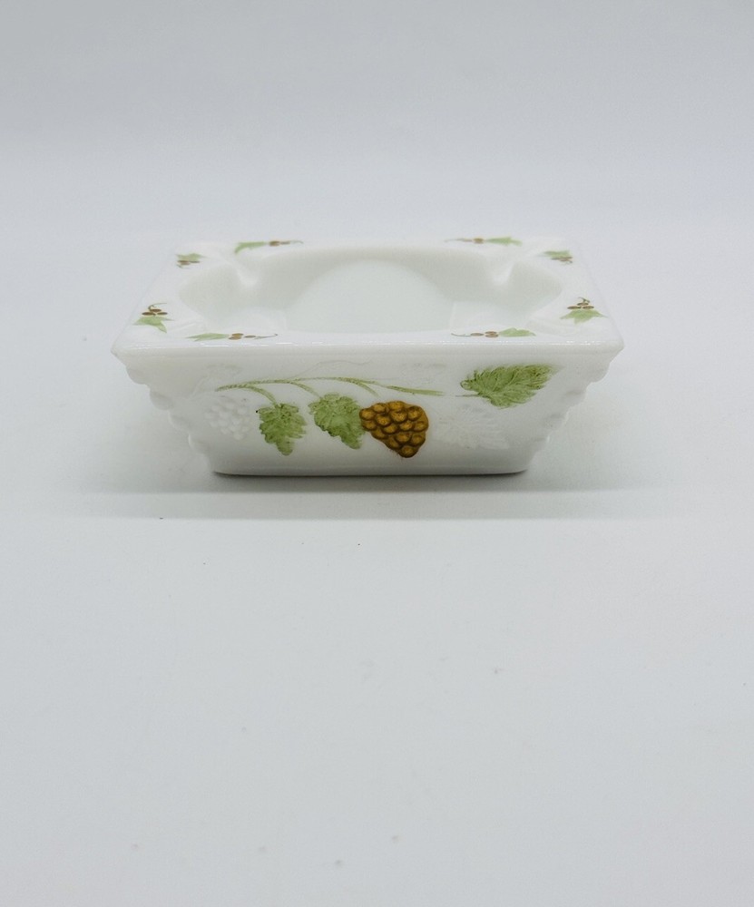 Vintage Westmoreland Milk Glass Ashtray with Hand-painted Gold Grapes & Green Leaves. Measures 4". Preowned in very good condition.