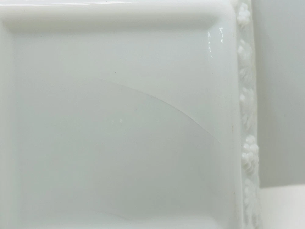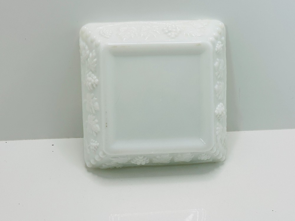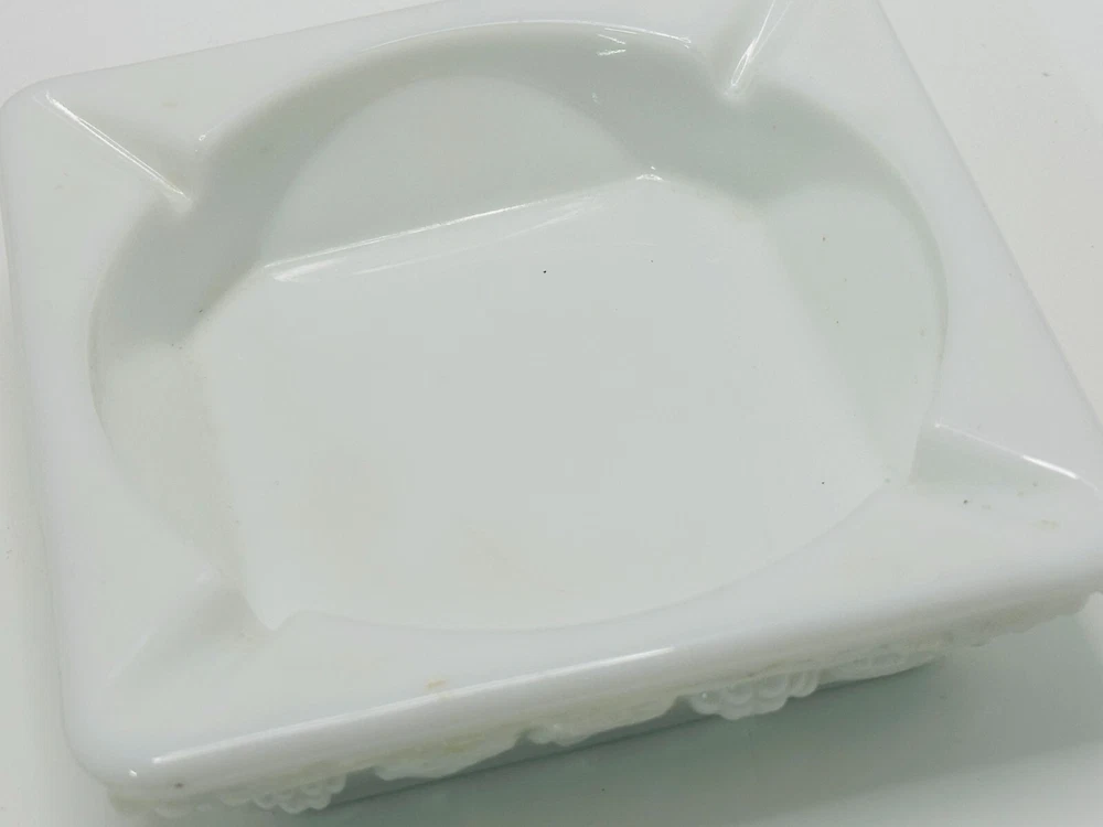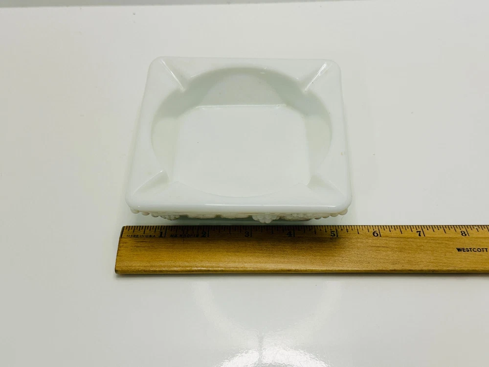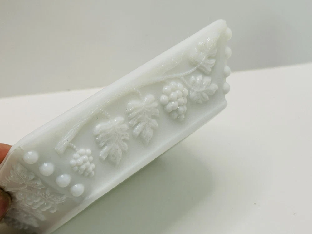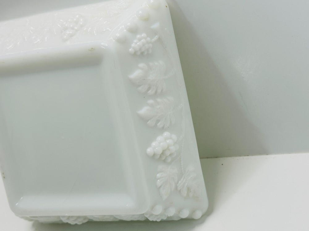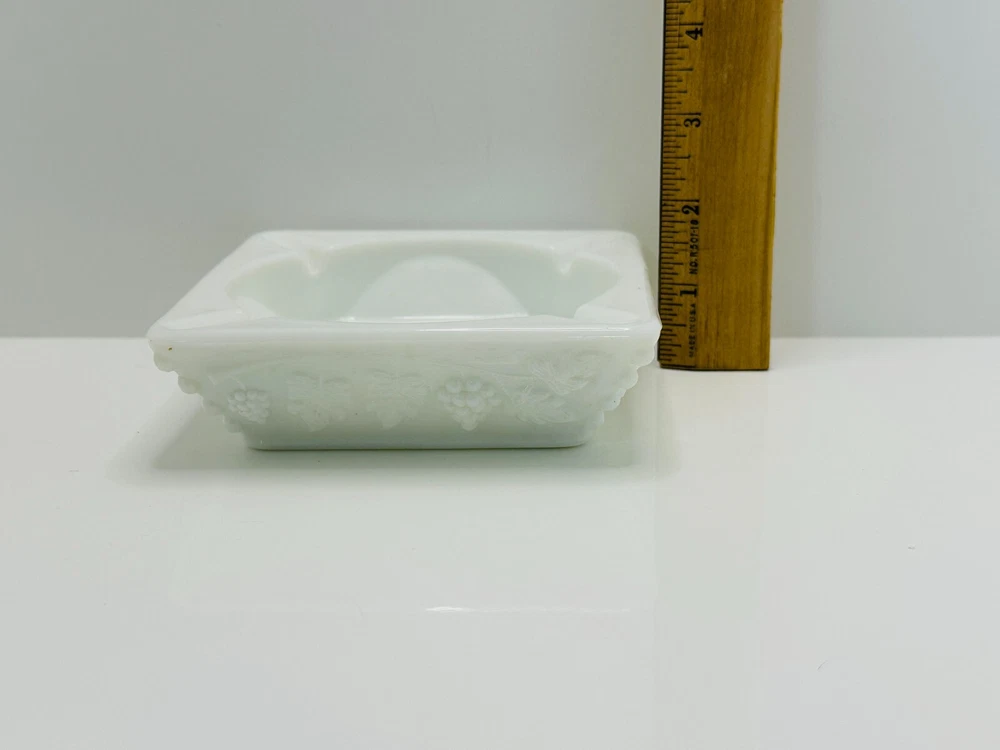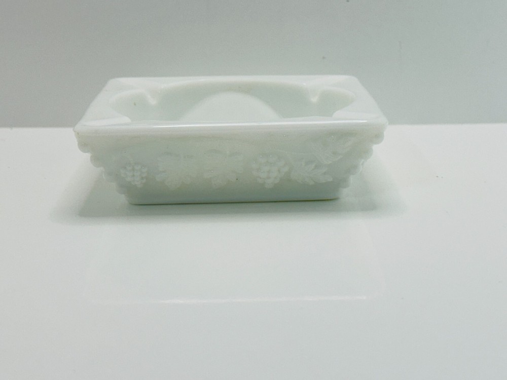 Vintage Westmoreland Milk Glass Ashtray With Grape Vine Design Overall this piece is in really good shape. there are some spots that kind of look like its cracked but its not fully cracked or noticeable unless you look at it at a certain angle. i took some photos of it so please refer to the photos for the best description on condition and size. If you have any questions feel free to send me a message and i will get back to you as soon as i can. Thank you.