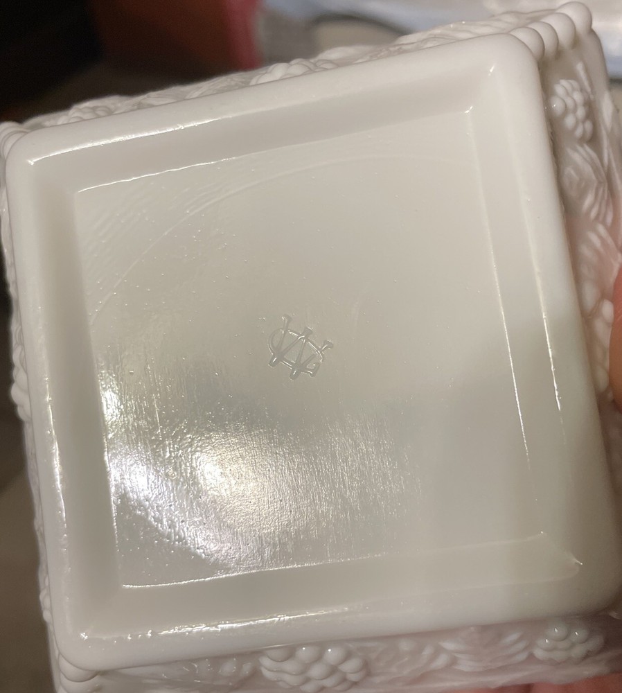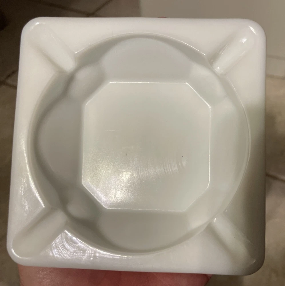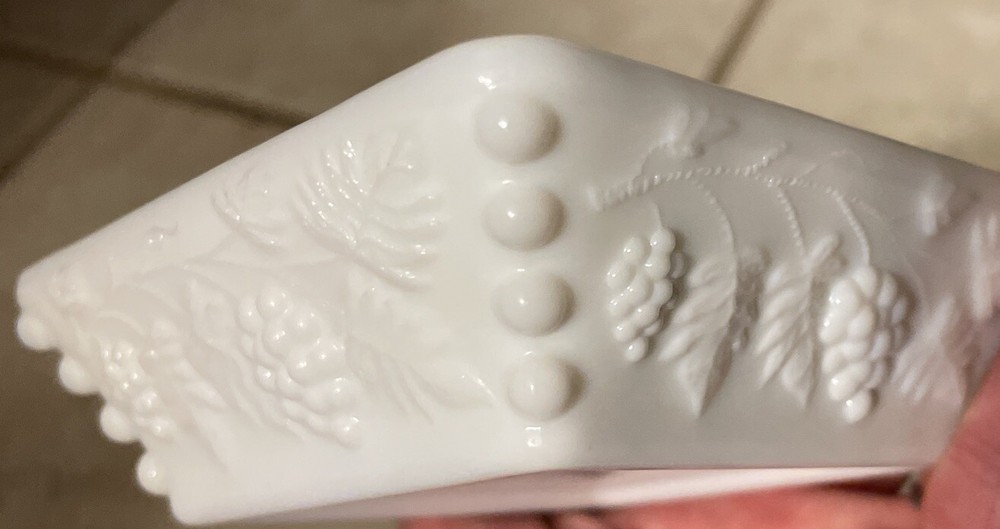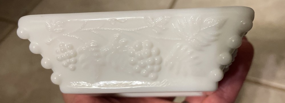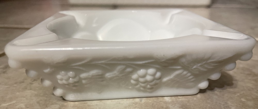 This ashtray is used. There is a very tiny chip in top inside edge. See pictures. This vintage Westmoreland milk glass ashtray features a beautiful grape pattern on a square shape and is 4 inches in width. Made in the United States as part of the Paneled Grape product line, this elegant glass ashtray is perfect for holding cigarettes. The white color and intricate design make it a great addition to any decorative pottery and glassware collection. The ashtray is in good condition and ready for use.