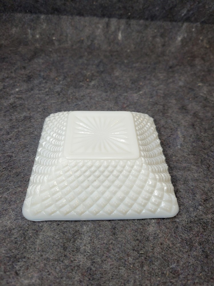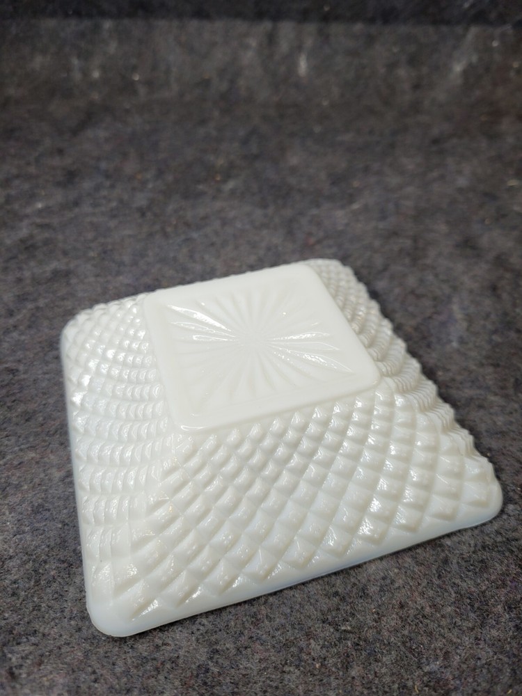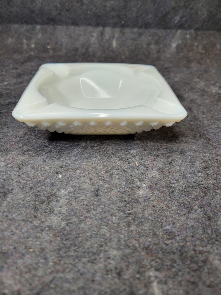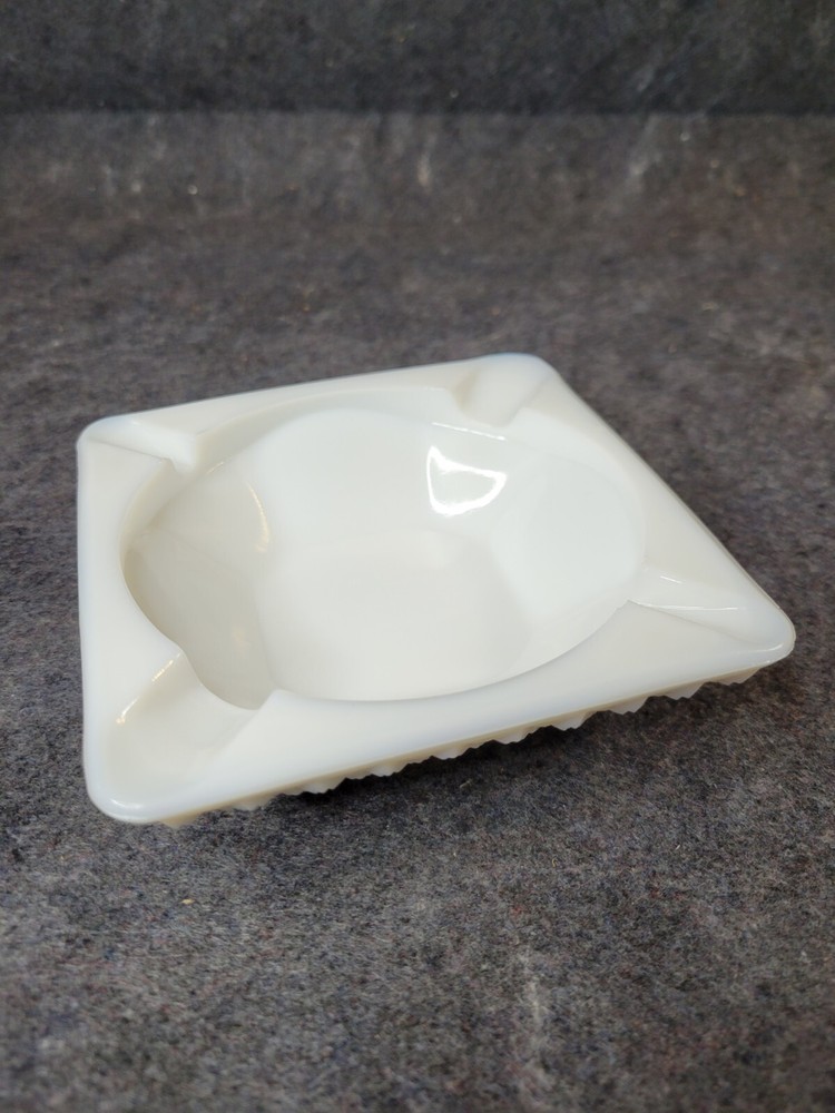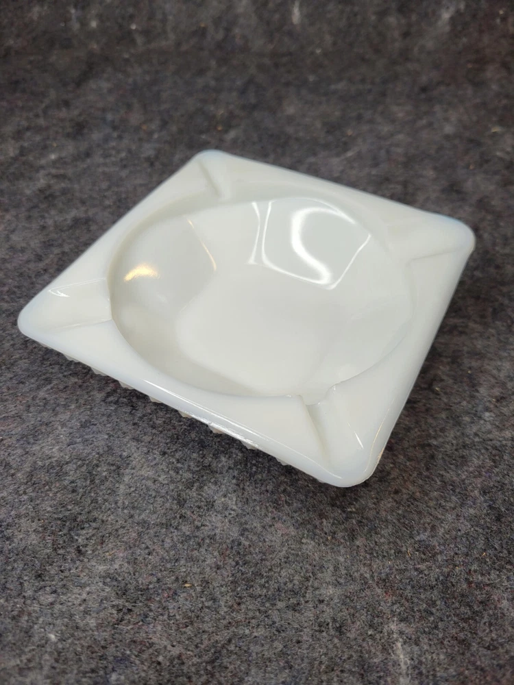 The Vintage Westmoreland Milk Glass Cigar/Cigarette Ashtray is a stylish and elegant piece of mid-century modern decor. Made of white milk glass with a glossy finish, this original ashtray features a sleek design suitable for holding cigarette or cigar ashes. With its compact dimensions of 1.36" height and 4.63" and 4.5" length and width respectively, this ashtray is a practical yet fashionable addition to any vintage-inspired living space. The Westmoreland brand ensures quality and craftsmanship in this classic glassware piece.