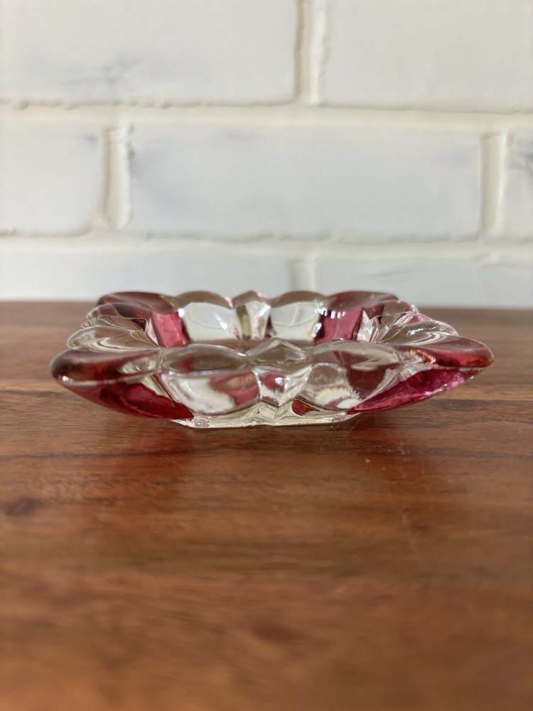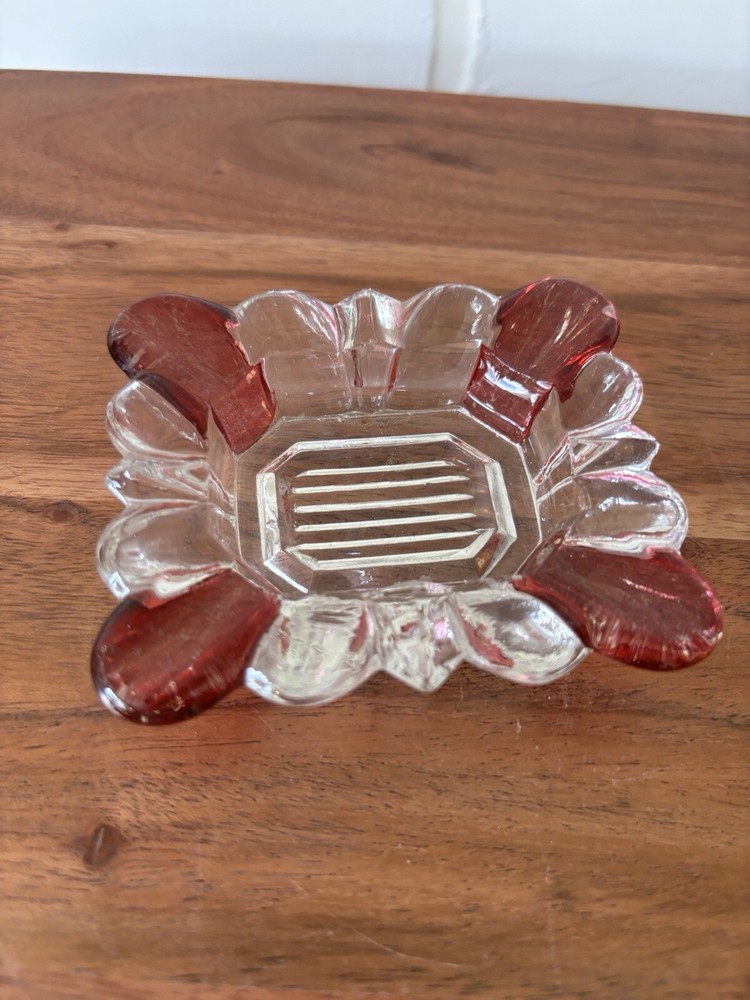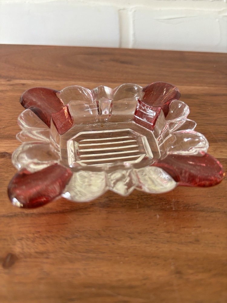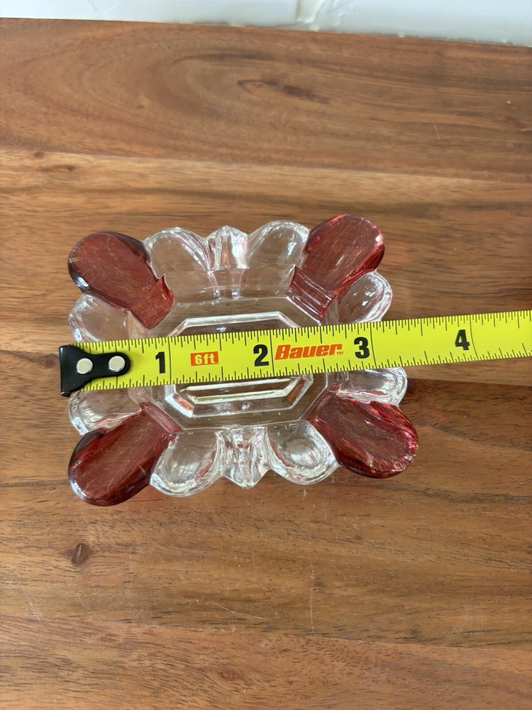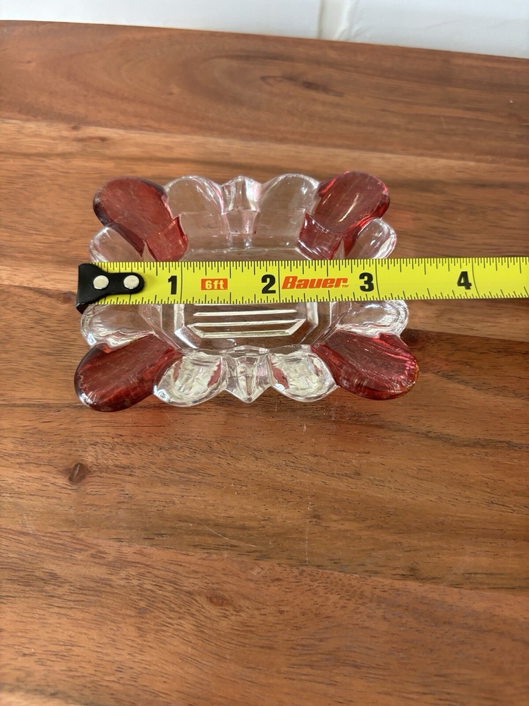 This vintage Westmoreland ashtray is a beautiful addition to any collection. With its elegant red and clear glass design, it is sure to catch the eye. The small size and rectangular shape make it perfect for displaying on a shelf or using for storing small trinkets. Crafted with high-quality glass materials and produced using fused glass techniques, this antique original is a true gem. The Westmoreland brand is known for its exceptional quality and attention to detail, making this ashtray a must-have for any fan. Whether you're a collector or just looking for a unique piece to add to your home, this vintage ashtray is sure to impress.