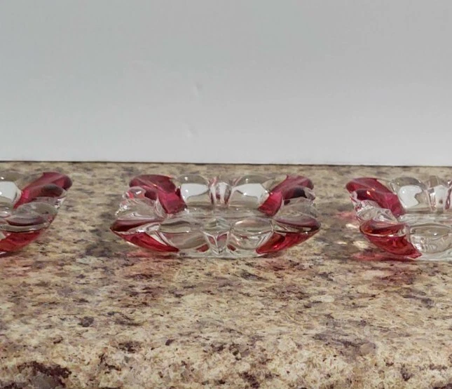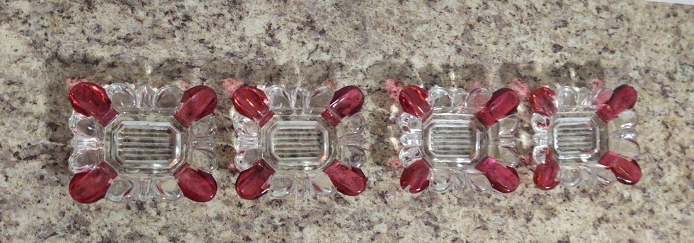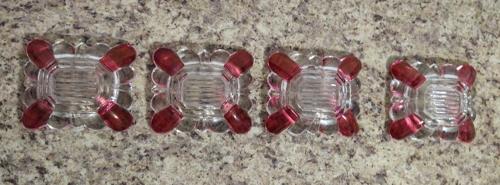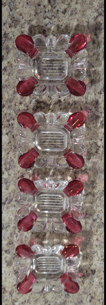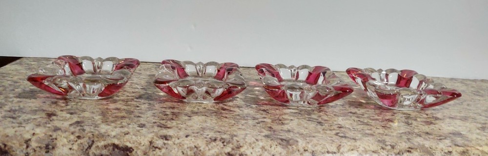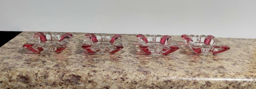 Add a touch of vintage elegance to your home with this set of four small ashtrays from the Westmoreland brand. The clear glass is beautifully contrasted with ruby flashing, making it a great addition to any collection. The ashtrays are made of high-quality glass and have been expertly fused to create a stunning piece. These antique ashtrays are perfect for collectors of elegant glassware and would make a great gift. The product line is unique, and the production technique used is of the highest quality. The ashtrays are in excellent condition, making them a great addition to any home or collection. Slight chip on one corner of one of the pieces LISTING SOLD AS IS AS SEEN IN PHOTOS USE THEM FOR ANY MAKE MODEL CONDITION OR ANY OTHER DETERMINATION