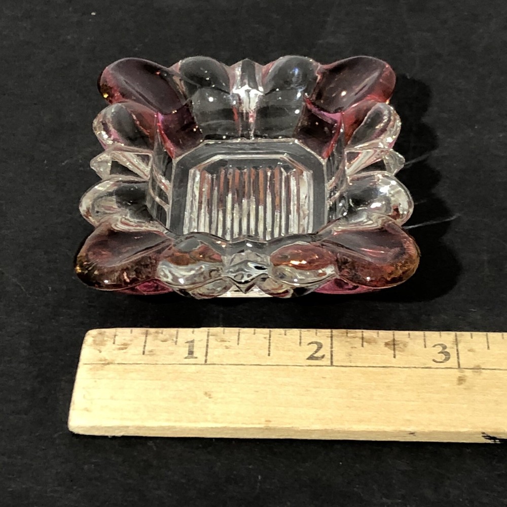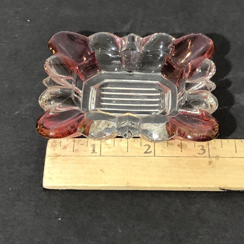 This vintage ashtray is a stunning piece of art deco style glassware. Its shape is a rectangular trinket dish with a ruby red and clear flashed glass design. The item's dimensions are 3.25" in length, 2.25" in width, and .75" in height. The ashtray is perfect for collectors or anyone looking to add a unique piece to their home decor. Its color, style, and material make it a great addition to any display or collection.