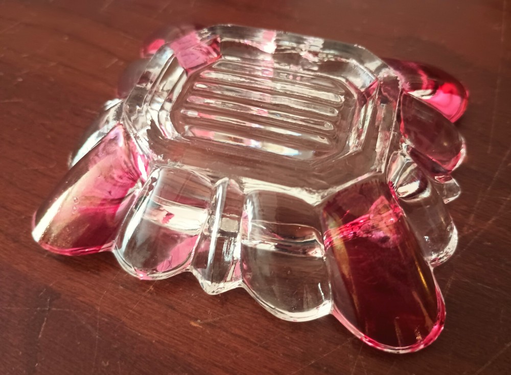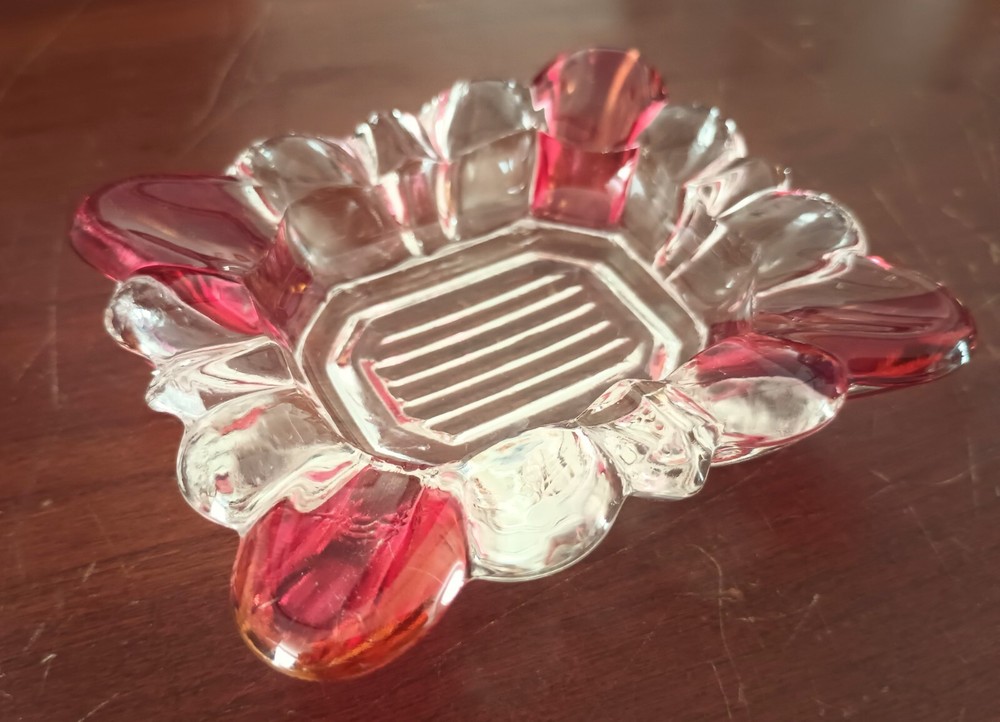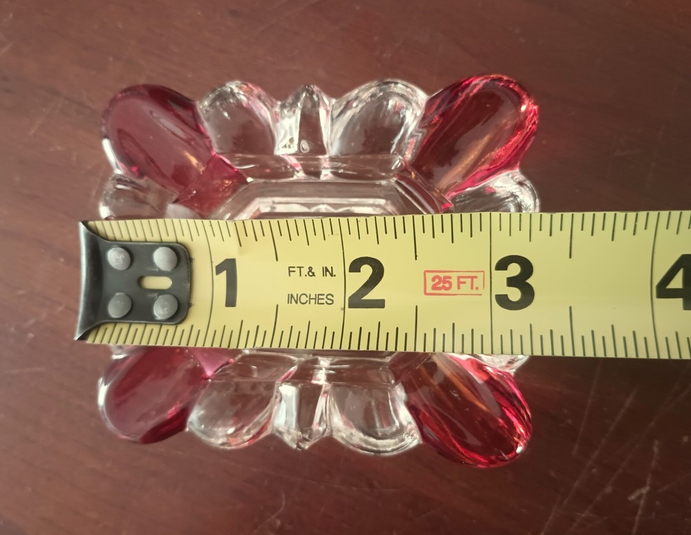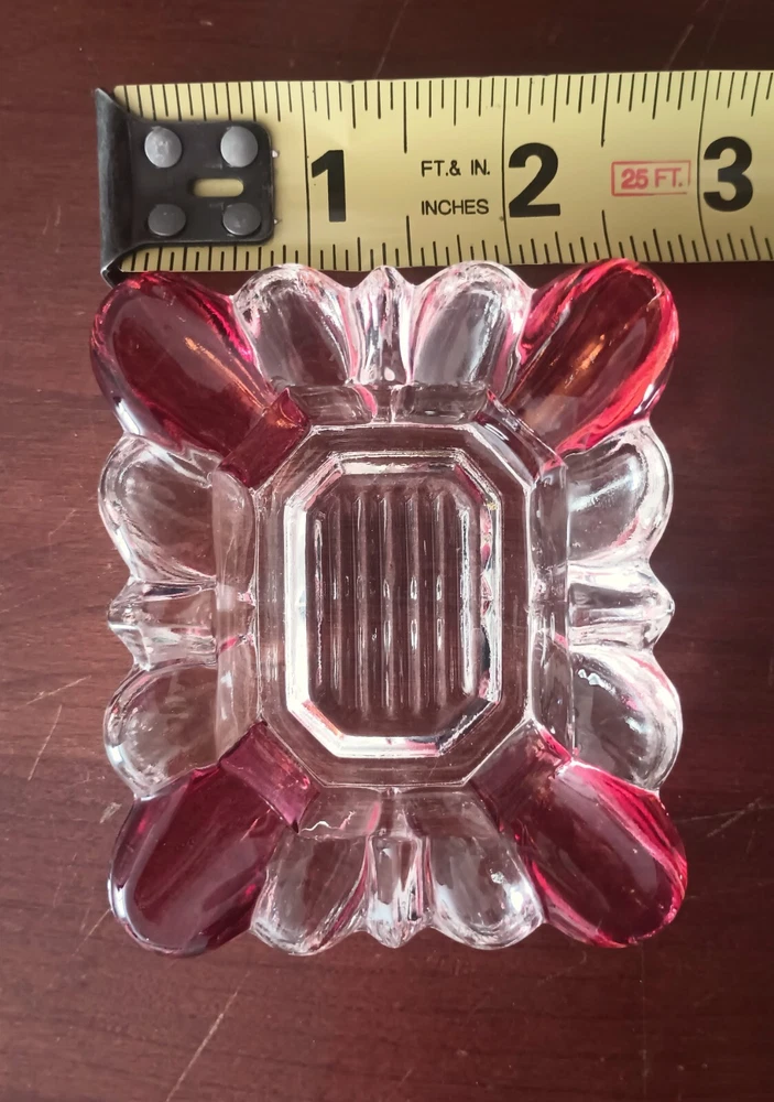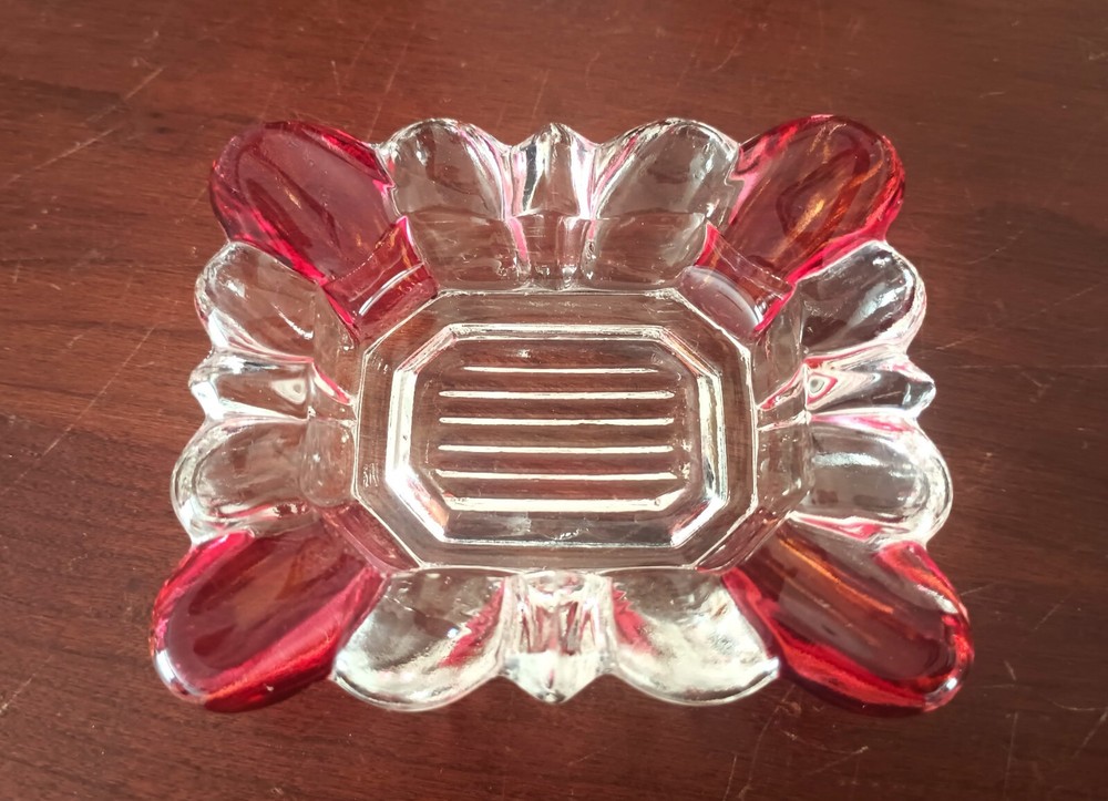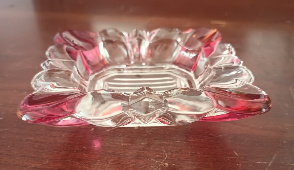 Vintage Westmoreland Ruby Red & Clear Flashed Glass Ashtray / Trinket Dish / Coin Dish. Color is clear with red lobes at each corner. Approximate Dimensions: 3.25" L x 2.25" W x 0.75" H. Pre-owned, but i n excellent condition--no discernable chips or cracks. Pictures are of actual item(s). Payment through eBay ONLY. Ships to U.S. ONLY . Item will be securely packaged in Bubble wrap / Styrofoam / Air Bladders / etc. Please pay within 3 days . Item will ship within 1-2 business days upon receipt of payment. Experience the elegance of Art Deco with this vintage Westmoreland Ruby Red & Clear Flashed Glass Ashtray. The exquisite rectangle shape and .75" height make it an eye-catching piece for any collector or enthusiast of decorative glassware. Its dimensions of 3.25" in length and 2.25" in width provide a perfect size for displaying as a trinket dish or ashtray. Crafted from high-quality glass, this original piece showcases a stunning clear color with the distinctive ruby red flashing, epitomizing the charm of a bygone era. The ashtray's brand, Westmoreland, is synonymous with timeless beauty and craftsmanship. Whether used for its intended purpose or as a decorative accent, this ashtray adds a touch of sophistication to any setting.