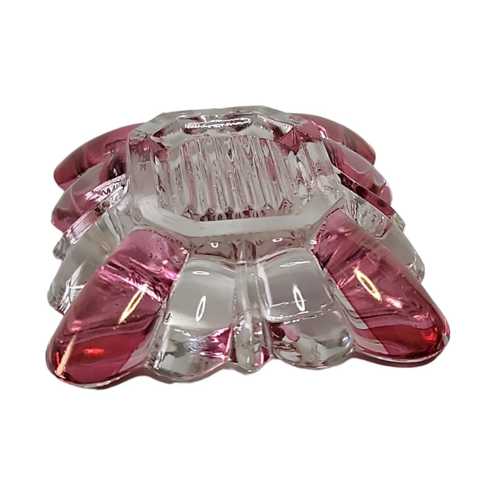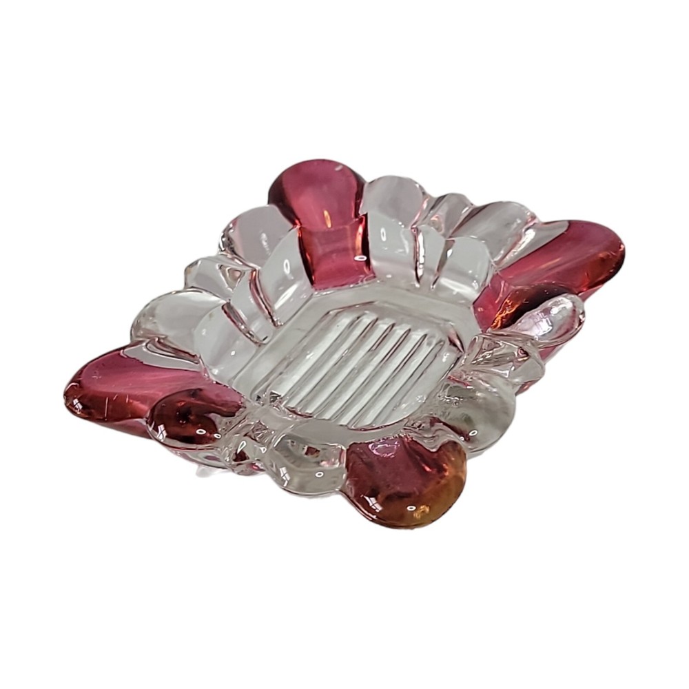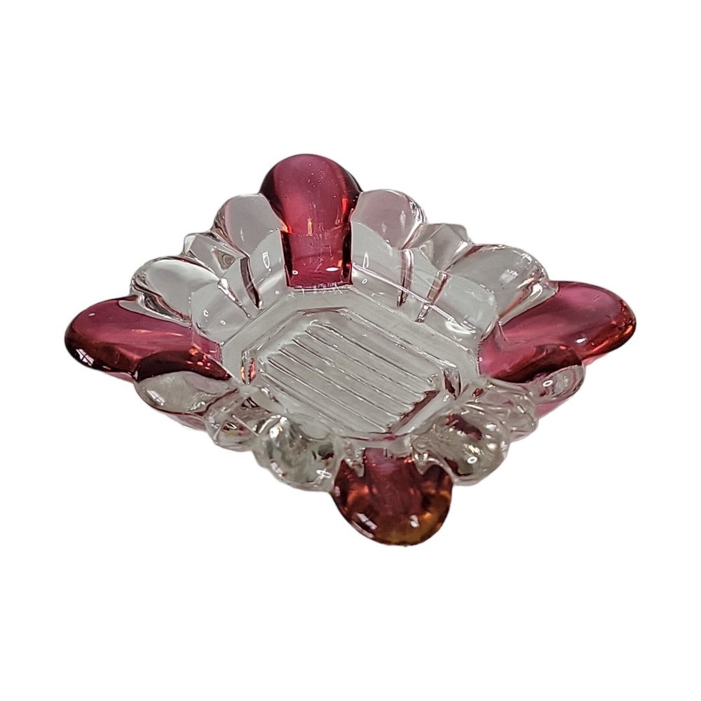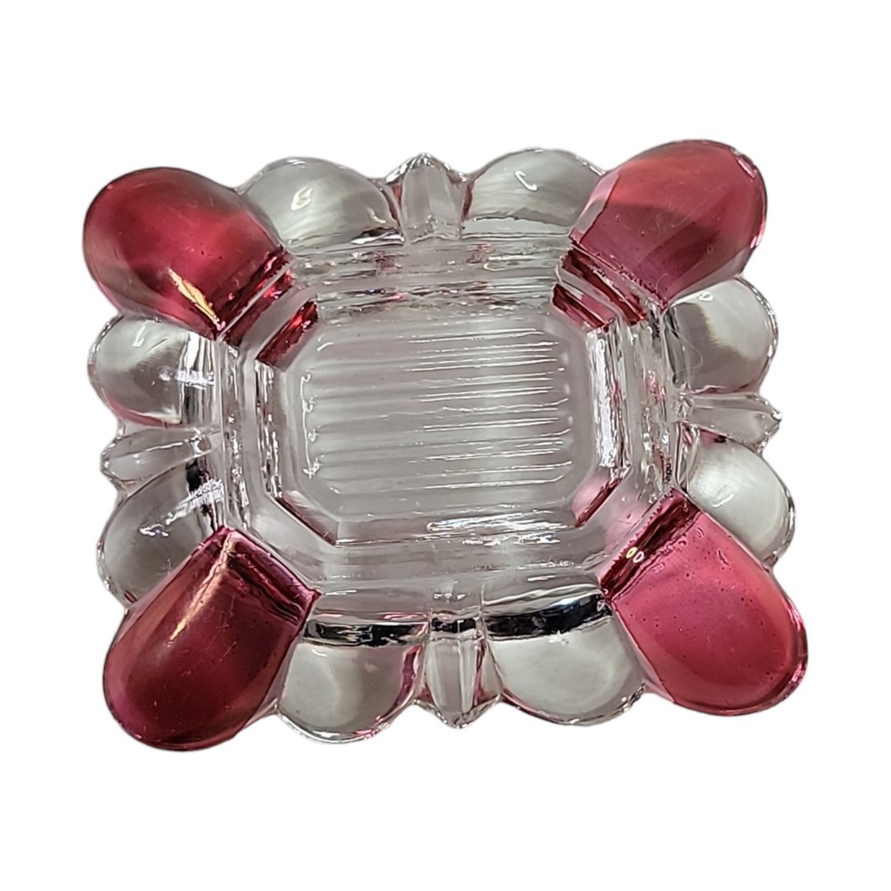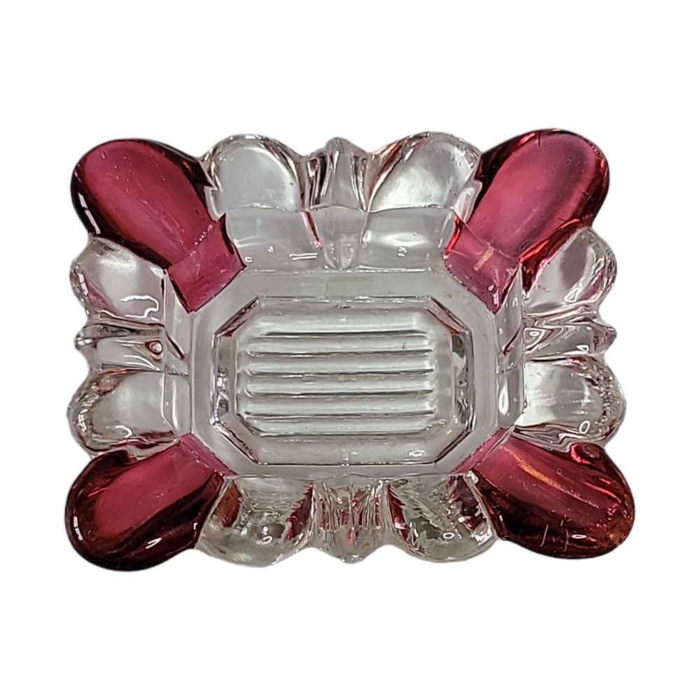 This vintage ashtray from Westmoreland features elegant clear glass with ruby flashed accents. Measuring 3¼" x 2¾" x ¾", it is perfect for holding cigarettes and adds a touch of sophistication to any room. The brand and manufacturer are both Westmoreland, and it is an antique original with production style of elegant glass.