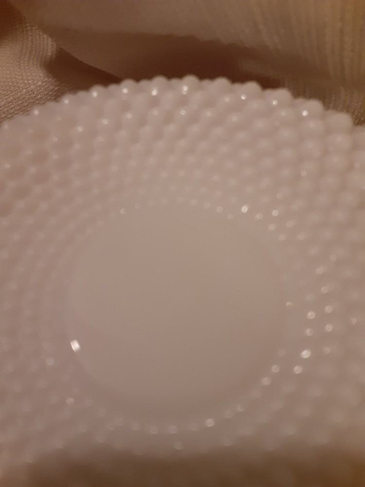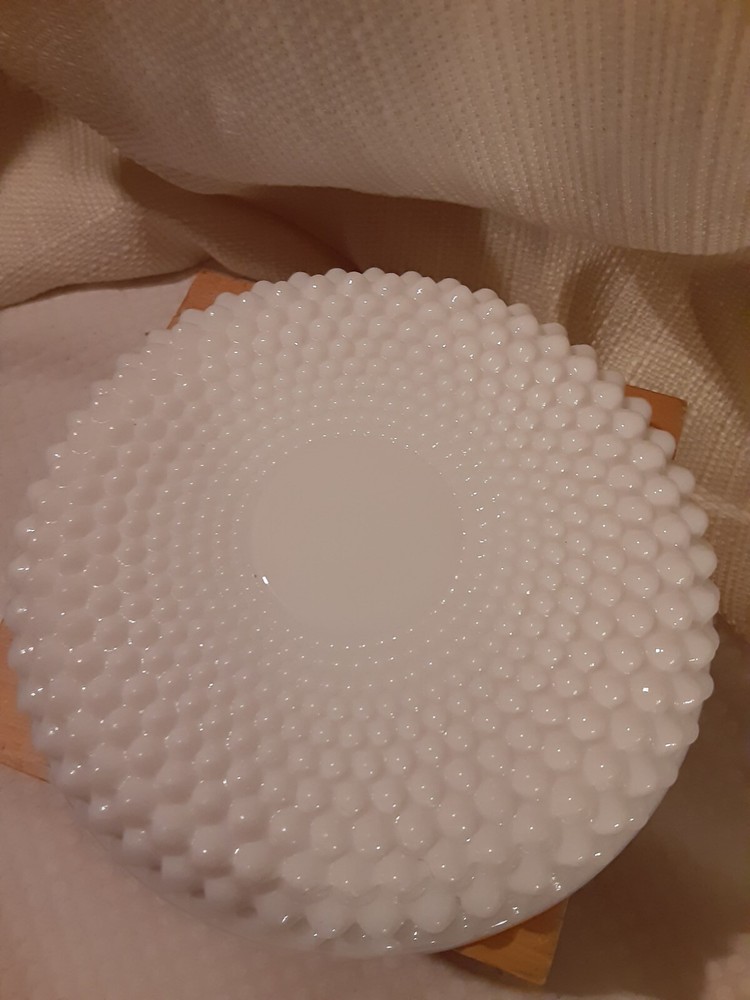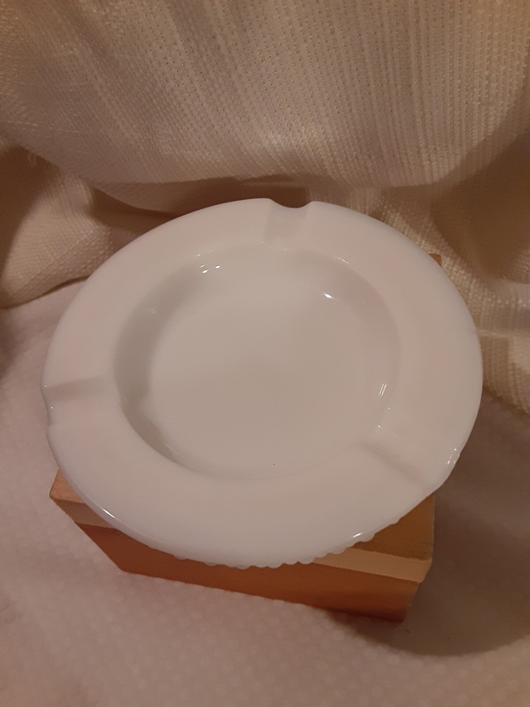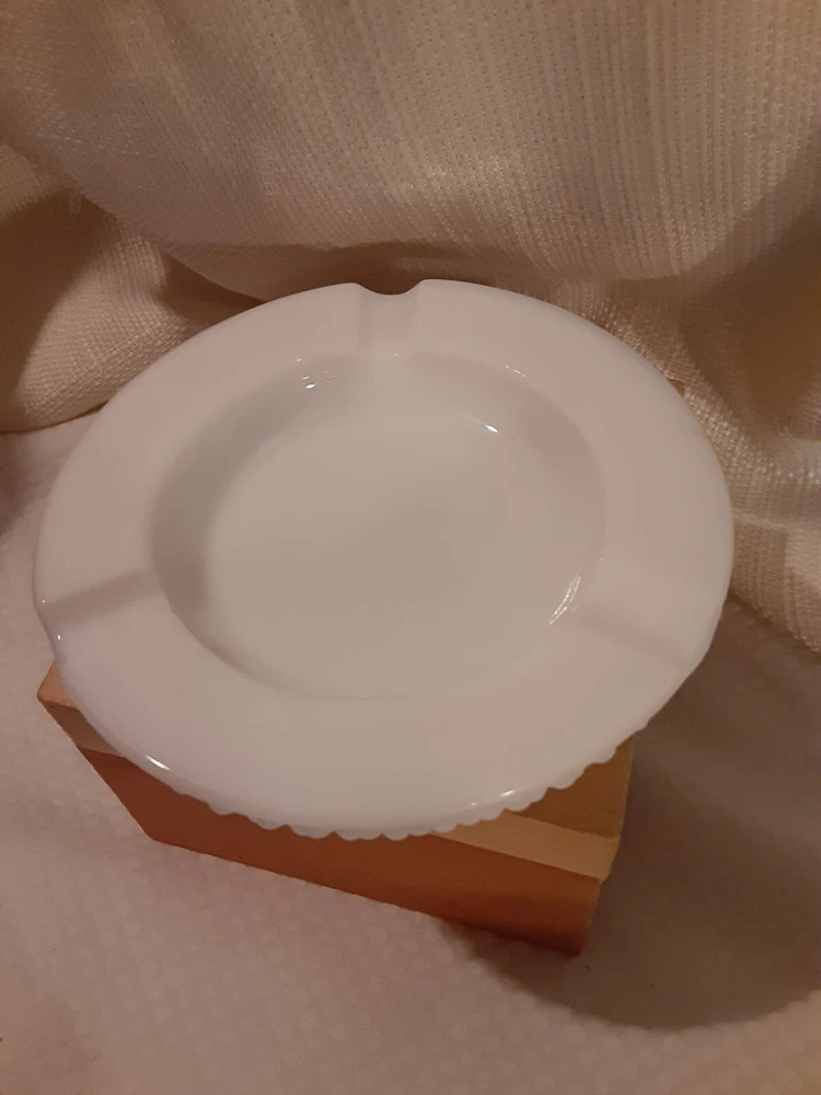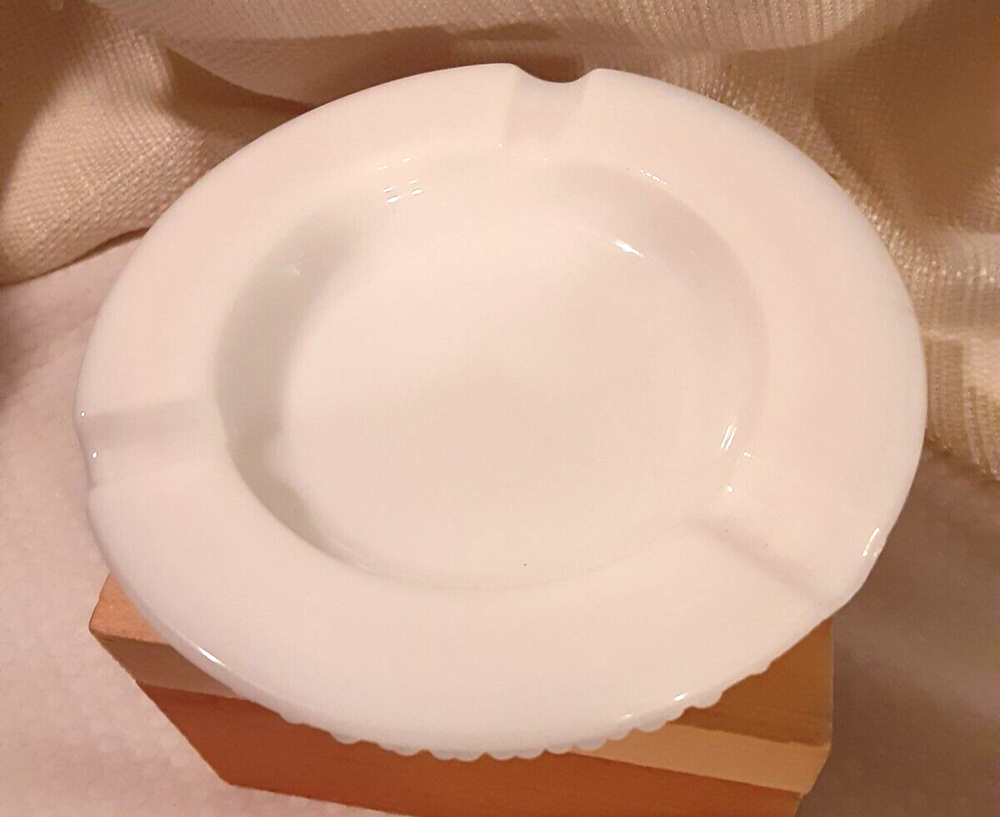 Vintage Westmoreland White Hobnail Style Milkglass Ashtray Small - Pre-owned, but in very good condition and branded on bottom with a "W". (See all pictures for added details of this vintage ashtray.) Measures 4 1/2" round at top and 1" high. No cracks, chips, etc. 3 cigarette sections. Very nice vintage ashtray! Inv. # XXX125