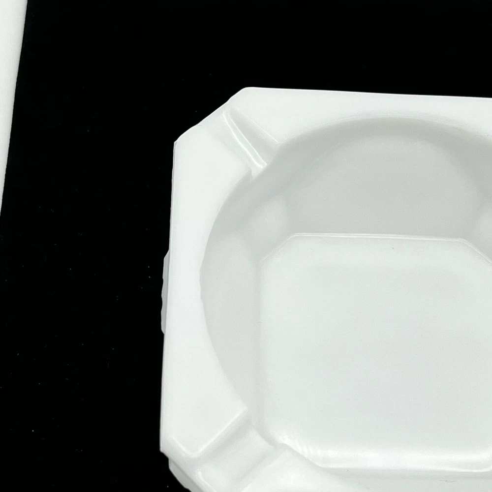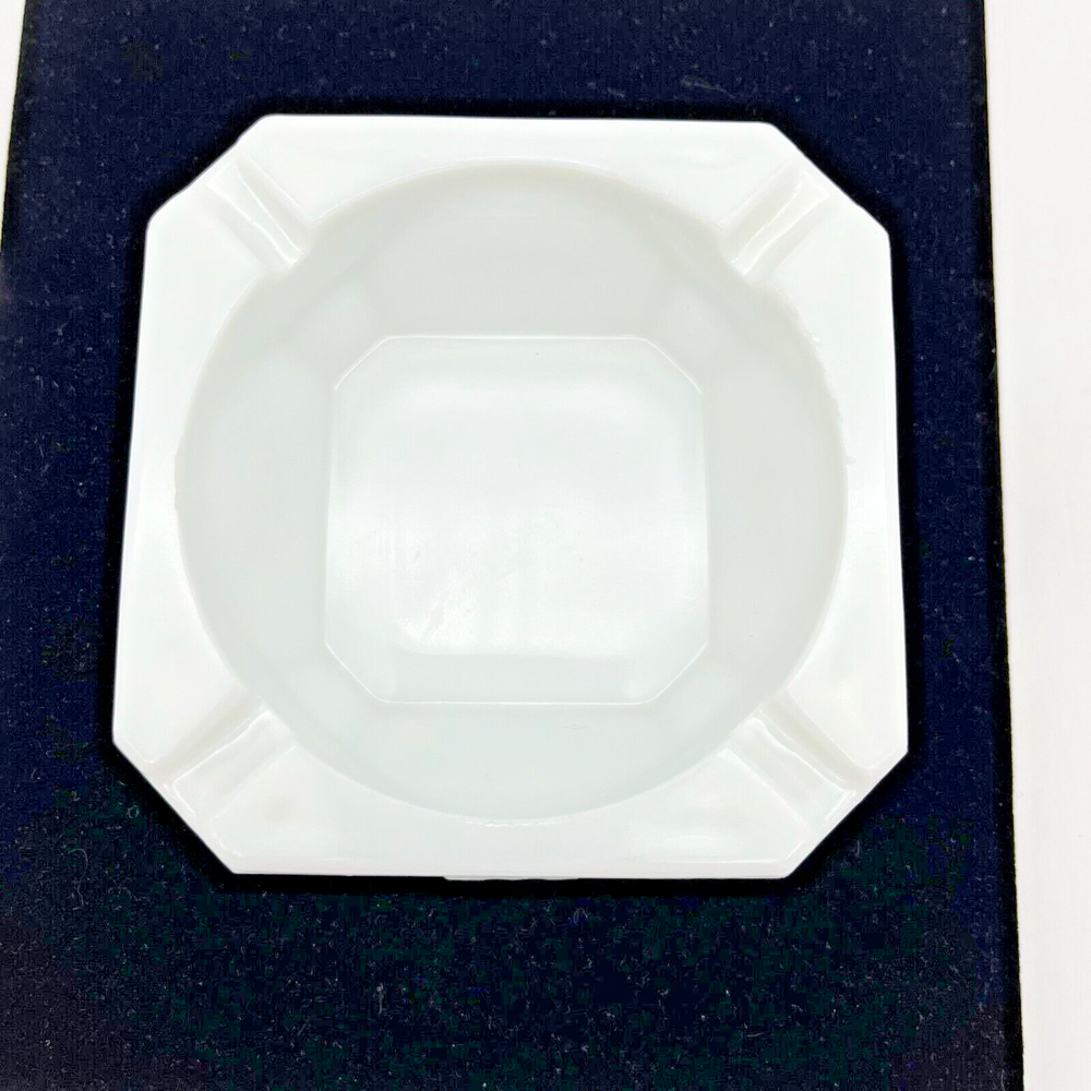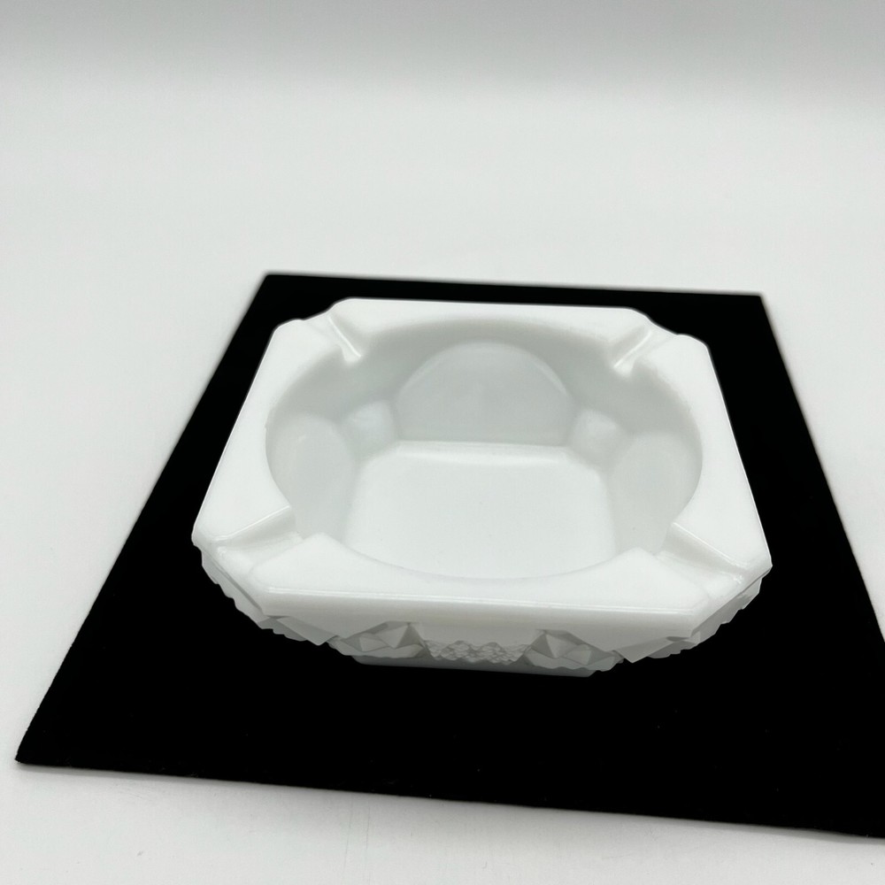 This vintage Westmoreland ashtray is a beautiful addition to any collection. The white milk glass is adorned with an Old Quilt design, making it a unique and decorative piece. Suitable for cigarette or cigar use, this Westmoreland ashtray would be a great gift for any smoker or collector. Its production style is milk glass, adding to its vintage charm. The ashtray is made of high-quality glass, ensuring its durability and longevity. This ashtray measures approximately 4" by 4" by 1.5" high. Pre-owned in good condition, but there is some chipping along the inside top edge from use. Please check out the photos.