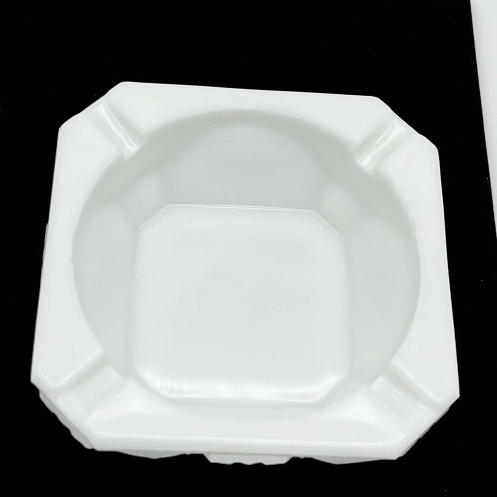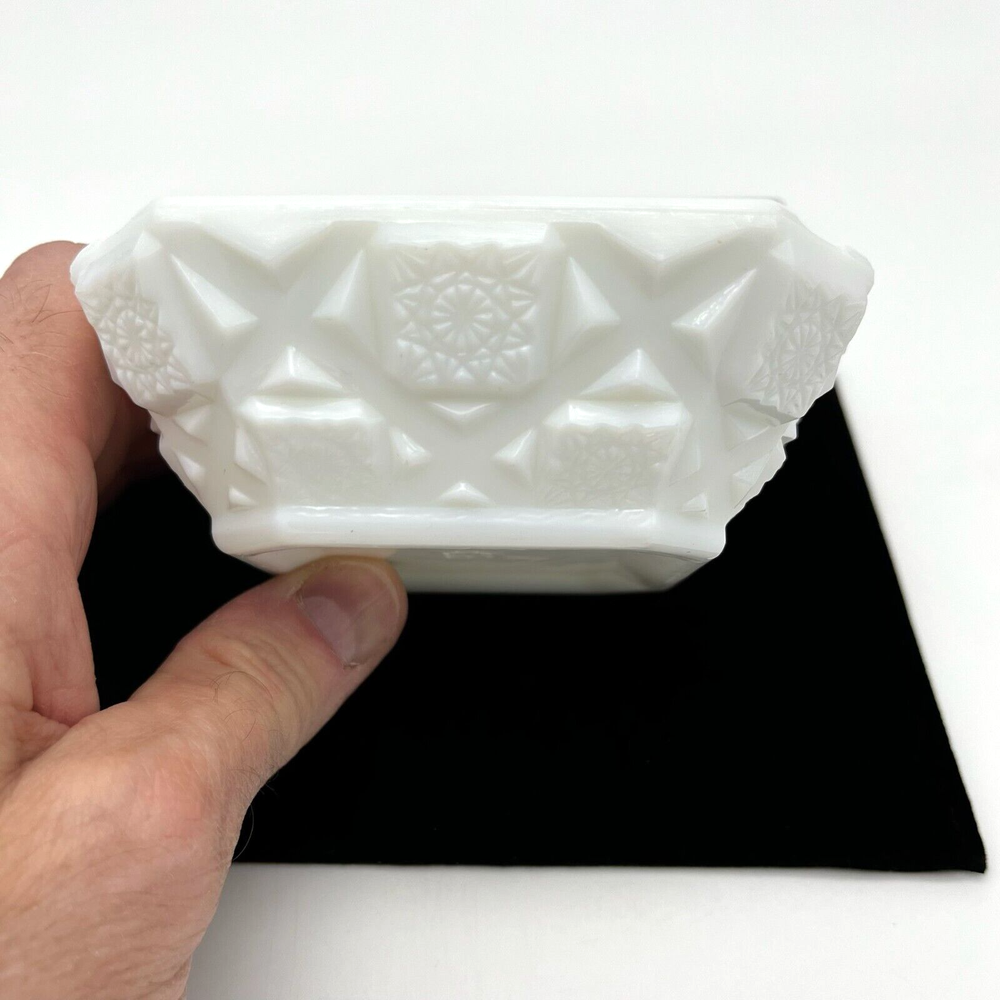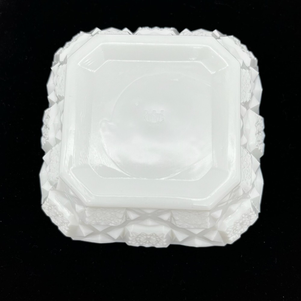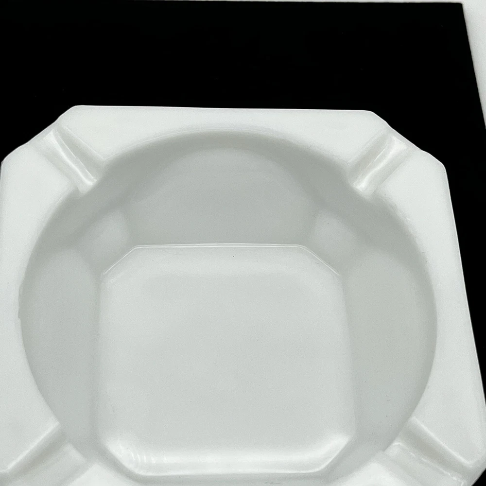This vintage Westmoreland ashtray is a beautiful addition to any collection. The white milk glass is adorned with an Old Quilt design, making it a unique and decorative piece. Suitable for cigarette or cigar use, this Westmoreland ashtray would be a great gift for any smoker or collector. Its production style is milk glass, adding to its vintage charm. The ashtray is made of high-quality glass, ensuring its durability and longevity. This ashtray measures approximately 4" by 4" by 1.5" high. Pre-owned in good condition, but there is some chipping along the inside top edge from use. Please check out the photos.