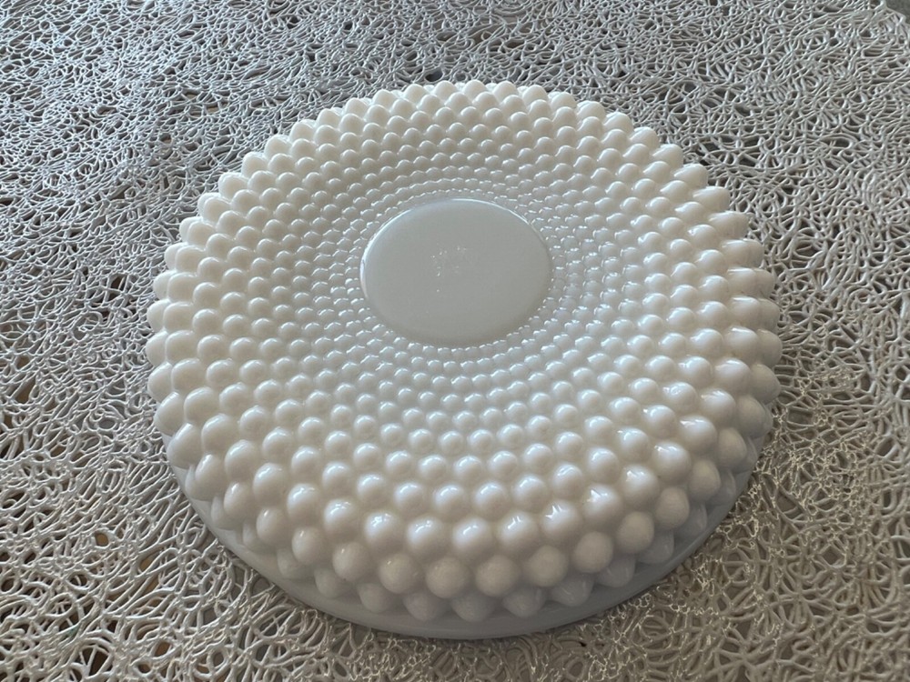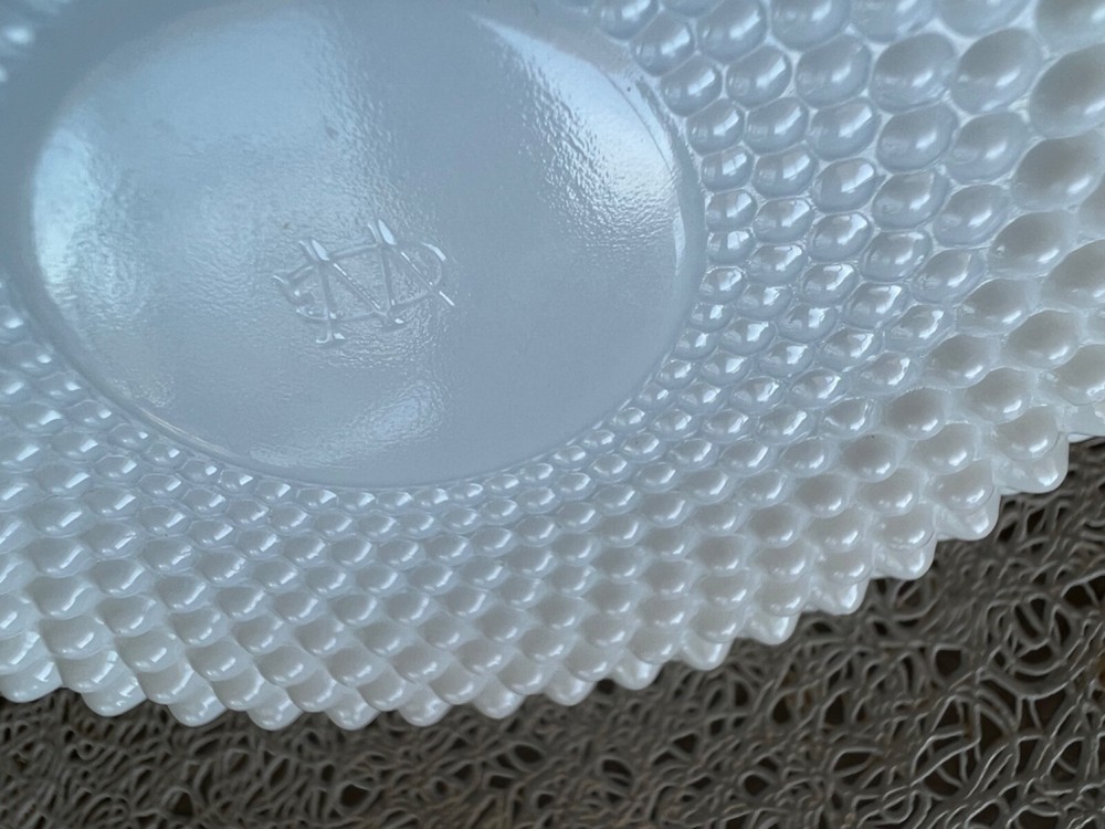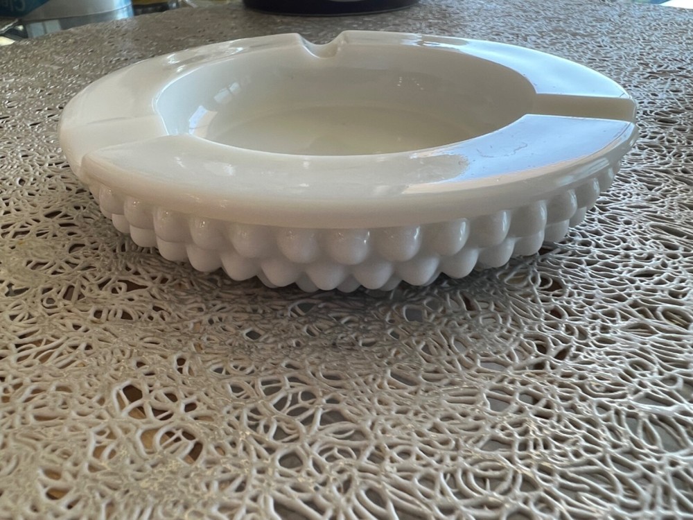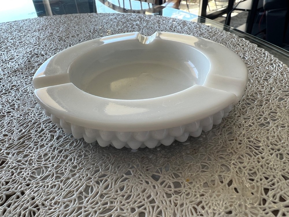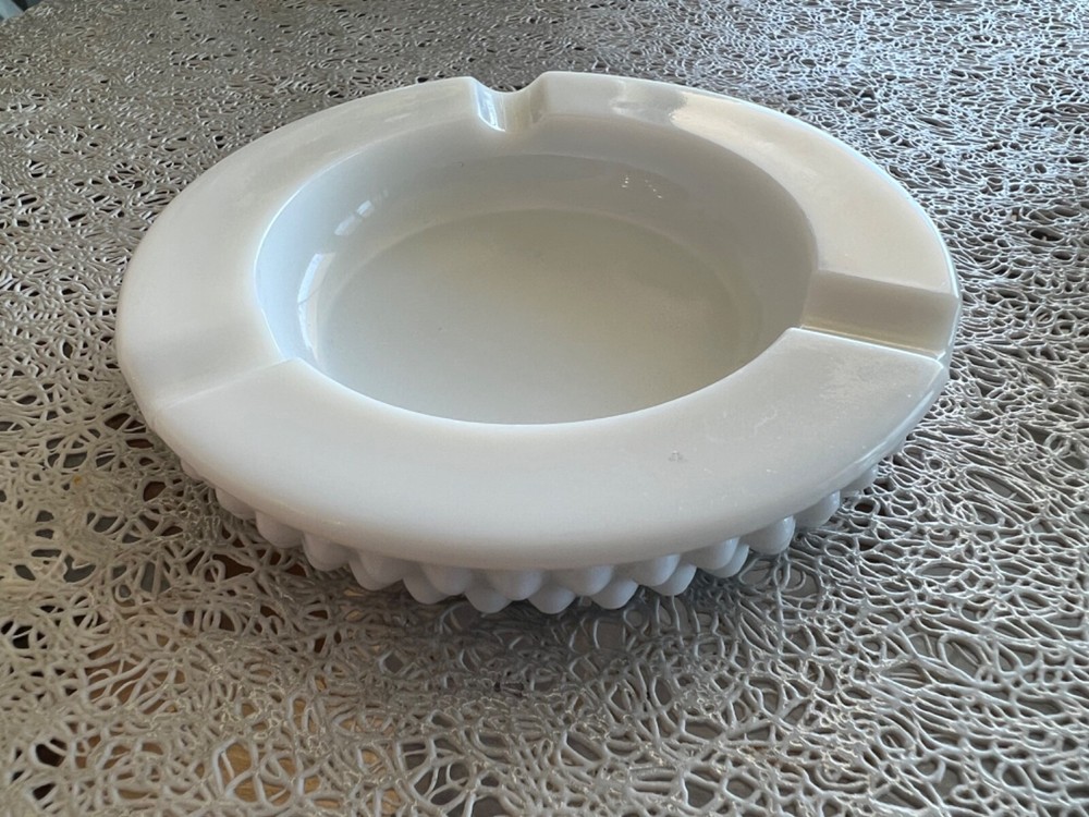 This vintage ashtray from Westmoreland features a classic mid-century modern style with a round shape and white milk glass material. The hobnail design adds an elegant touch to this piece, perfect for collectors or those looking to add a unique item to their decor. It is stamped with the Westmoreland brand on the bottom. Made in the United States this ashtray is a great addition to any collection.