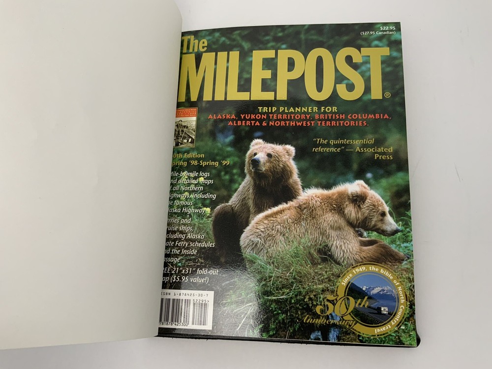 Vintage 50th Anniversary The Milepost Travel Guide. Alaska, Western Canada Reference Book. Black Leather Bound Collectors Edition. Measures approximately 11.25” tall and 8.75” wide. Very good conditio...