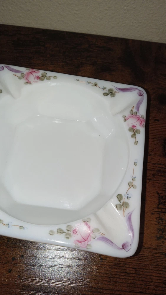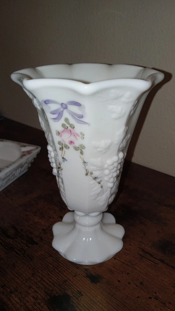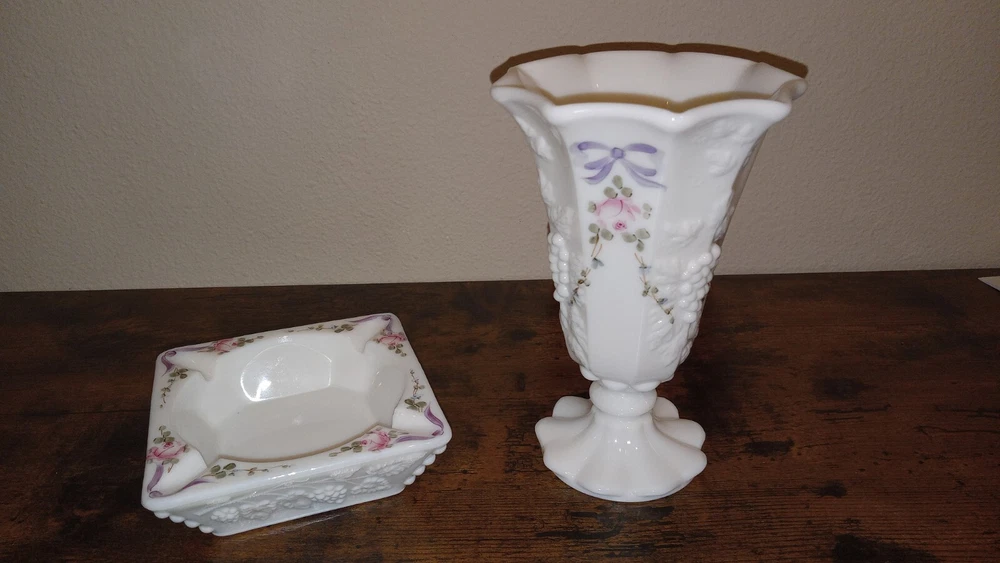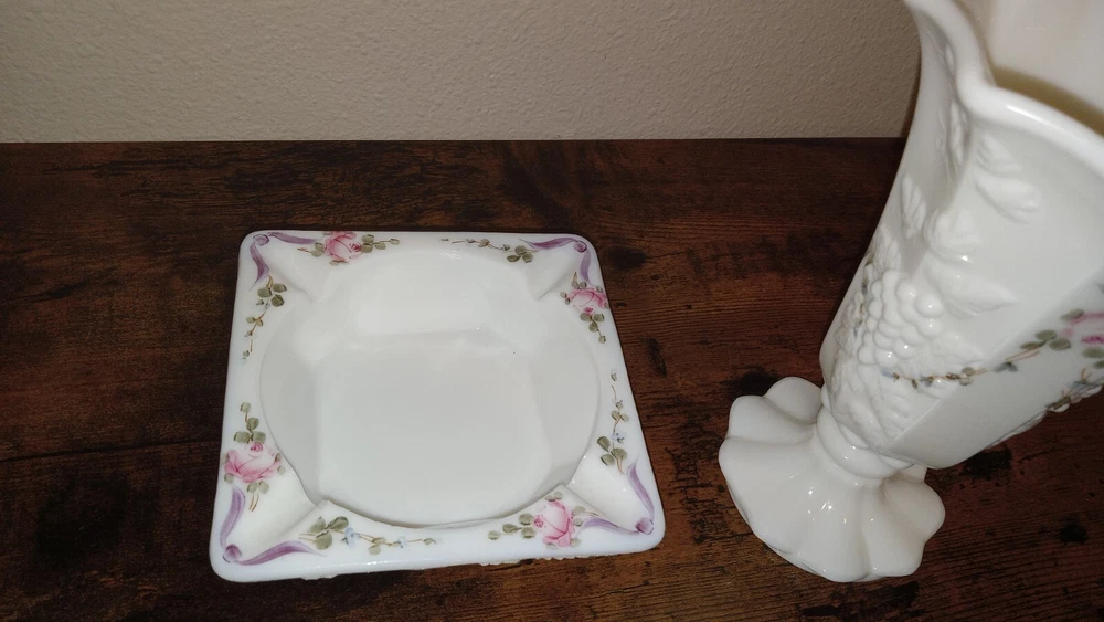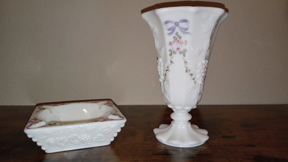 WESTMORLAND MILK GLASS GRAPES WITH HAND-PAINTED RIBBON & ROSES VASE and ASHTRAY. Beautiful set Vase is mint no cracks or chips Ashtray has two blemish chips that are almost not visible (see pics)