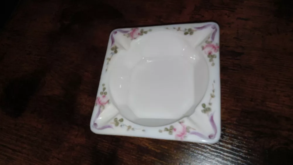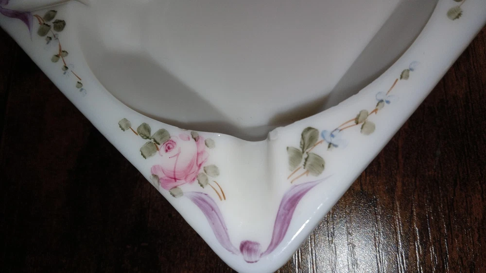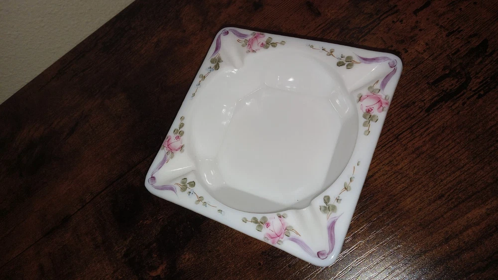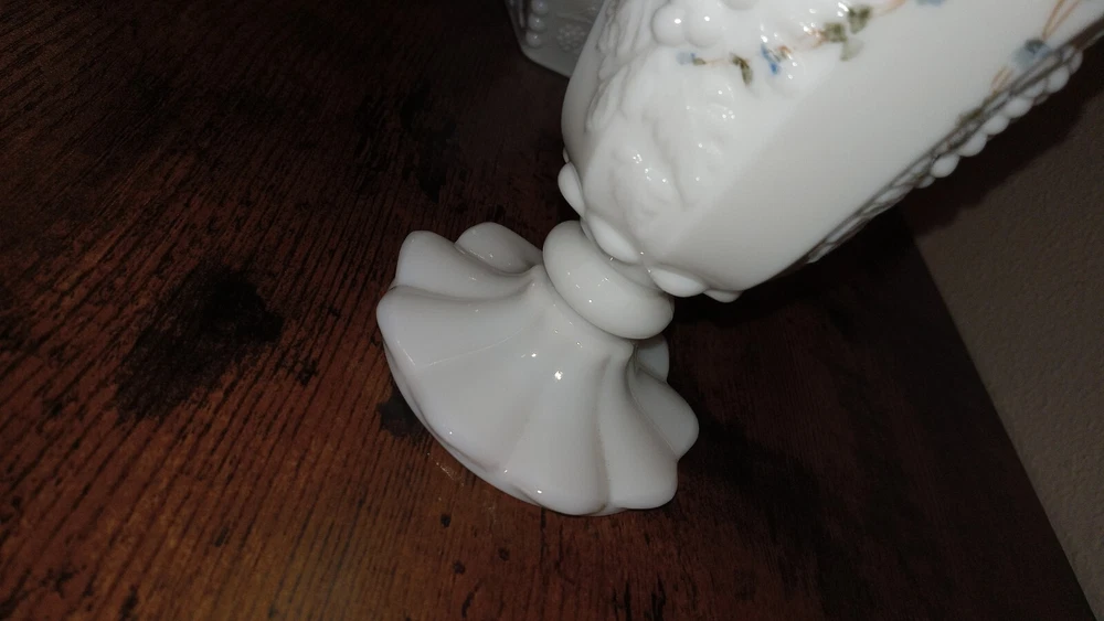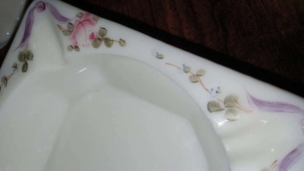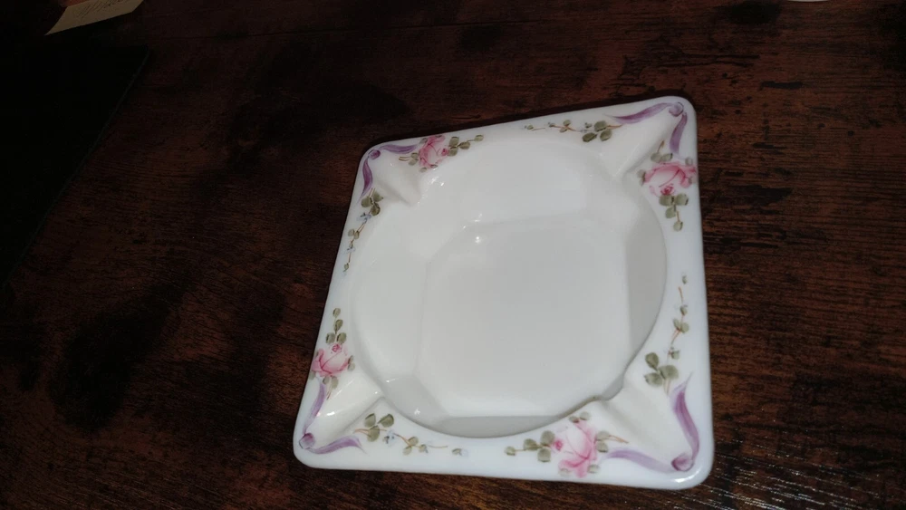 WESTMORLAND MILK GLASS GRAPES WITH HAND-PAINTED RIBBON & ROSES VASE and ASHTRAY. Beautiful set Vase is mint no cracks or chips Ashtray has two blemish chips that are almost not visible (see pics)